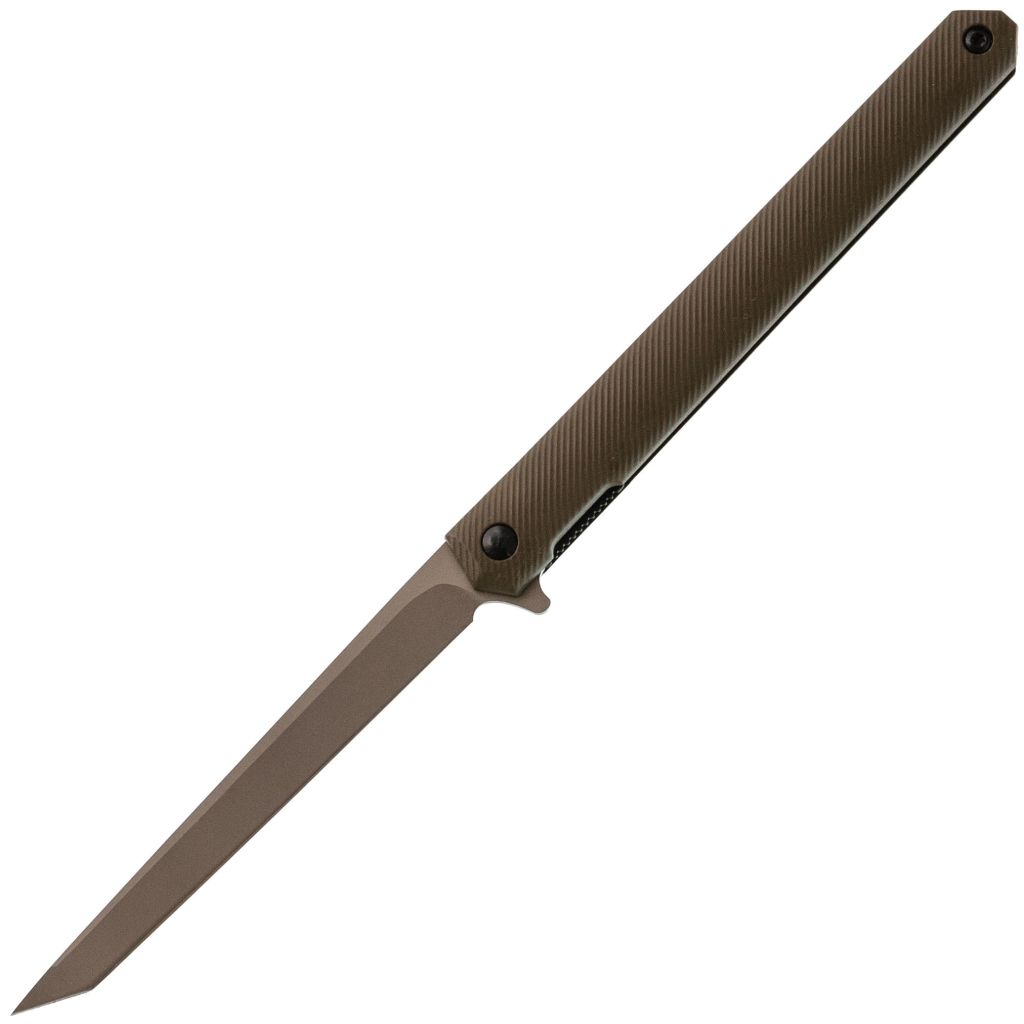 Клинок выполнен в профиле Tanto с прямыми спусками - геометрия, которая хорошо подходит для аккуратной работы по плотным материалам и позволяет уверенно контролировать рез. Отдельный плюс именно этой модели - крайне узкий клинок: он легко пролезает в щели, удобно поддевает край упаковки и даёт ощущение "скальпельной" точности там, где широкий клинок мешает. Открытие - за флиппер: быстро, привычно и удобно одной рукой.