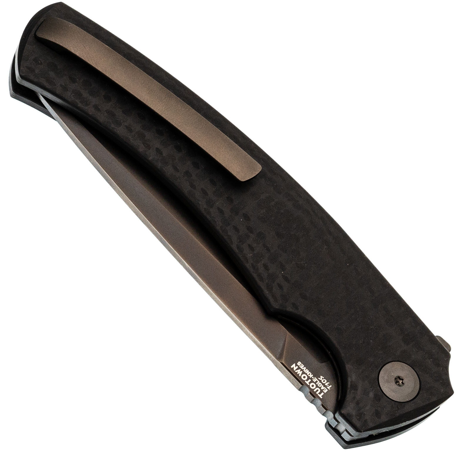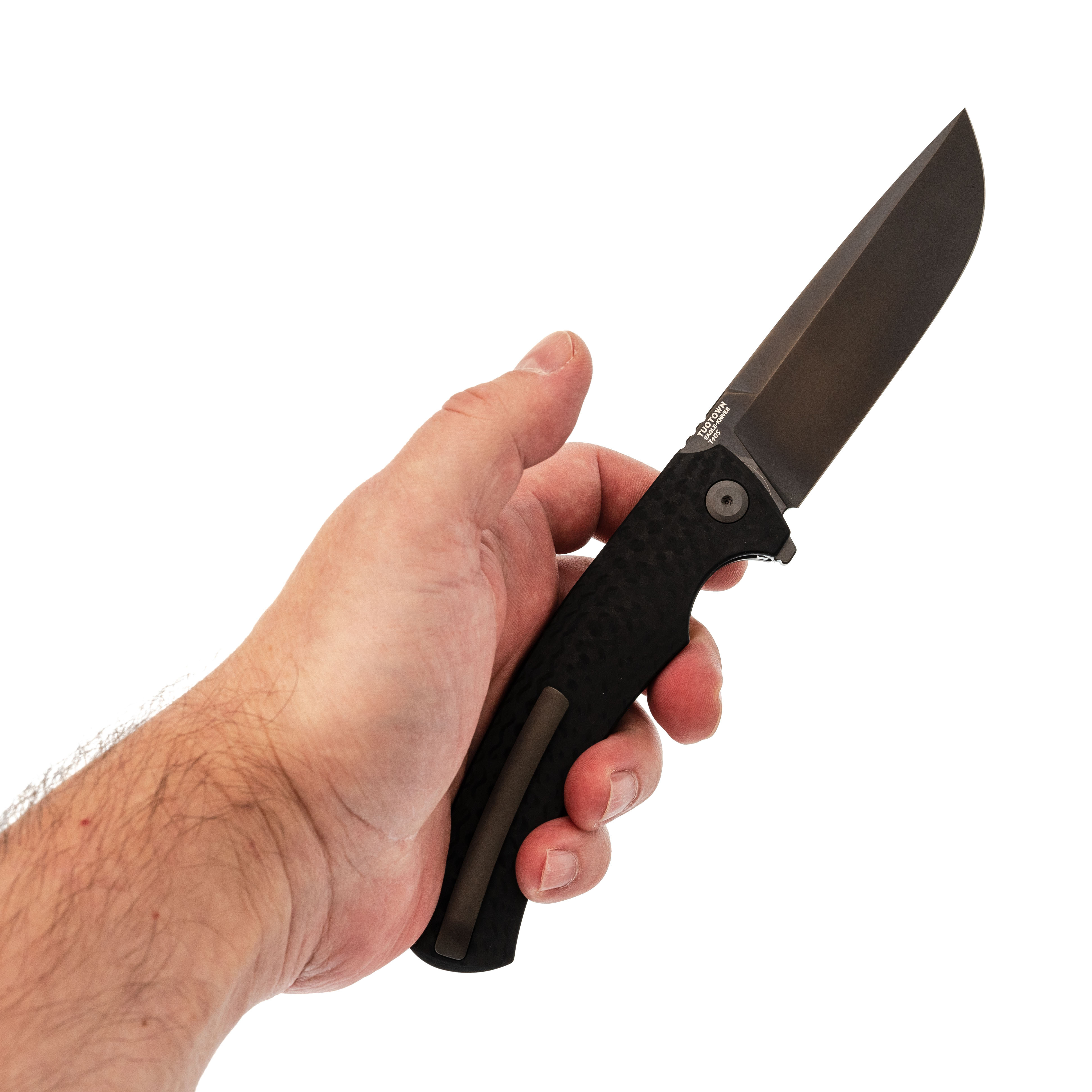 Рукоять слегка изогнута, с подпальцевой выемкой - нож держится уверенно и предсказуемо. Плавник в раскрытом виде работает как упор для пальцев, добавляя спокойствия в работе. За фиксацию отвечает Liner-Lock, есть темлячное отверстие и удобная титановая клипса.