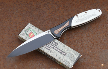 Здесь сочетаются практичность и узнаваемый образ. Чёрное PVD-покрытие защищает клинок и делает внешний вид спокойным. На рукояти - корюшка, вид на Петербург и надпись «Корюшка идёт». Клинок открывается шпеньками, что удобно и привычно.