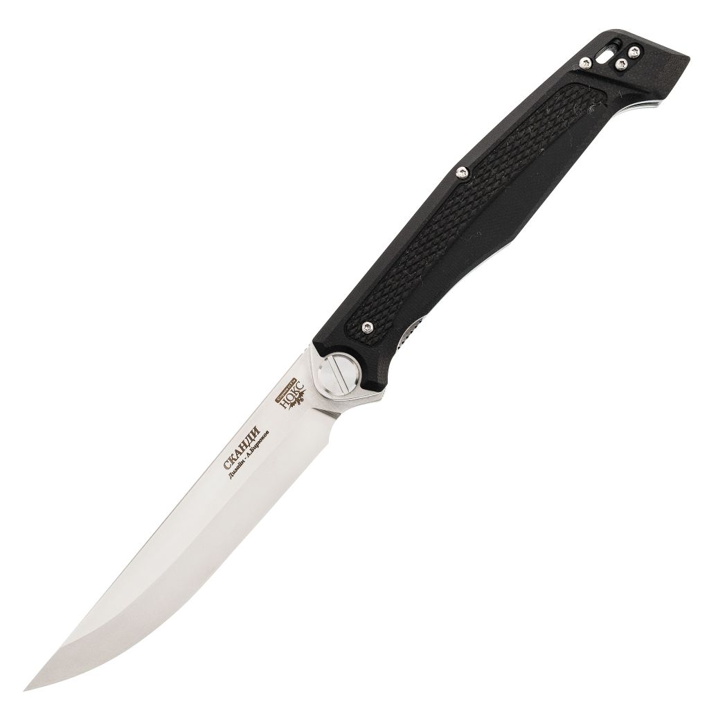 Нож Сканди от отечественного бренда Нокс имеет говорящее название - главной особенностью ножа являются его Сканди спуски, весьма редкое явления для складных ножей. Так же стоит отметить, что в ноже угадываются черты классического финского ножа, проверенного временем.Клинок выполнен из стали D2 - высокоуглеродистая инструментальная, характеризующаяся долгим удержанием заточки (дольше чем большинство сталей в бюджетном и даже среднем ценовом сегменте) и агрессивным резом. Эти свойства отлично дополняют Сканди спуски - главное преимущества которых это удобство работы с деревом и рыбой. Остальные задачи они уже будут выполнять хуже других видов спусков, но удовлетворительно. Клинок имеет длину 125 мм - отличная длина для туристического ножа, не слишком большой, не слишком маленький - в самый раз. В общем клинок делает этот нож отличным выбором в качестве туристического ножа.Рукоять ножа имеет ярко выраженный грибок, который позволяет комфортно использовать нож финским хватом и при работе он не выскользнет из руки вниз, что будет удобно при работе в перчатках. Накладки из стеклотекстолита G10 это отличный выбор для использования на природе, так как он прочен, не боятся воды и грязи а так же не выцветает. Так же стоит отметить агрессивную насечку на накладках, которая повышает цепкость в руке. Нож оснащён цельнофрезерованной клипсой для удобного ношения на кармане или ремне и большим темлячным отверстием, что очень важно для туристического ножа.