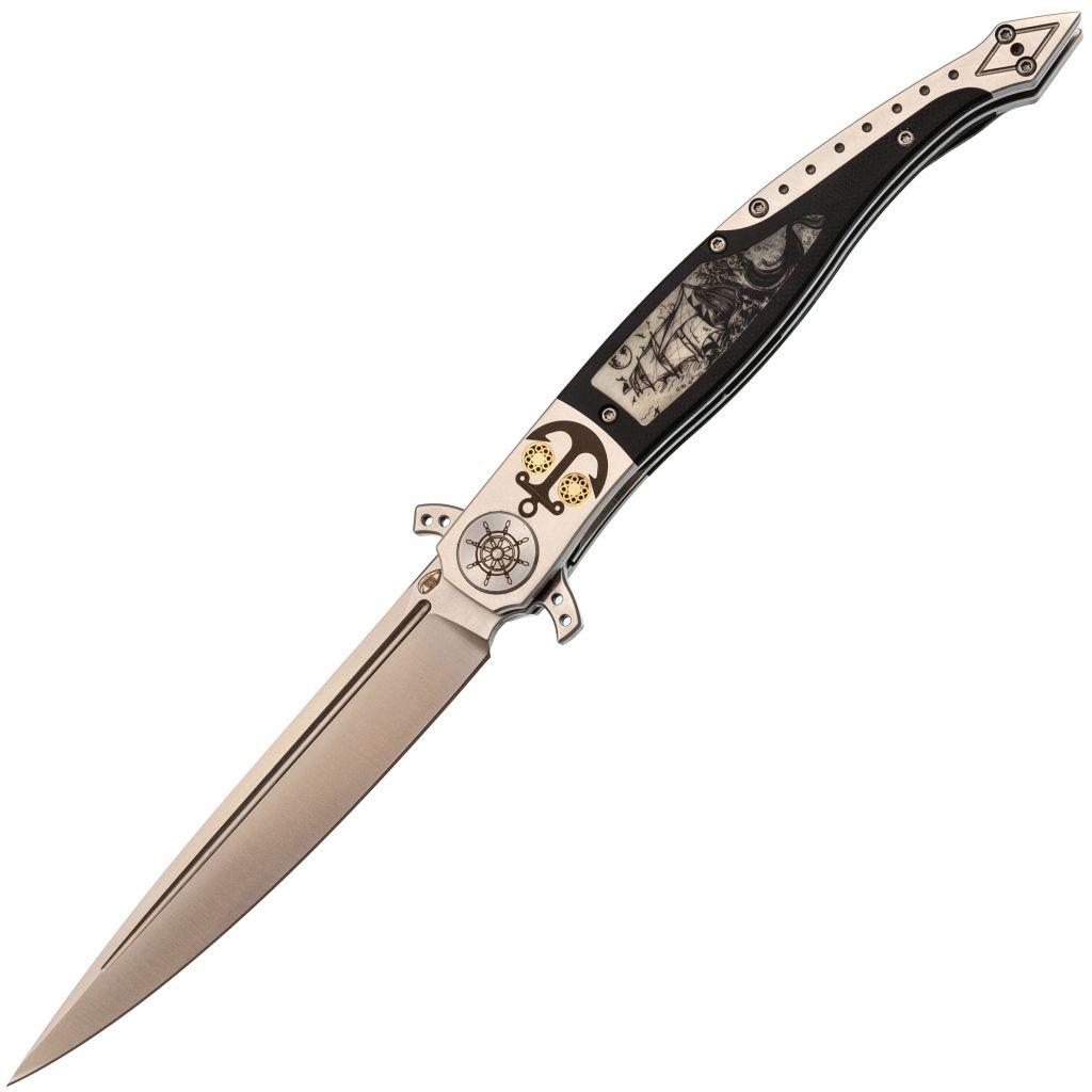 Длинная изогнутая геометрия удобно заполняет ладонь и разгружает пальцы при продолжительном использовании. На плоскостях - множественные рисунки с морской тематикой в паре с костяной вставкой. Получается выразительно, практично и готово к повседневному ношению.