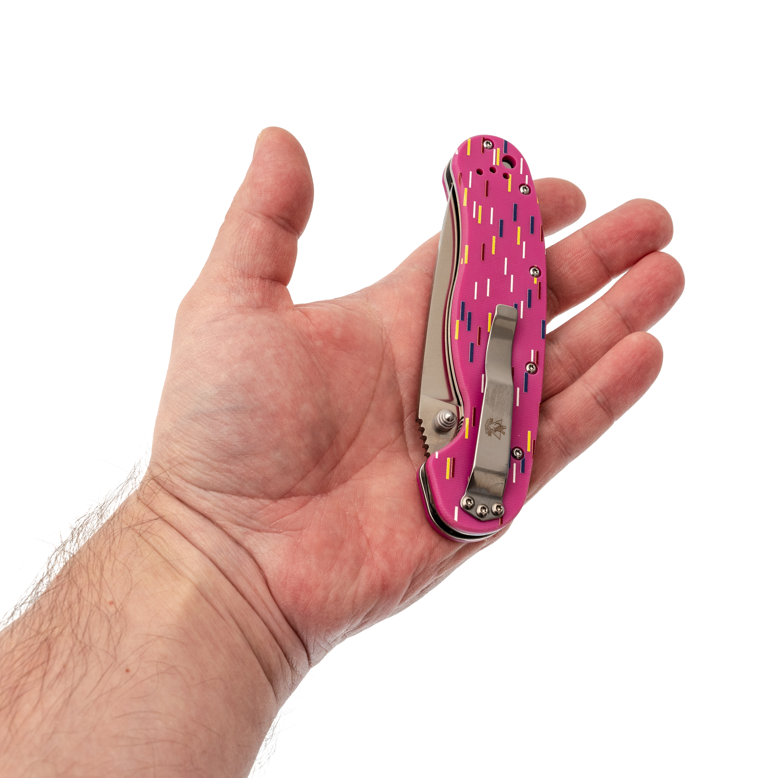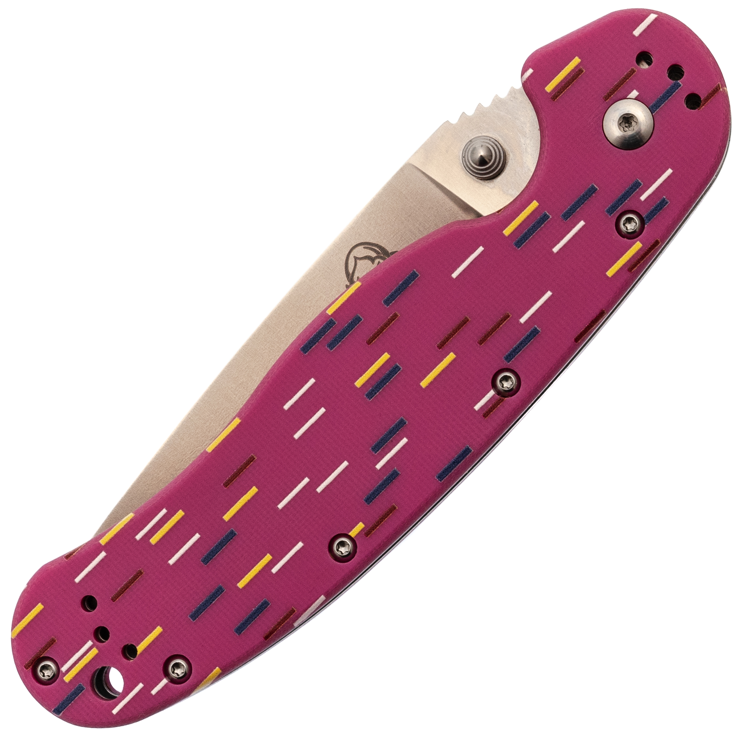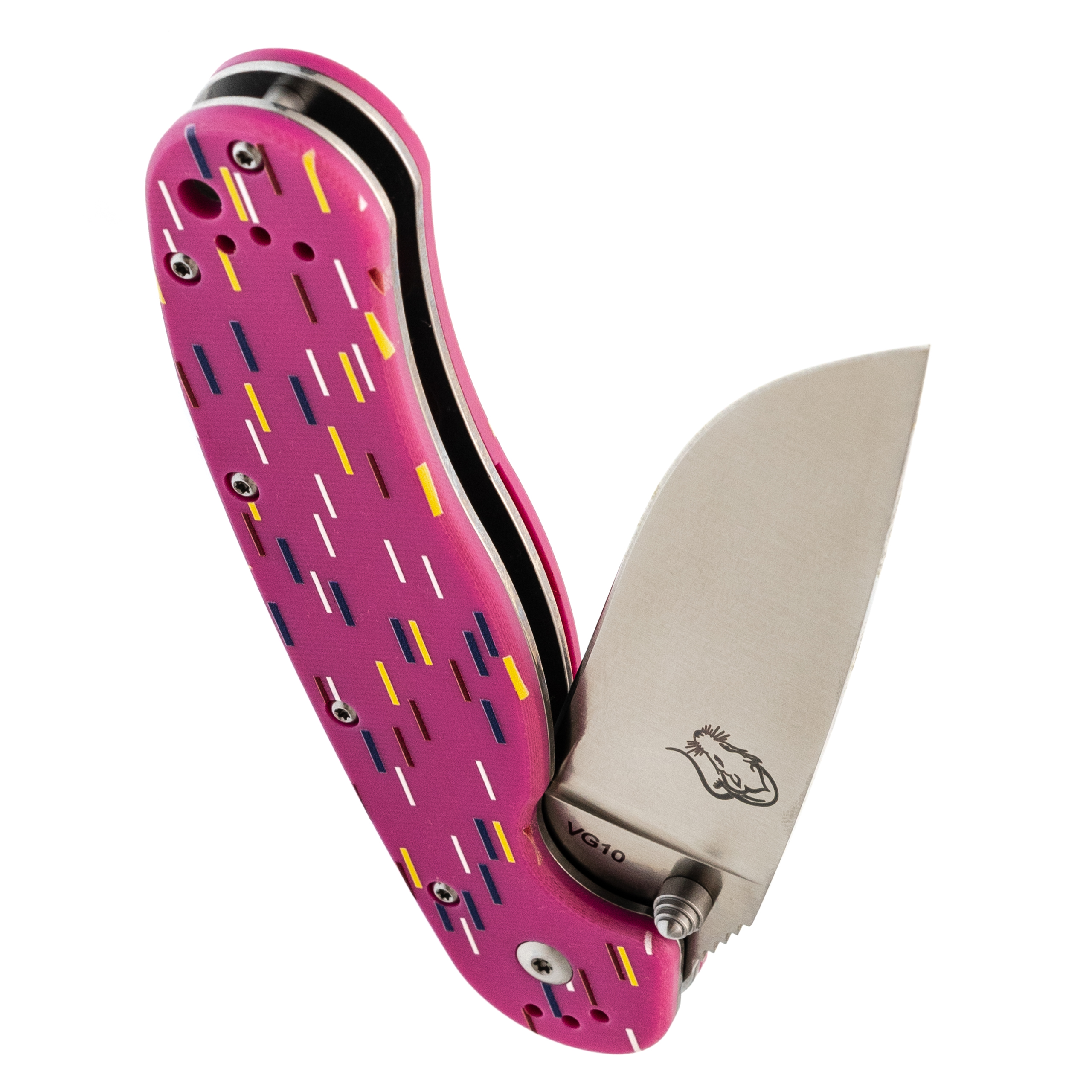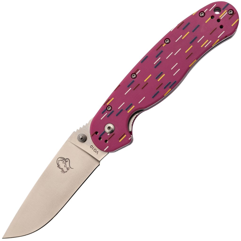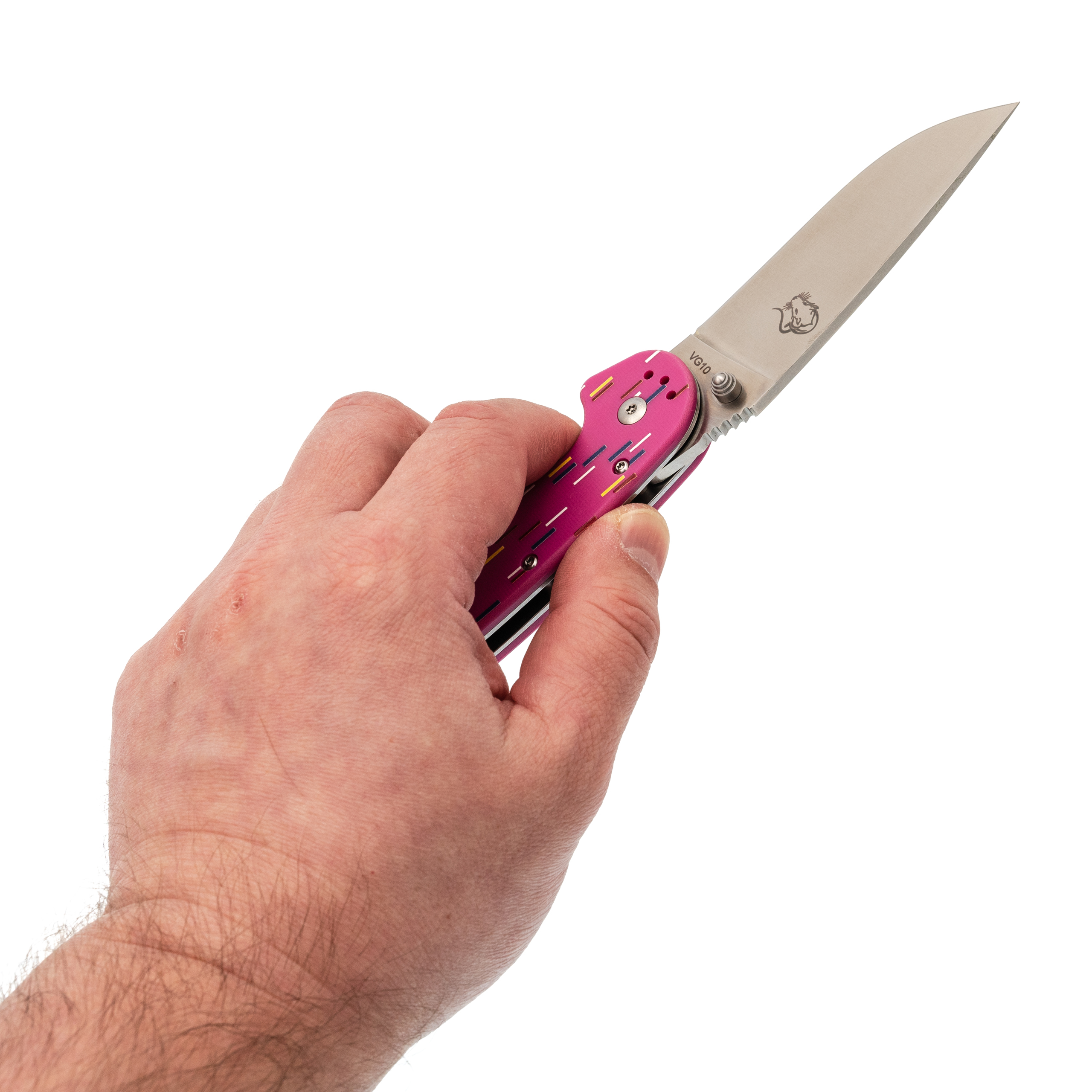 Рукоять из розового G10 стилизована под пончик с сахарной посыпкой. Вкрапления разных оттенков создают эффект кондитерского изделия, делая инструмент необычным и запоминающимся. Но за внешней лёгкостью скрывается серьёзная эргономика. Форма рукояти выгнута так, что она удобно ложится в ладонь, обеспечивая плотный хват. При этом конструкция позволяет брать нож разными хватами - хоть обычным, хоть с упором на указательный палец для точных работ. Темлячное отверстие позволяет повесить яркий шнурок, чтобы нож было проще найти в рюкзаке или чтобы украсить его на свой вкус.
