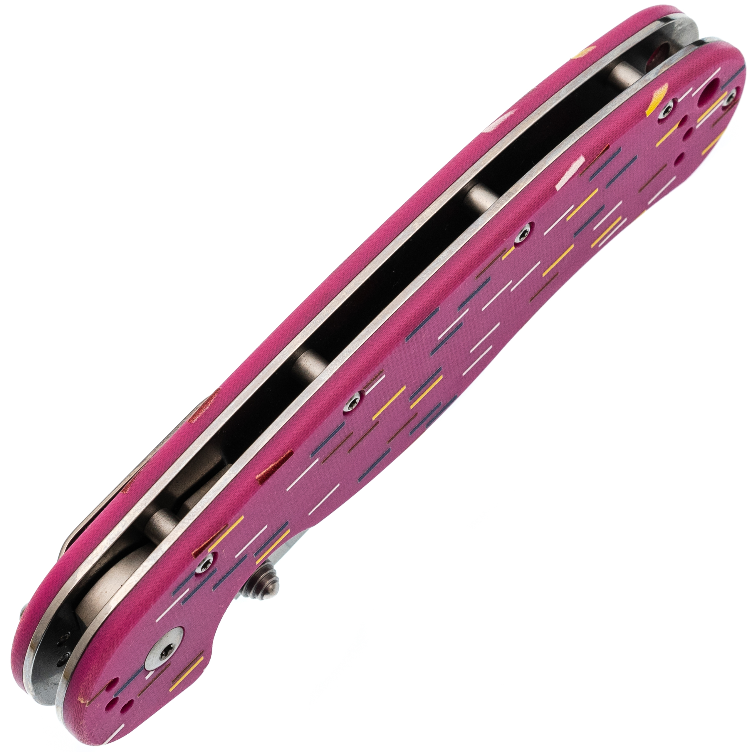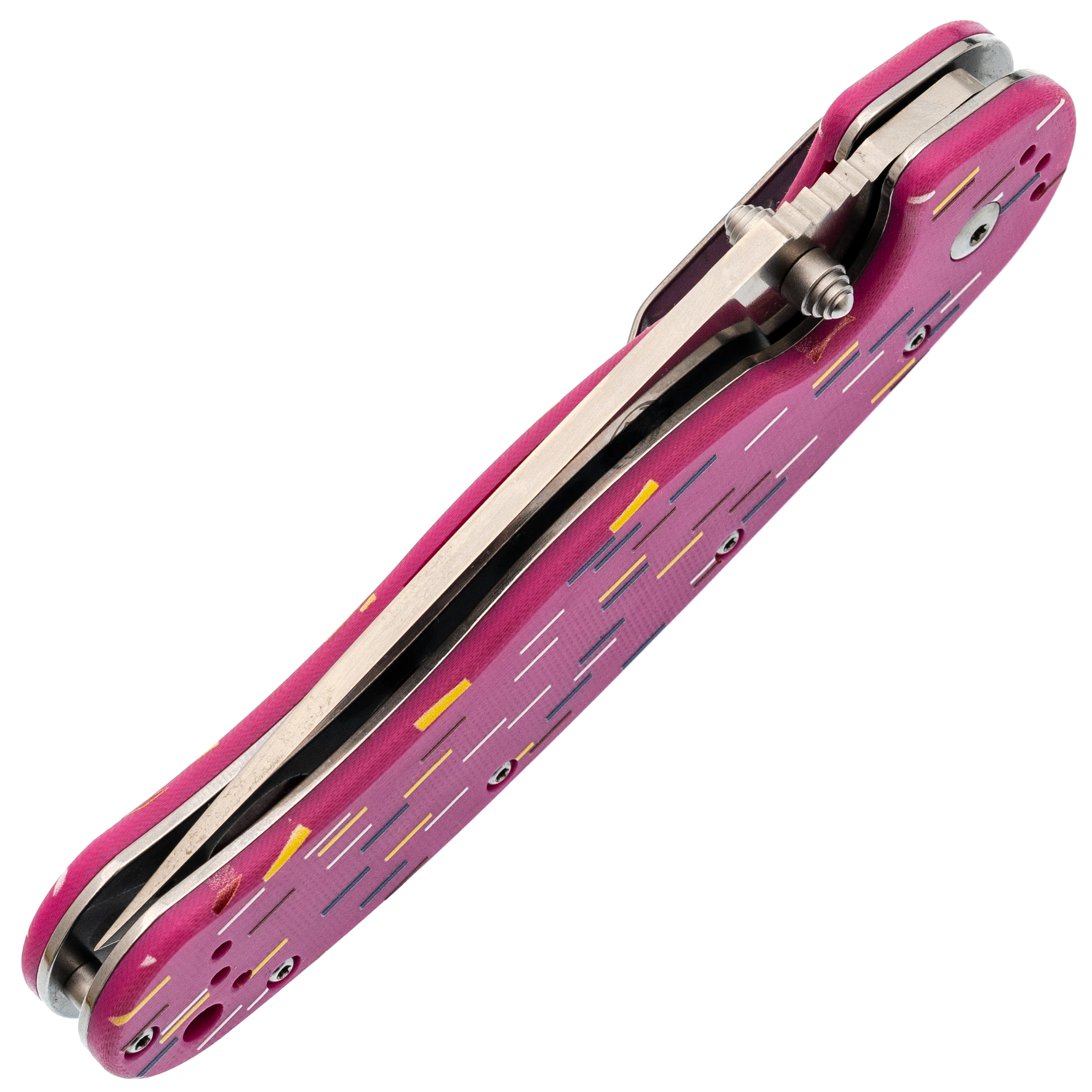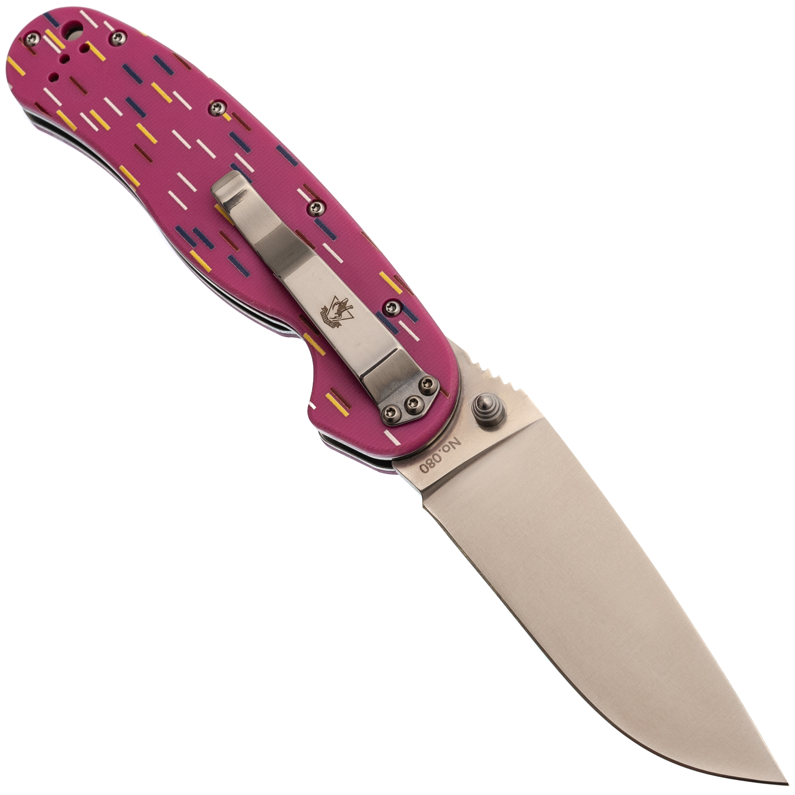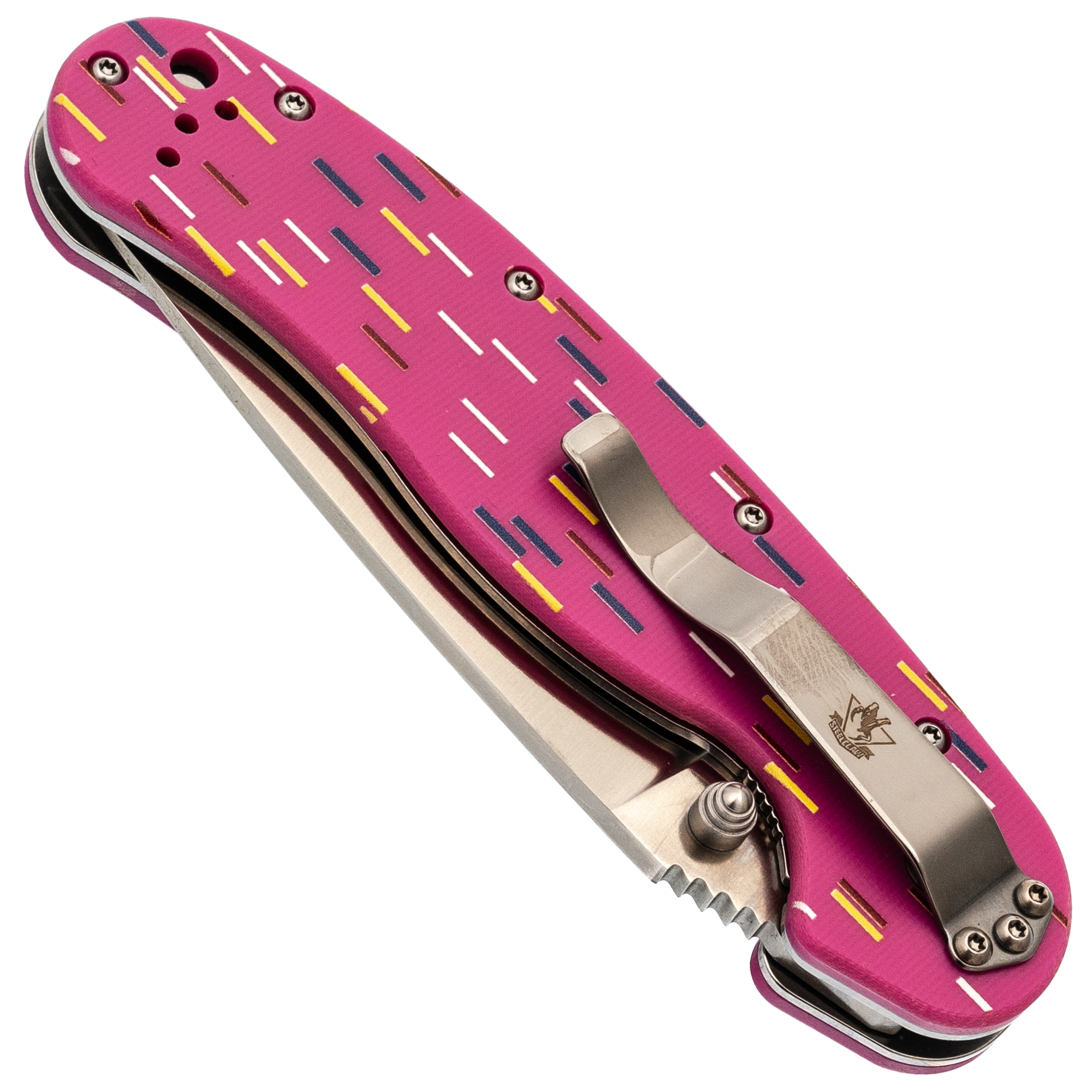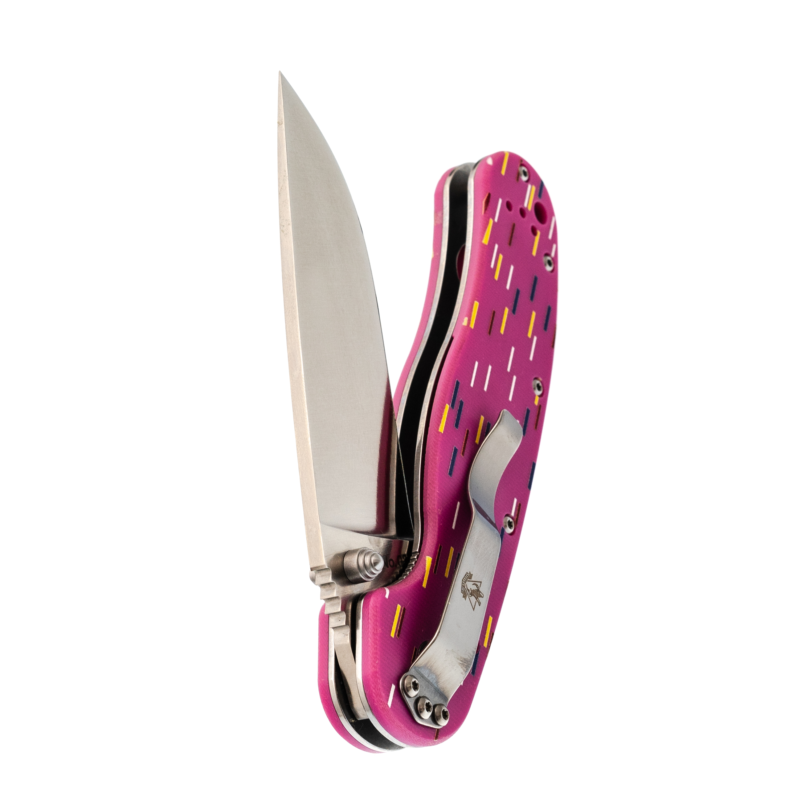 Рукоять из розового G10 стилизована под пончик с сахарной посыпкой. Вкрапления разных оттенков создают эффект кондитерского изделия, делая инструмент необычным и запоминающимся. Но за внешней лёгкостью скрывается серьёзная эргономика. Форма рукояти выгнута так, что она удобно ложится в ладонь, обеспечивая плотный хват. При этом конструкция позволяет брать нож разными хватами - хоть обычным, хоть с упором на указательный палец для точных работ. Темлячное отверстие позволяет повесить яркий шнурок, чтобы нож было проще найти в рюкзаке или чтобы украсить его на свой вкус.