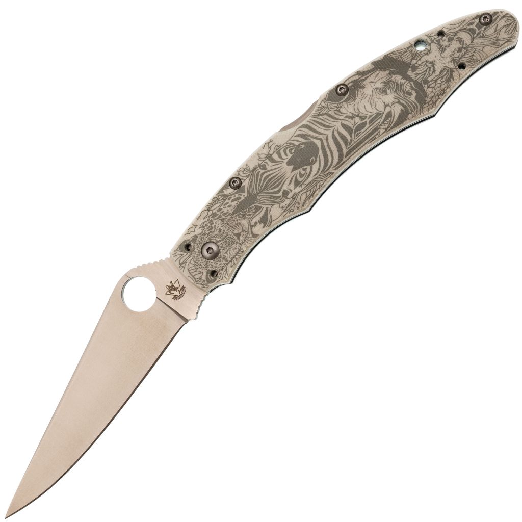 Белая рукоять из G10 с рисунком зебры и зарослей выглядит необычно и запоминается, но при этом остаётся практичной. Изогнутая форма хорошо фиксируется в руке, чойл добавляет контроля. Замок Back-Lock обеспечивает надёжную фиксацию клинка и прост в обслуживании. Клипса с возможностью установки в четырёх положениях делает нож полностью удобным для правшей и левшей, а плоский профиль рукояти не мешает при ношении в кармане.