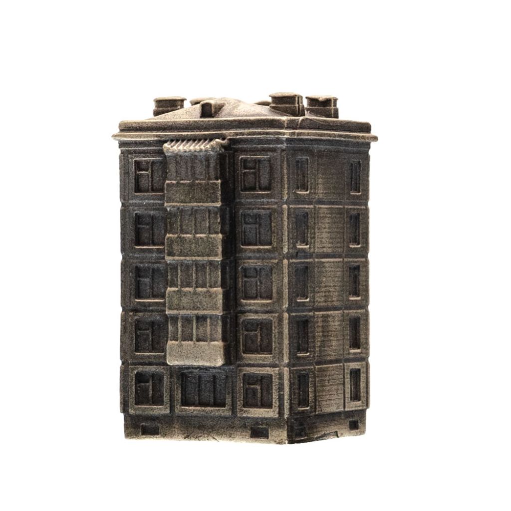 Мельхиор - материал, сочетающий прочность и благородный блеск. Он не боится времени и отлично передаёт мелкие детали фасада, подчёркивая текстуру «бетонных» плит и геометрию типовых окон. Поверхность бусины тщательно проработана, с эффектом легкой патинированности - как будто она действительно простояла на ветру и дождях лет тридцать.