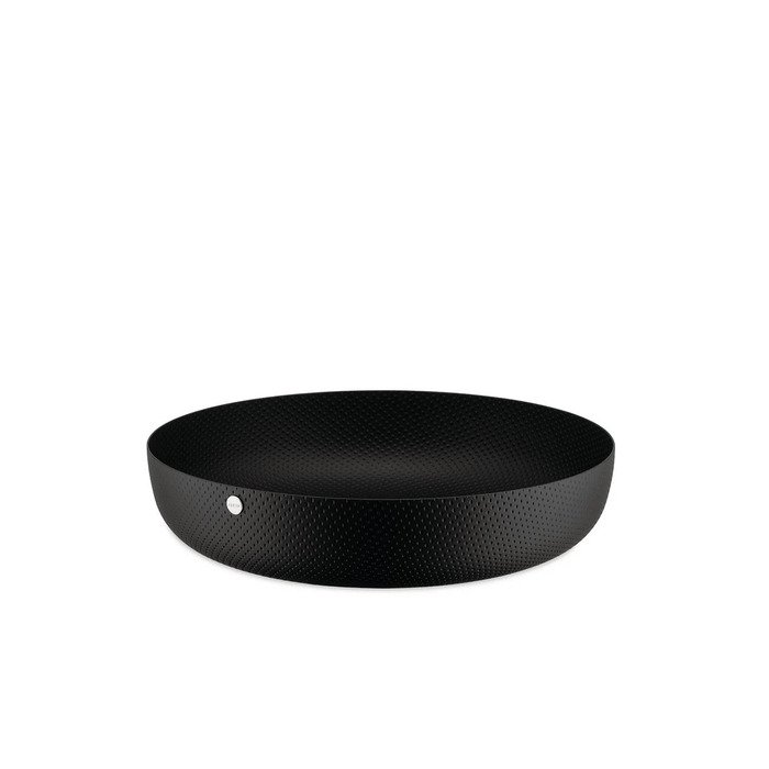 Маленькая корзинка с минимальными линиями от дизайна Джаспера Моррисона. Гранулированная поверхность и черный цвет обогащают основные формы изделия и придают элегантный стиль. Грануляция - это специальная обработка металлической поверхности, которая переосмысливает древнюю технику ювелира на промышленной основе. Расположение зерен следует геометрической последовательности, вызванной последовательностью Фибоначчи, итальянского математика, который первым перевел Золотое сечение в числа, один из самых высоких принципов, управляющих формами природы. Благодаря грануляции черная круглая чаша выглядит еще красивее.