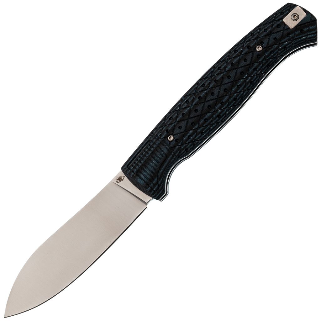 Материал рукояти - стеклотекстолит G10 в насыщенном синем цвете. Он прочен, не боится влаги и температурных перепадов. Специальная фрезеровка улучшает сцепление с рукой и даёт дополнительную надёжность при мокром или скользком хвате. Эргономичная форма под ладонь делает использование комфортным даже в течение длительного времени.