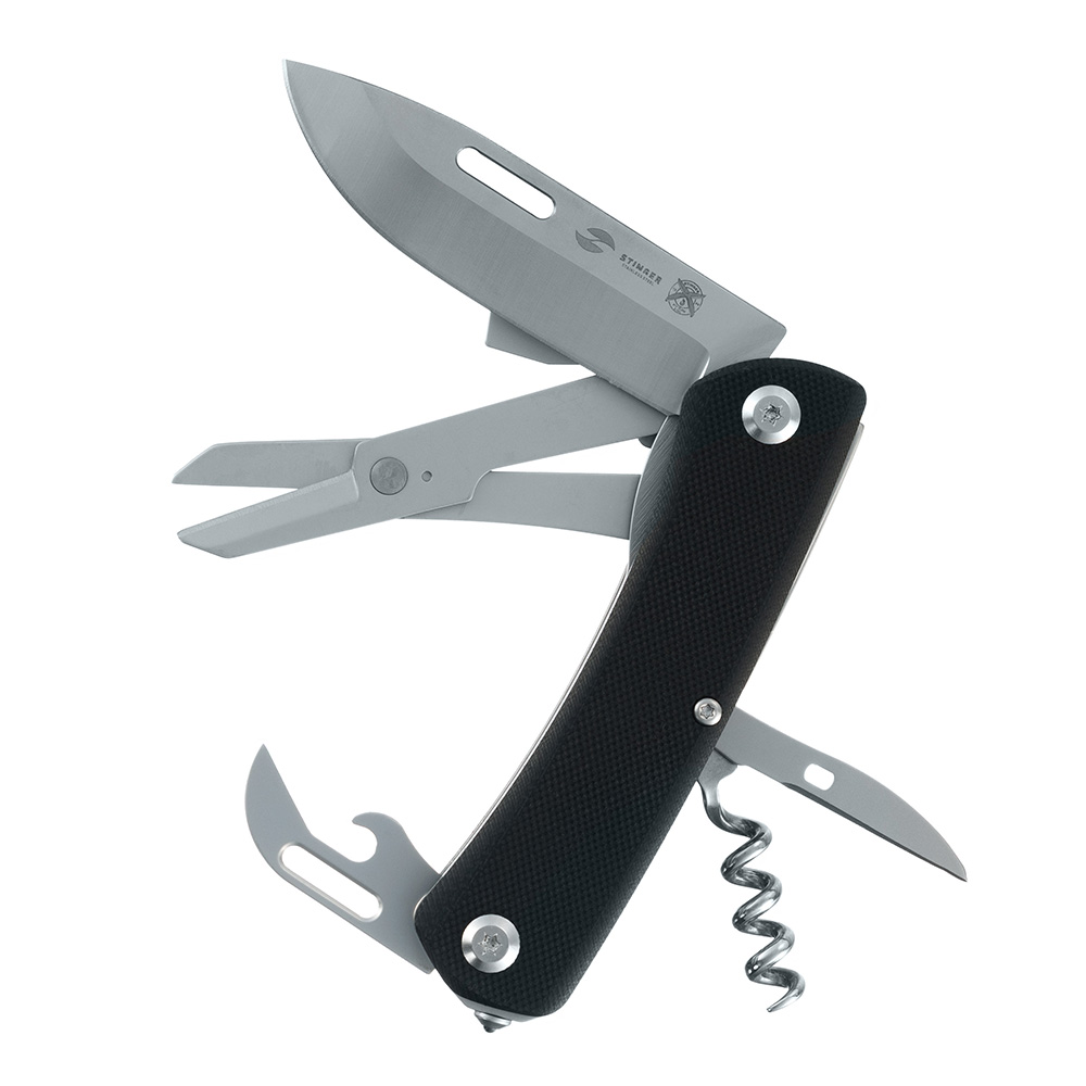 1. Лезвие с фиксатором клинка Liner Lock2. Ножницы3. Открывалка для бутылок с:4. – шлицевой отверткой среднего размера5. Консервный нож c:6. - инструментом для снятия изоляции7. Крестовая отвёртка8. Шило/кёрнер9. Стеклобой10. Клип