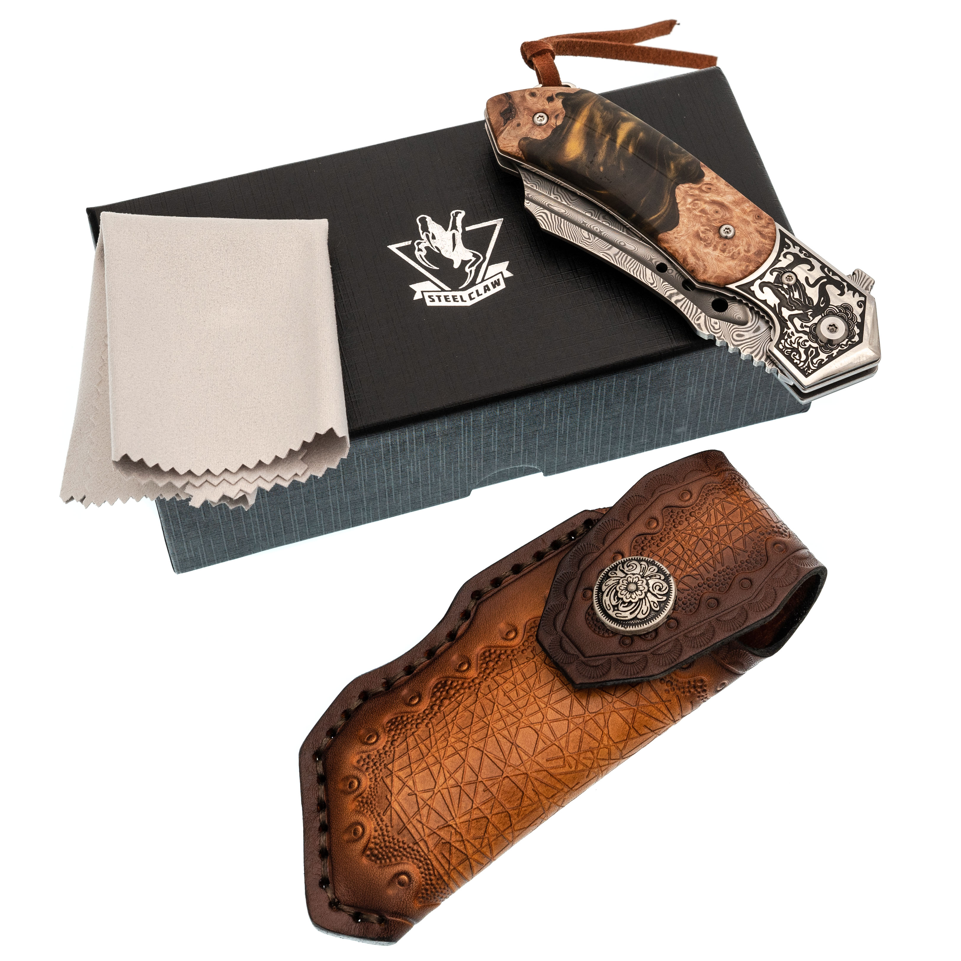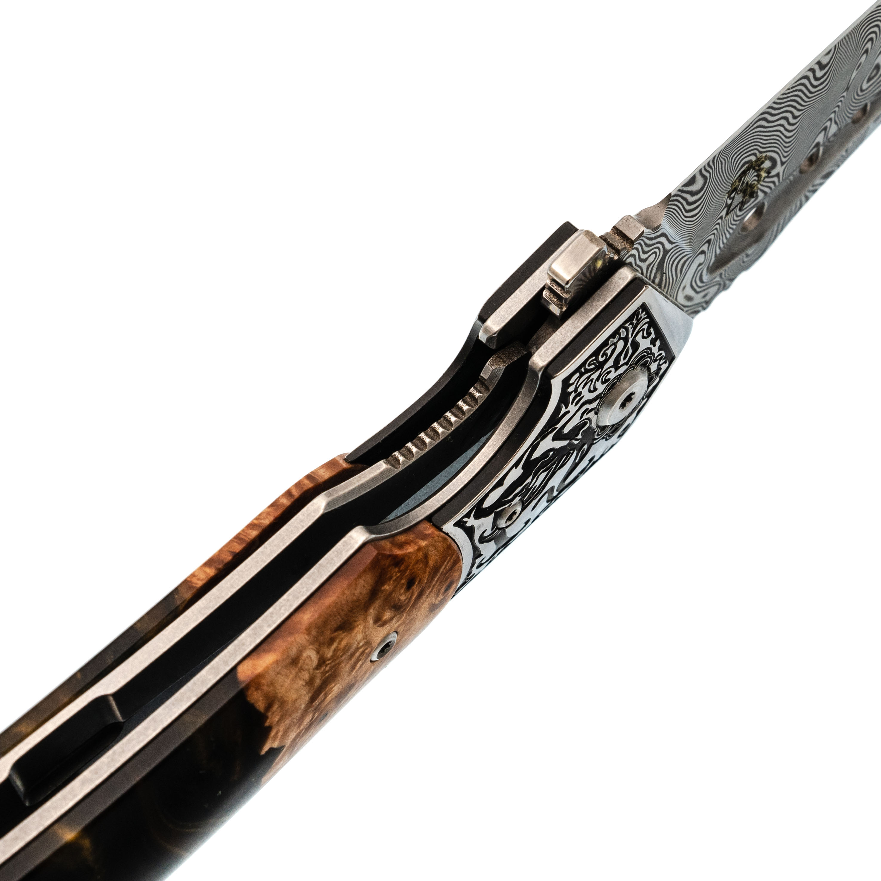 Steelclaw Барк - складной нож среднего размера с тёплым олдскульным настроением и приятной вещевой подачей: тут и художественные больстеры с гравировкой, и материалы, которые хочется разглядывать вживую. По духу он отсылает к классическим карманным ножам, только в более плотном, современном исполнении. Открывается за флиппер или дол, а в рабочем положении уверенно фиксируется Liner-Lock - всё просто и понятно.