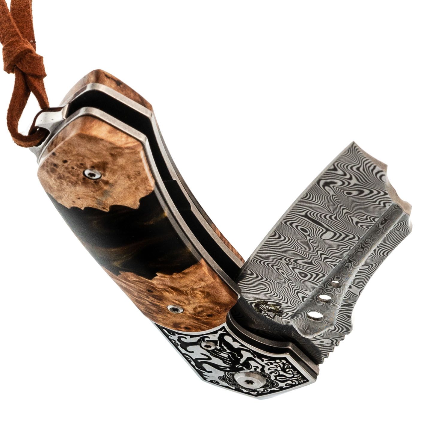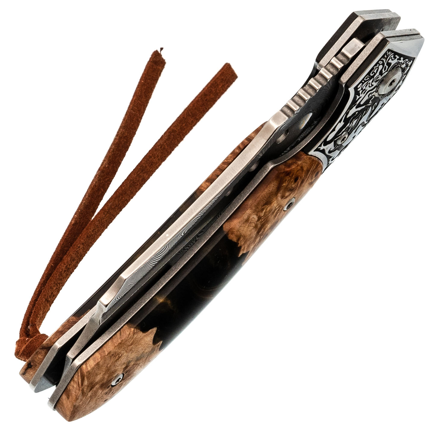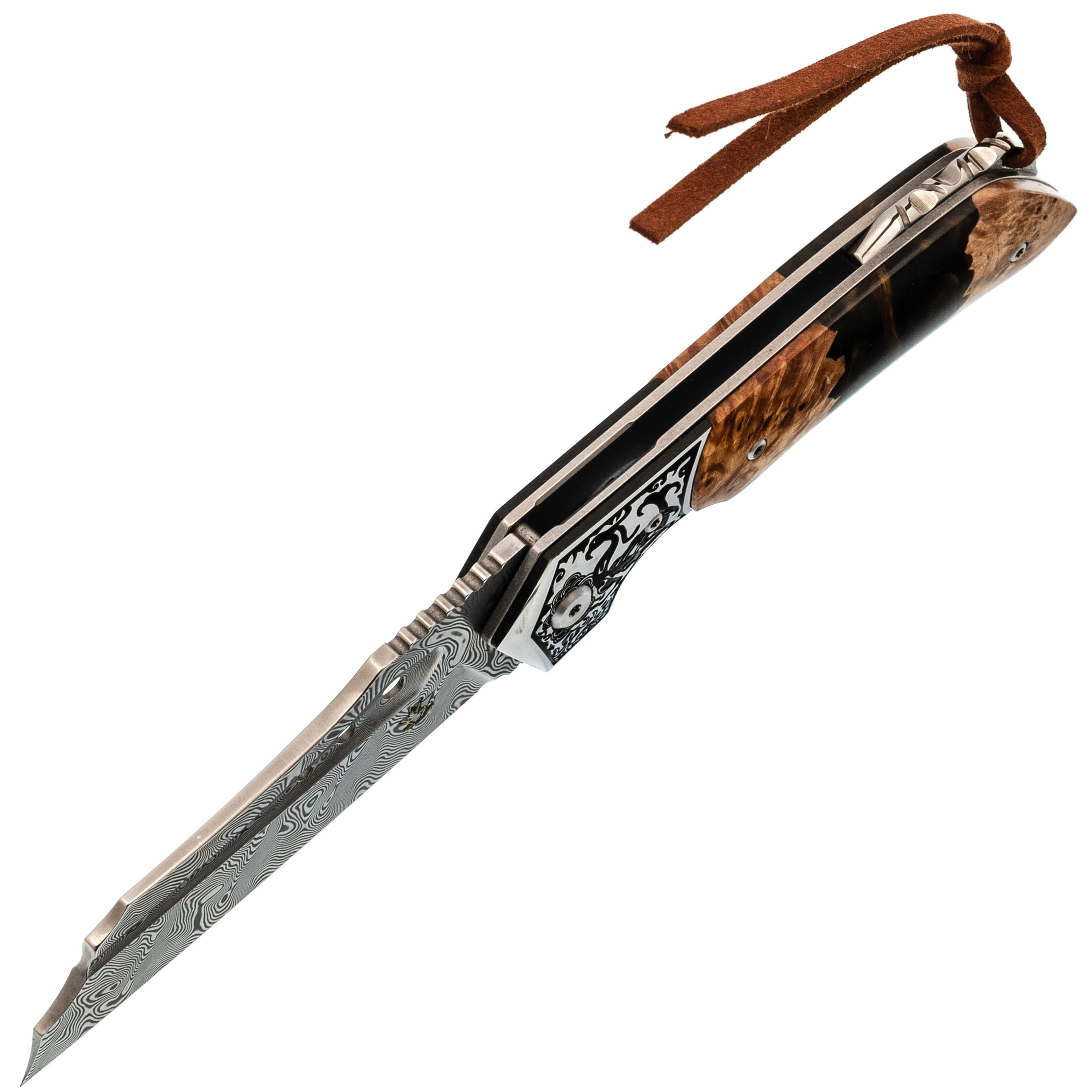 Дамаск (наружные слои клинка) - даёт тот самый рисунок и живую фактуру, за которую любят классические композиты. Плюс это приятная стойкость к мелким следам использования: на узоре они меньше бросаются в глаза, чем на ровном сатине.