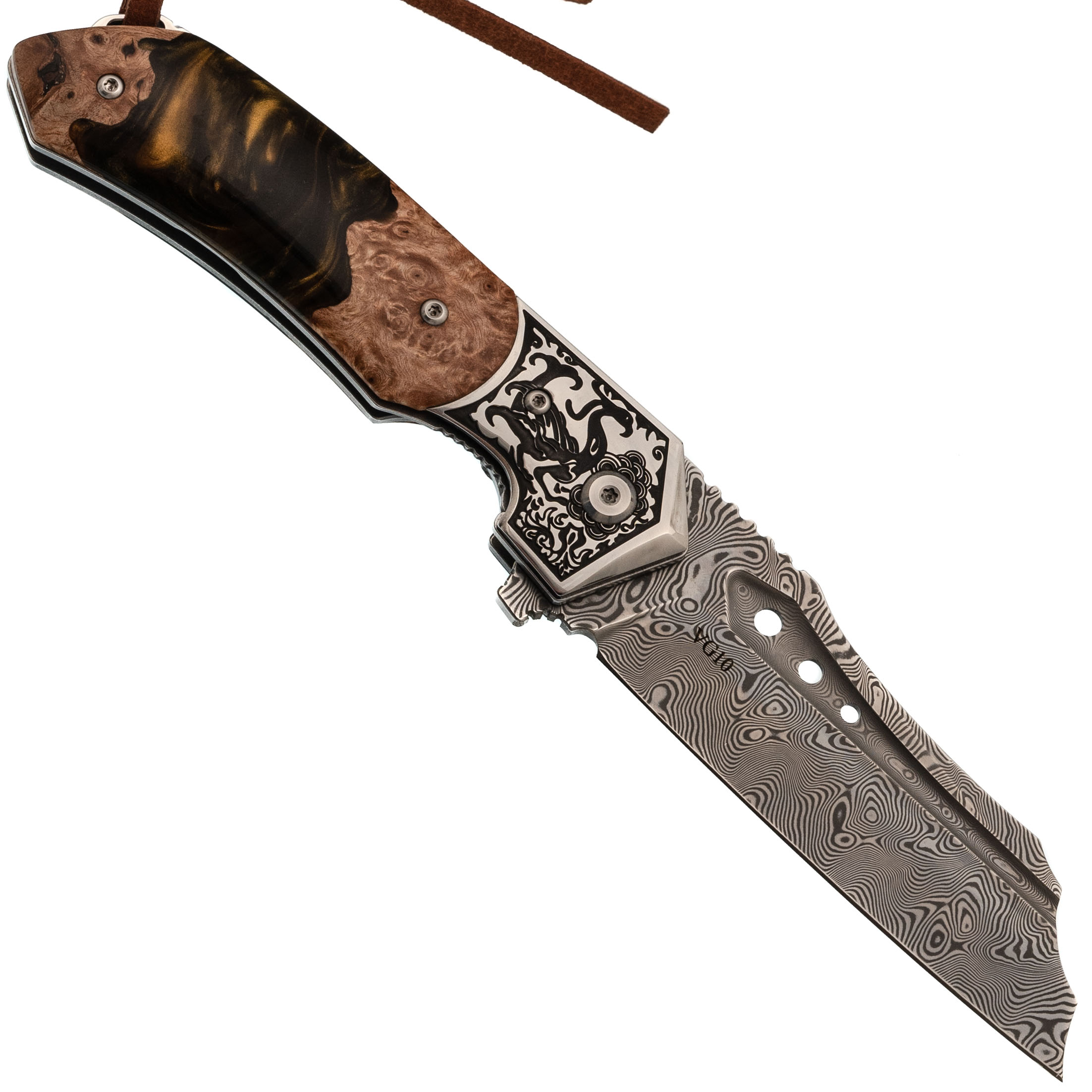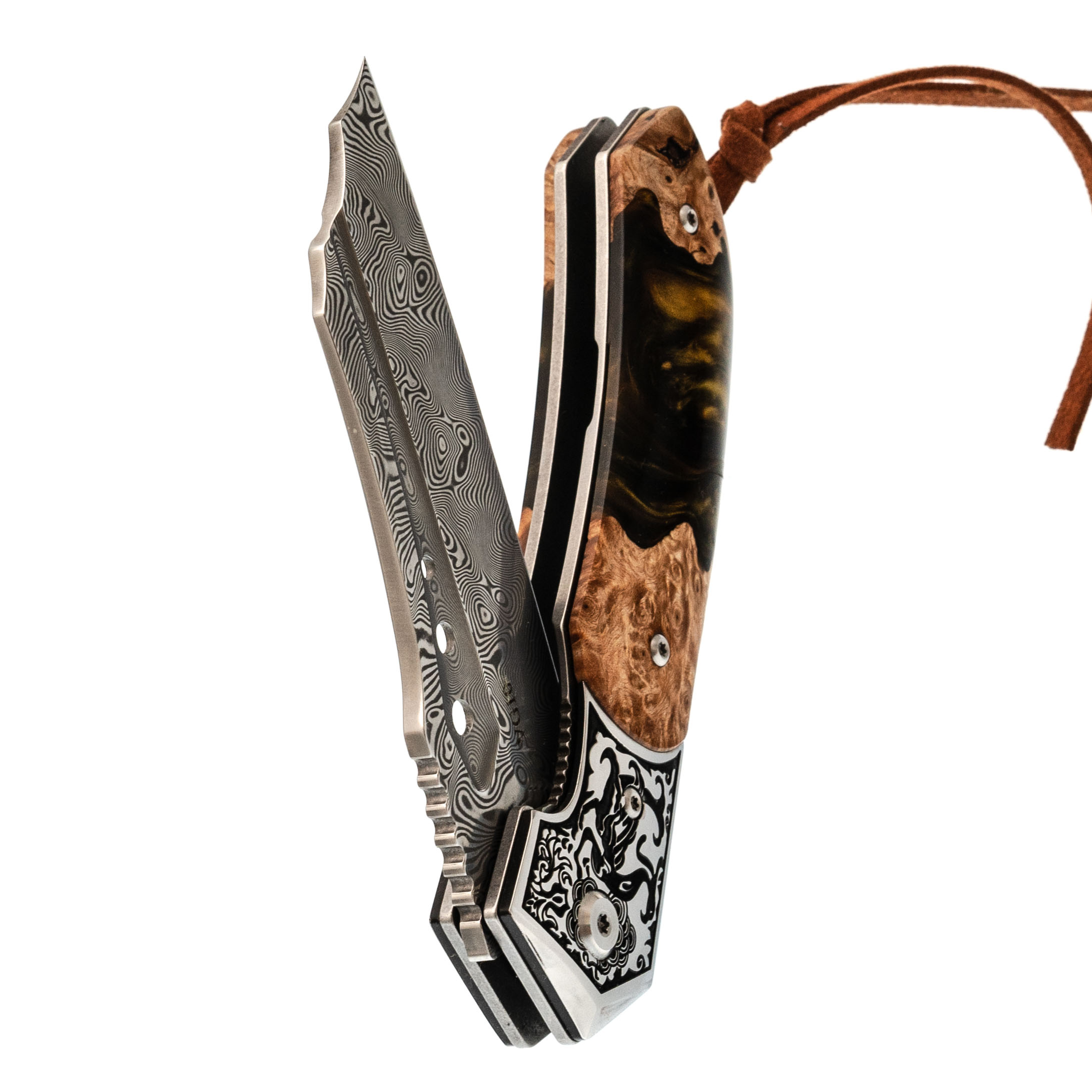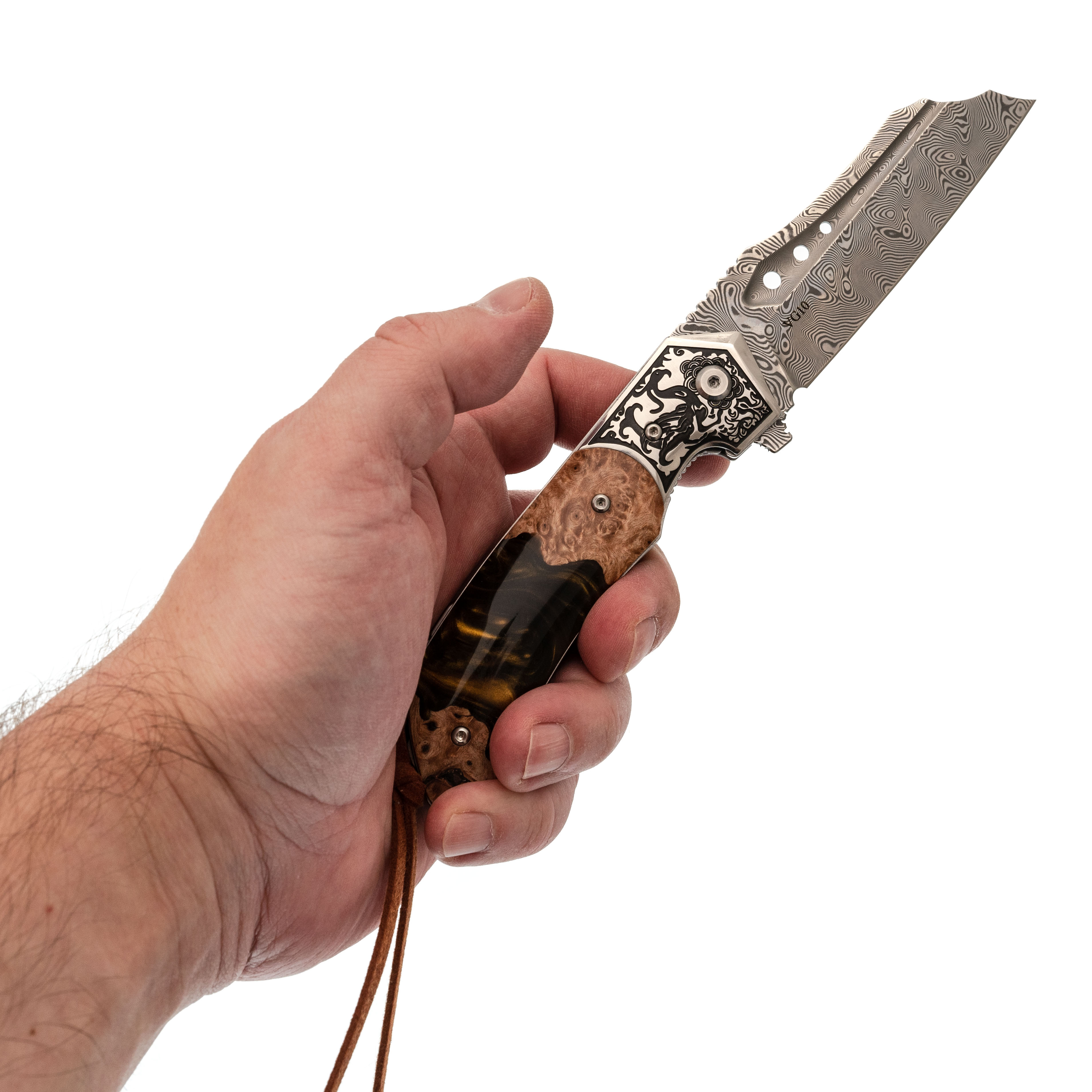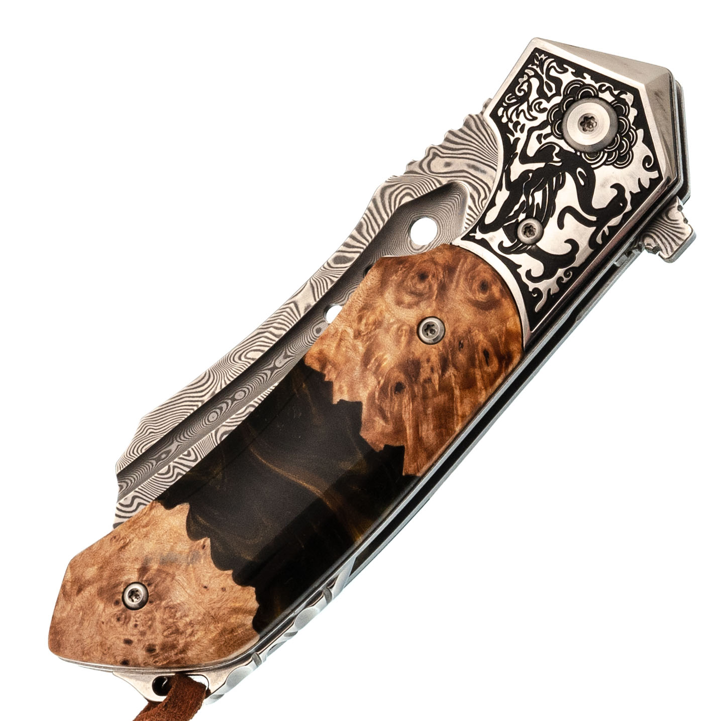 Дамаск (наружные слои клинка) - даёт тот самый рисунок и живую фактуру, за которую любят классические композиты. Плюс это приятная стойкость к мелким следам использования: на узоре они меньше бросаются в глаза, чем на ровном сатине.