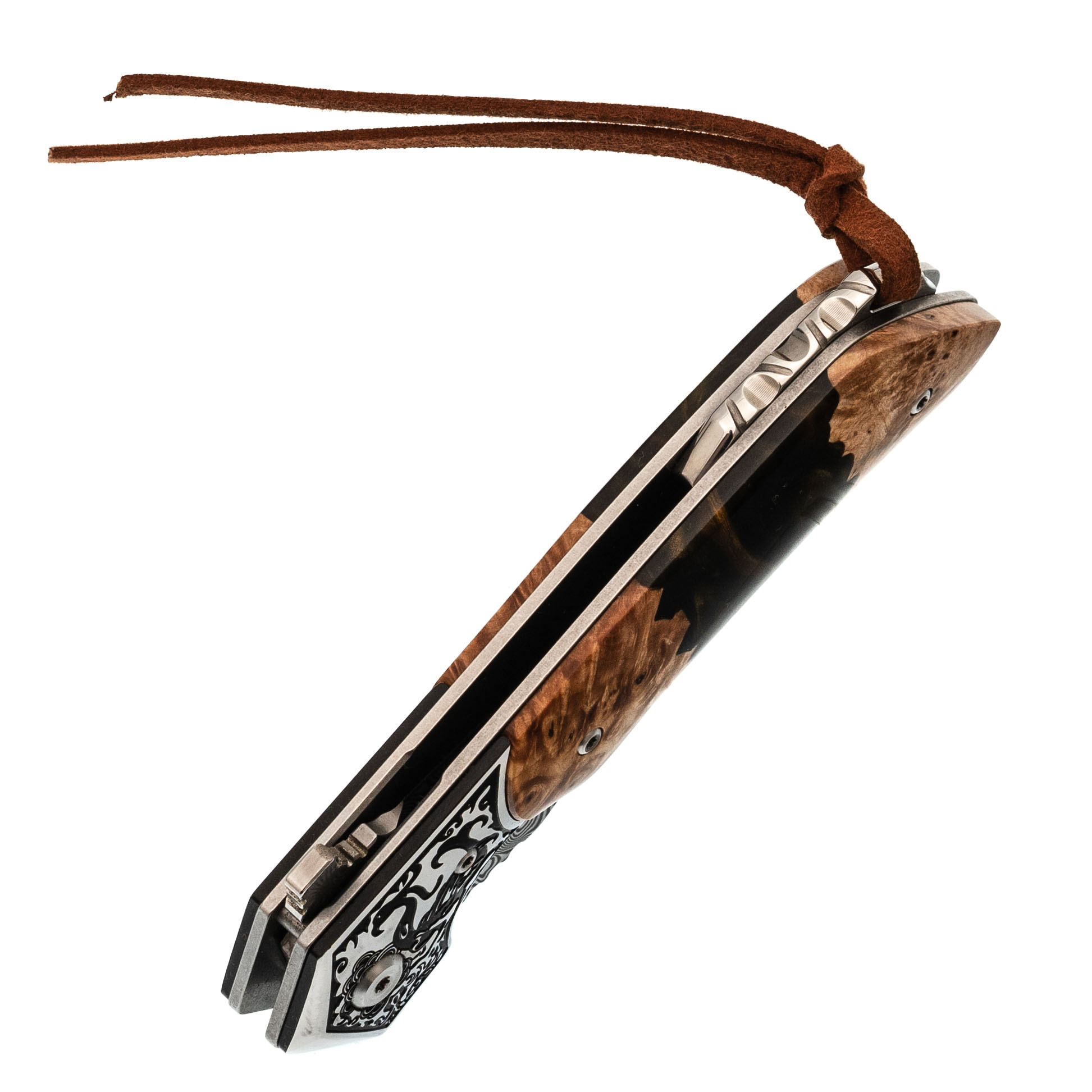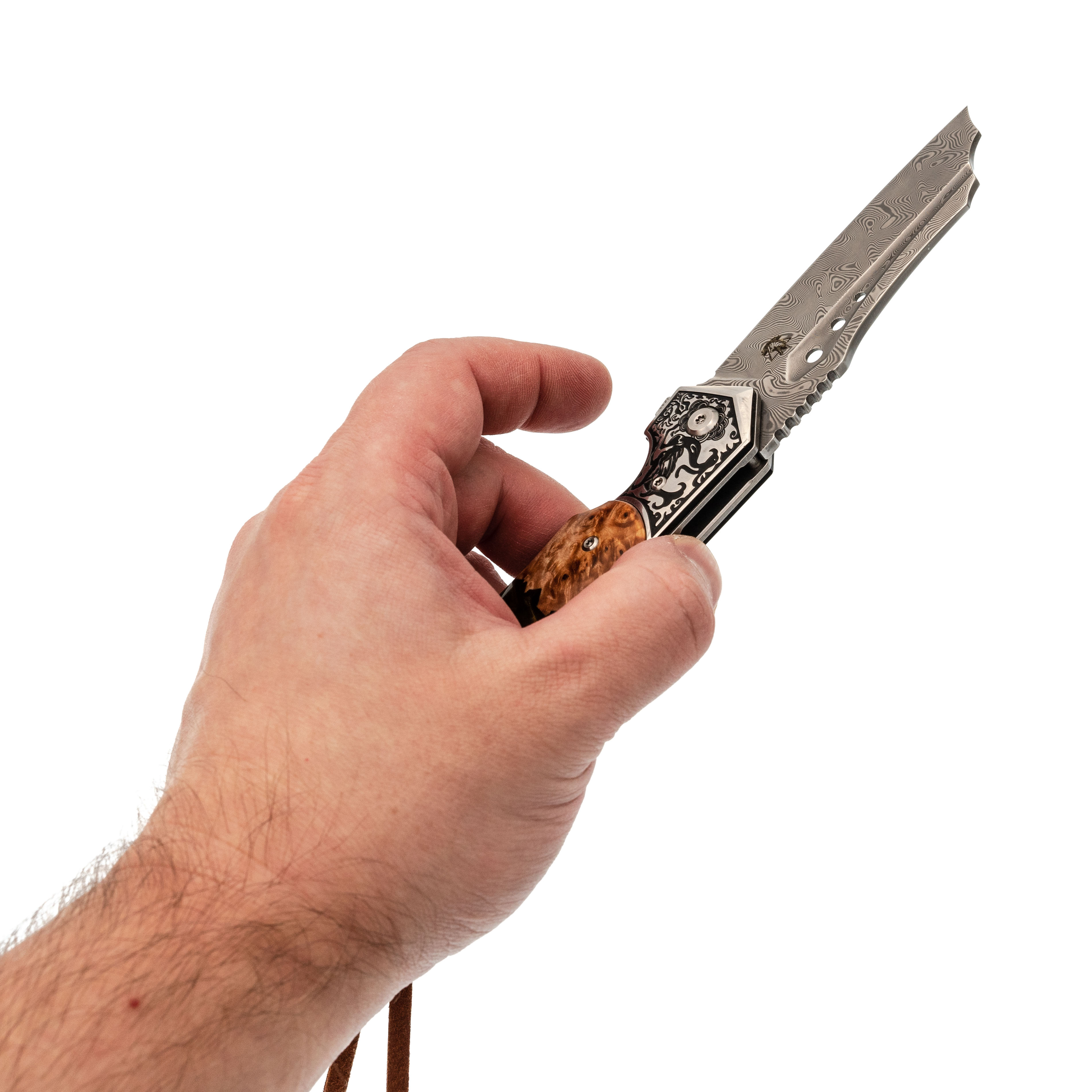 Изогнутая форма хорошо ложится в ладонь и сразу задаёт правильную посадку - нож не просится проворачиваться, когда работаешь подольше. Сочетание стали и композитных накладок делает хват одновременно уверенным и комфортным, а гравированные больстеры добавляют аккуратный декоративный акцент без лишней вычурности. Темлячное отверстие на месте - удобно, если любишь темляк или просто хочется проще доставать нож из чехла/кармана.
