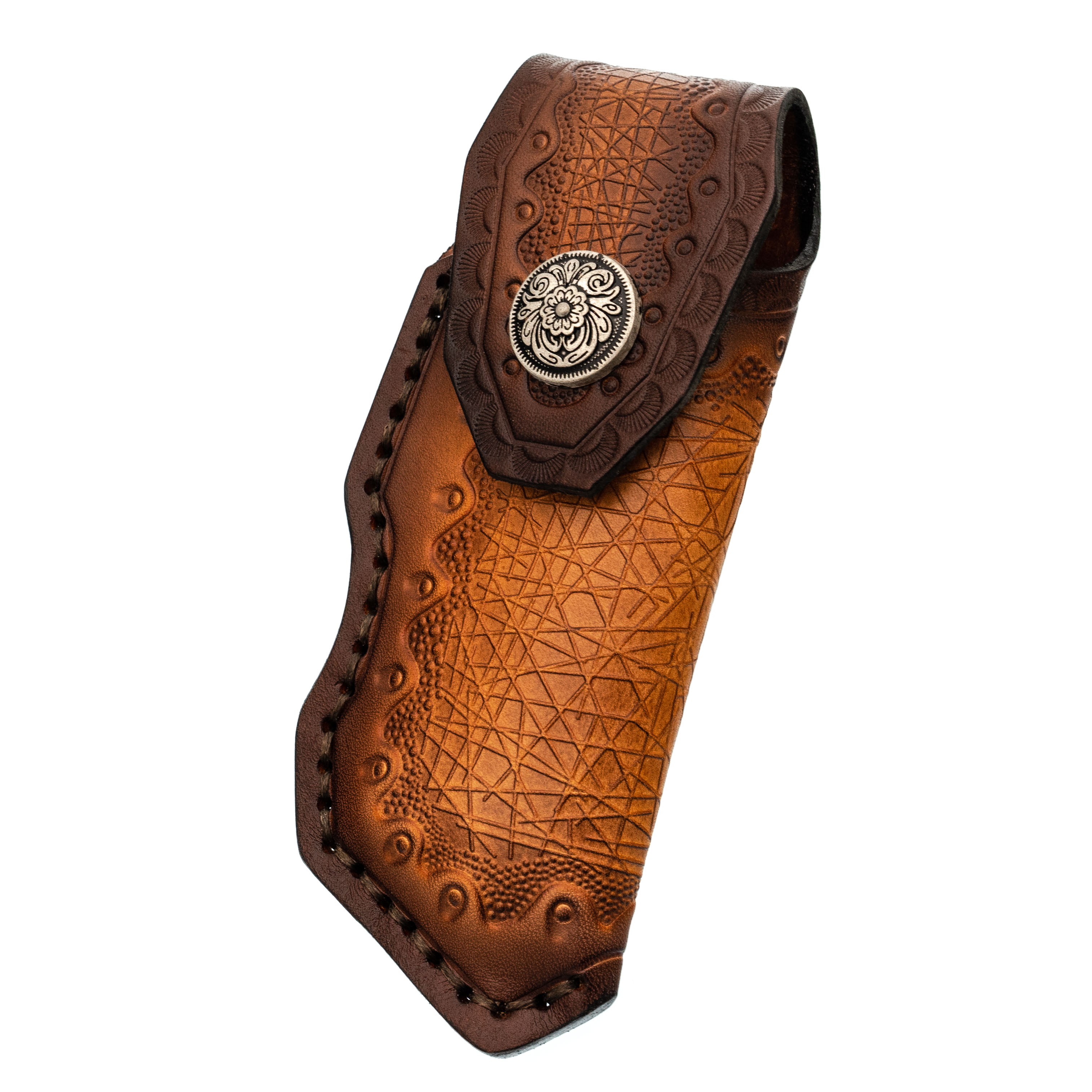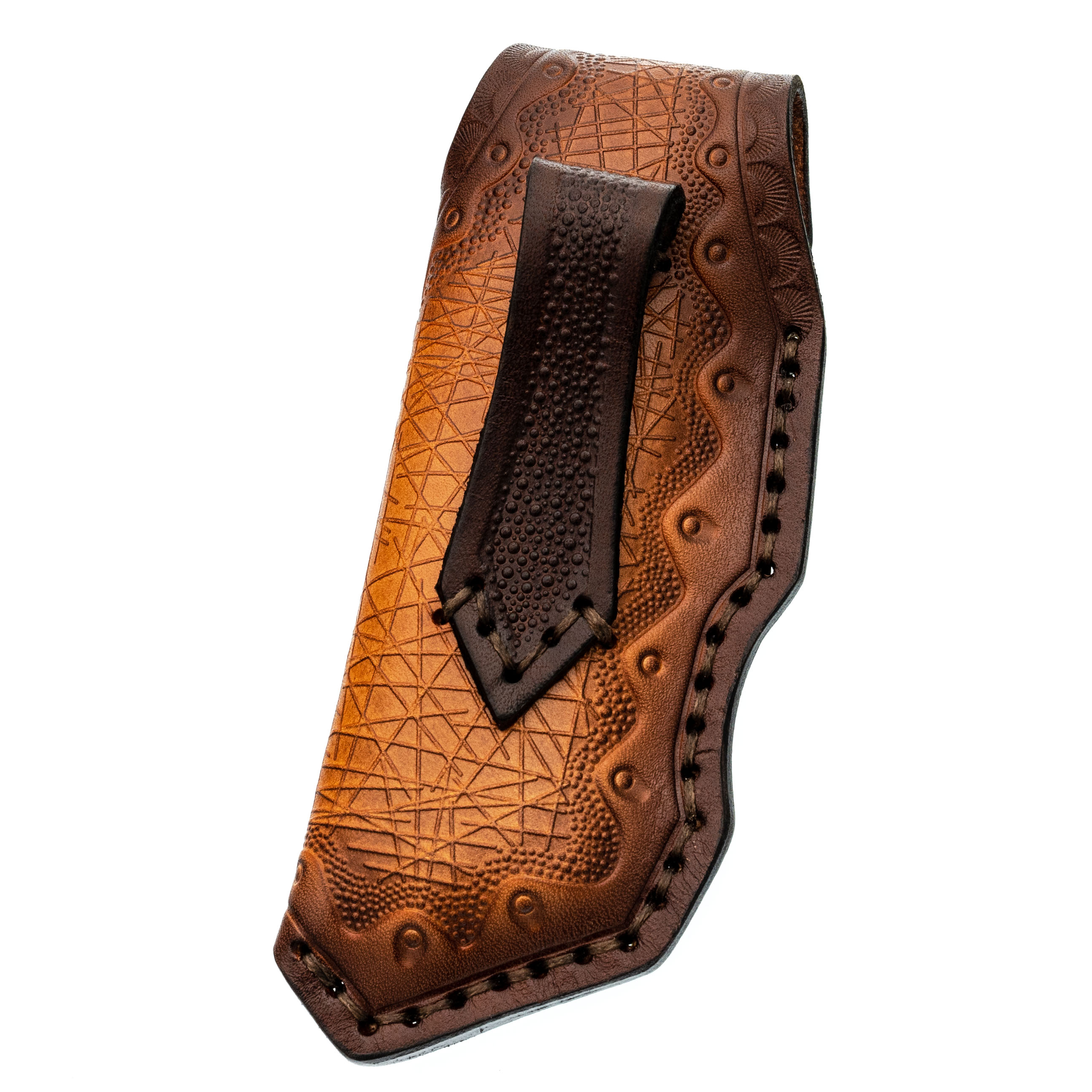 В комплекте кожаный чехол для вертикального ношения на поясе - решение для тех, кто предпочитает, чтобы нож был всегда на своём месте. Клапан на кнопке держит модель уверенно: при ходьбе не болтается и не норовит выскочить, а доставать при необходимости всё равно удобно и быстро.