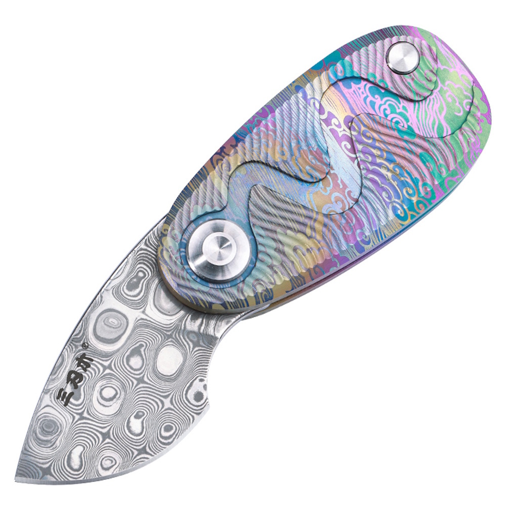 Титановый сплав рукояти - легкий, устойчивый к коррозии и механическим повреждениям материал, сохраняющий внешний вид даже при активной эксплуатации. Разноцветная обработка придает изделию индивидуальность и подчеркивает его декоративную составляющую.