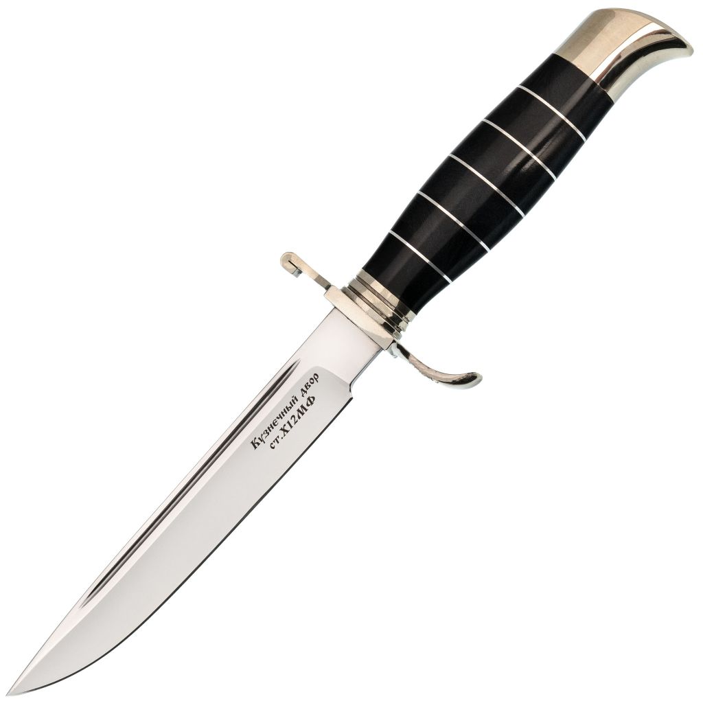 Данная Финка НКВД от кузницы Крутова это попытка создать финку из более современных и надёжных материалов, чем принято. Сейчас расскажем об этом подробнее.Клинок традиционной для Финок НКВД формы выполнен из стали Х12МФ, которая обладает высокой стойкостью к износу и долго сохраняет заточку. Это позволяет снизить частоту необходимости в обслуживании ножа и повысить его эффективность при работе. Благодаря агрессивному режу клинка, он легко проникает в разрезаемый материал, делая процесс более быстрым и точным. Такое сочетание качеств делает этот клинок надежным инструментом для профессионального использования в различных ситуациях.Рукоять финок НКВД представляет собой изысканное сочетание функциональности и эстетики. Её S-образная гарда обеспечивает высокую степень защиты в использовании, а грибок-навершие придает особую изящность. Изготовленные из мельхиора, эти элементы не только выглядят благородно, но и обладают повышенной стойкостью к коррозии и другим агрессивным воздействиям. Сама рукоять бочковитой формы выполнена из акрила с проставками, что придает ей благородный внешний вид. Акрил - надежный и неприхотливый материал, который обеспечивает долговечность изделия. В отличие от дерева, акрил не подвержен воздействию влаги и температурных изменений, что делает его более практичным для использования. Барельефные элементы на рукояти добавляют эстетический шарм и усиливают комфорт при работе с инструментом.Ножны для Финки НКВД изготовлены из высококачественной натуральной кожи, обеспечивая надежную защиту и долгий срок службы. Жесткий подвес позволяет удобно и безопасно закрепить нож на поясе или ремне, а свободный подвес дает большую мобильность и свободу передвижения. Благодаря такому разнообразию выбора пользователь может самостоятельно определить оптимальное положение для комфортного использования в любых условиях.