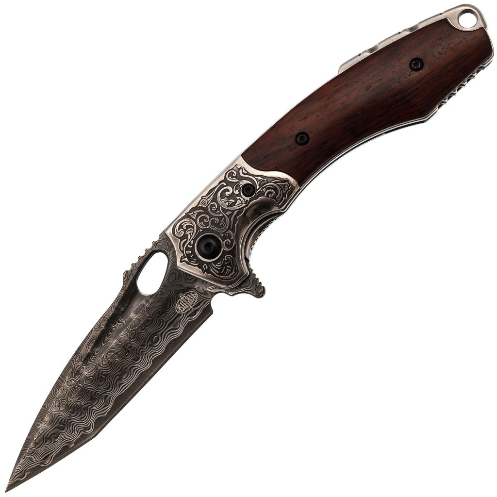 Клинок выполнен в брутальной геометрии Tanto — прочной, проникающей и подчёркнуто агрессивной. Такая форма не только эффектна визуально, но и функциональна: мощный кончик и прямые линии режущей кромки отлично справляются с проколами и прямолинейным резом. Сталь — дамасская, с художественным травлением, подчёркивающим её многослойную природу и добавляющим индивидуальности каждому экземпляру.