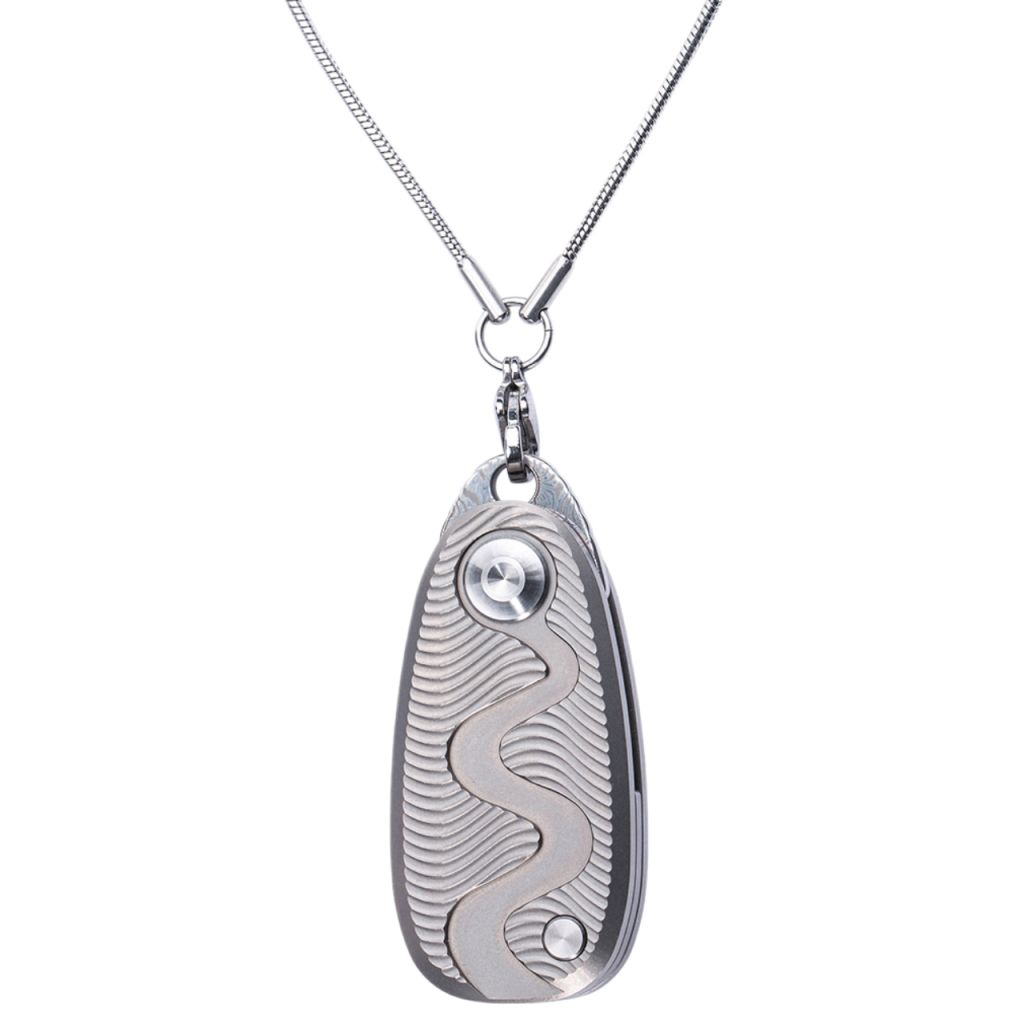 Рукоять из необработанного титана. Здесь титан оставили в первозданном виде - серый, матовый, без цветных переливов. Это практично: на таком фоне царапины почти незаметны, а если и появляются - они только добавляют инструменту характера. Титан не ржавеет, не боится пота, морской воды или химии. По весу он ощущается почти невесомым, что критично для ножа-кулона.