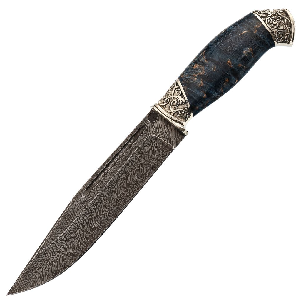 Нож "Варан" от Кузницы Крутова - это большой, харизматичный и нарядный нож, который сразу привлекает внимание. Он станет отличным подарком для любителей уникальных и красивых вещей.Клинок "Варана" изготовлен из дамасской стали, которая придает ножу не только красоту, но и высокую прочность. Несмотря на то, что дамасская сталь не обладает выдающимися характеристиками, она показывает себя отлично в работе, сравнимо с другими добротными нержавеющими сталями. Форма клинка - универсальный Clip-Point, который подходит для большинства задач. Спуски на 2/3 клинка обеспечивают высокую прочность прочность.Рукоять ножа состоит из трех частей: мельхиорового больстера и навершия с художественным литьем, а также рукоятки из стабилизированной карельской березы. Карельская береза известна своей природной прочностью, а стабилизация делает ее невосприимчивой к воздействию воды. Мельхиоровые элементы придают рукоятке изящество и делают ее по-настоящему уникальной.Ножны "Варана" выполнены из толстой натуральной кожи и обеспечивают надежную защиту ножа. Они оснащены как жестким, так и свободным подвесом, что позволяет удобно носить нож при различных обстоятельствах.
