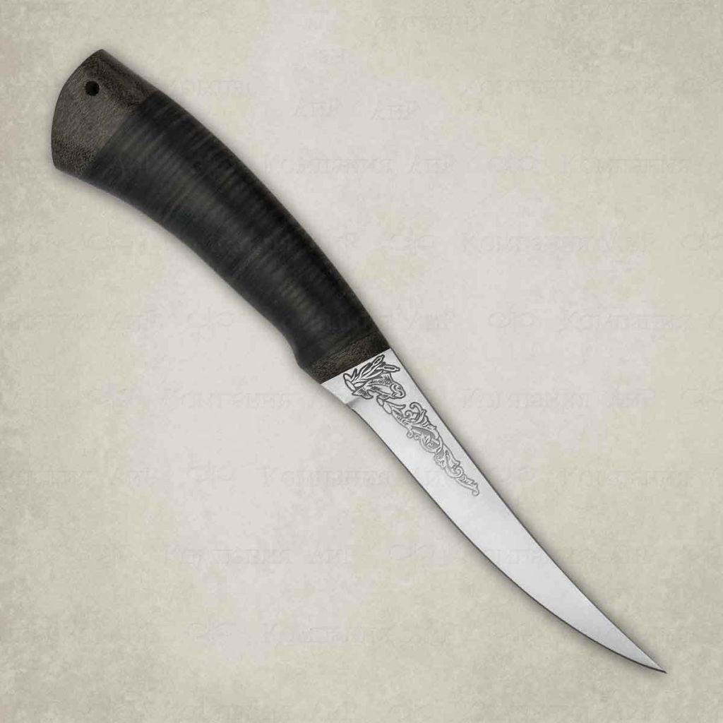 Малый филейный нож с узким клинком для разделки рыбы. Клинок толщиной 2 мм имеет линзовидные спуски, образующие тонкое, прекрасно режущее лезвие. Рукоять эргономической формы уверенно и прочно лежит в любой ладони. А оптимальной величины гарда не дает соскользнуть пальцам при резах от себя. Монтаж клинка сквозной, неразборный. Отличный выбор для разделки рыбы.