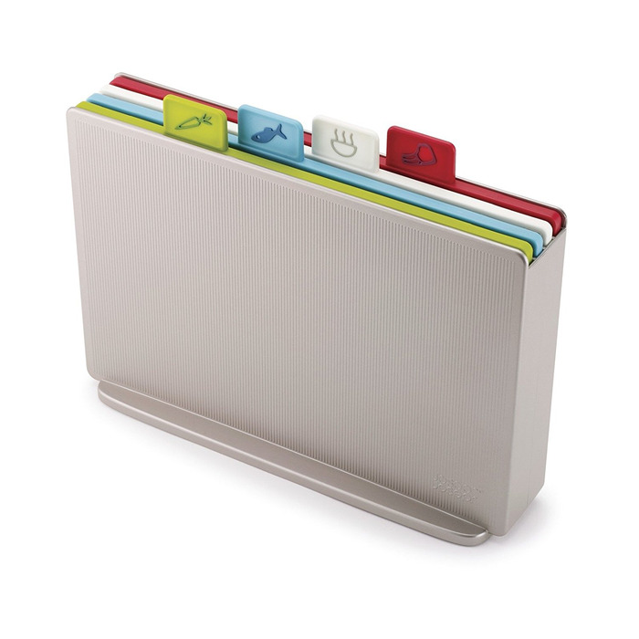 Набор Joseph Joseph Index состоит из четырех прямоугольных разделочных досок, которые компактно размещаются в специальной подставке, выполненной из пластика. Это делает набор не только многофункциональным, но и очень удобным для хранения на кухне. Кроме того, основание подставки оснащено нескользящими резиновыми ножками. Доски выполнены из пищевого пластика, каждая из них имеет свой определенный цвет: зеленая - для овощей, голубая - для рыбы и морепродуктов, белая - для горячих продуктов, красная - для мяса. Также доски снабжены "ярлычком" с изображением продуктов, для которых они предназначены. Качественное антибактериальное покрытие досок препятствует размножению вредных микробов, предотвращает затупление ножей. Легко моются. Набор Joseph Joseph Index станет незаменимым и полезным аксессуаром на вашей кухне, который к тому же и стильно дополнит интерьер. Можно мыть в посудомоечной машине.