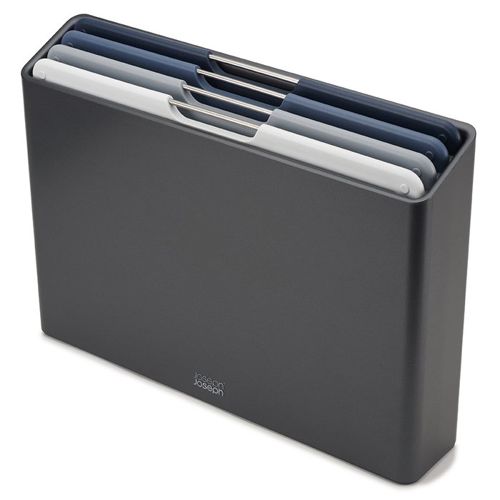 В набор входит 4 цветных разделочных доски белого, серого, голубого и синего цвета. Подставка представлена в цвете графит. Доски имеют закругленные края и нескользящие ножки. Внутренние края удерживают влагу и крошки. За счет текстурированной поверхности не видно царапин. Доски и подставка выполнены из пластика, а ручки – из нержавеющей стали. Благодаря конструкции кейса между досками циркулирует воздух, и они быстрее высыхают. Их можно мыть как вручную, так и в посудомоечной машине. Вес: 2520 гр.