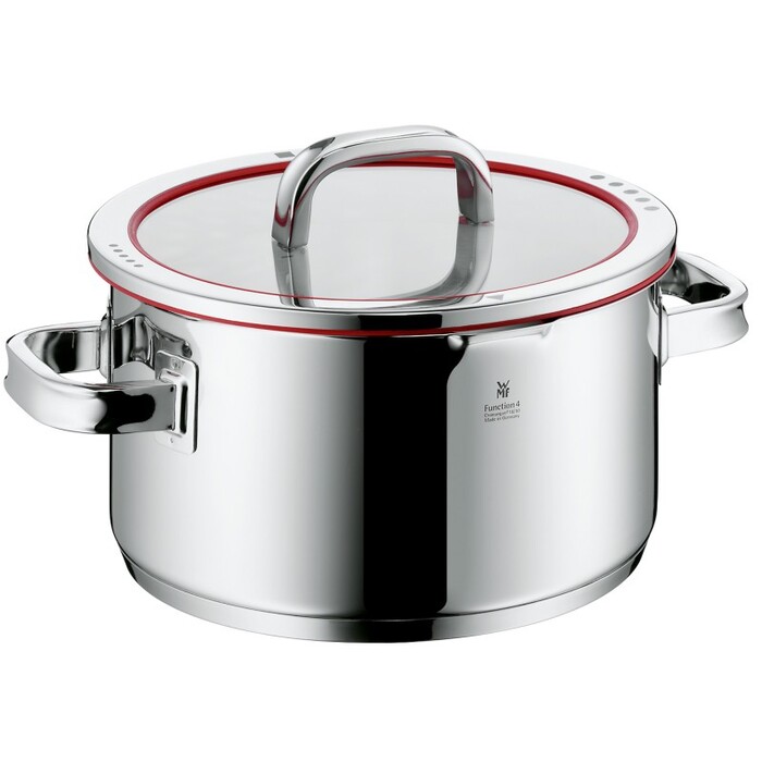 Великолепный дизайн, инновационные функции, первоклассный материал Cromargan®, специальное дно TransTherm® - все эти качества объединились в серии кухонных кастрюль Function 4 от компании WMF. Удобная крышка с красным силиконовым кольцом играет роль безупречного помощника на кухне, и даже непрофессиональный повар с ее помощью будет воодушевлен на приготовление самых сложных блюд. Элегантный яркий элемент заботится о том, чтобы крышка плотно прилегала к кастрюле. Главная ее особенность — это 4 функции слива. Красное силиконовое кольцо и носик для слива в кастрюле наделяют серию Function 4 необыкновенной функциональностью. В зависимости от выбранной позиции кольца, теперь стало возможным сливать жидкость, не открывая крышку. Есть мерная шкала.