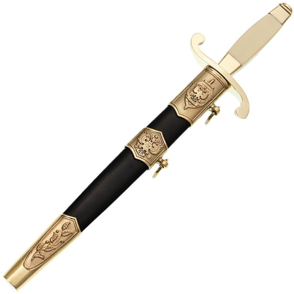 Сувенирный кортик ФСБ России - это высококачественная реплика, идеально подходящая для коллекционеров, любителей истории или для использования в качестве реквизита. Он является точной копией оригинального кортика и станет отличным подарком для тех, кто ценит символику и традиции.Клинок кортика изготовлен из нержавеющей стали, что обеспечивает его долговечность, при этом он не заточен и имеет низкую твердость, что позволяет свободно приобретать и владеть таким сувениром. Рукоять выполнена из пластика, а навершие и гарда изготовлены из латуни, придавая кортику изящный и благородный вид. Ножны, обтянутые кожей, сделаны из дерева и дополнены латунным литьем, что подчеркивает внимание к деталям.Этот сувенирный кортик станет ярким элементом в любой коллекции или послужит реалистичным реквизитом для съемок и фотосессий, позволяя воссоздать атмосферу торжественных церемоний или исторических событий.