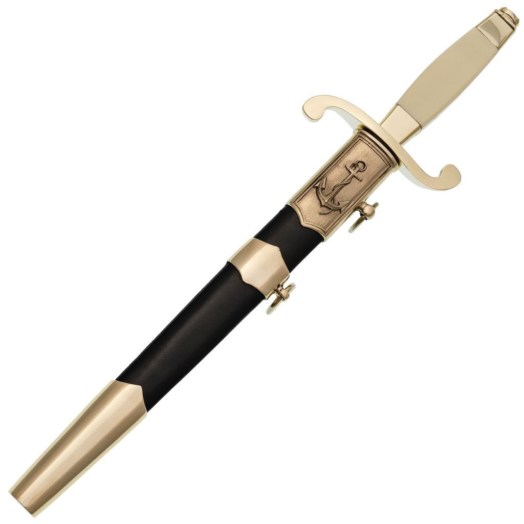 Сувенирный кортик офицерского ВМФ - это высококачественная реплика, идеально подходящая для коллекционеров, любителей военной истории и тех, кто ценит символику военно-морского флота.Клинок кортика выполнен из нержавеющей стали, благодаря чему не будет покрывать ржавчиной. Рукоять выполнена из пластика и латуни, сочетая практичность и эстетику. Латунные детали и пластик создают привлекательный контраст цветов. Ножны из дерева, обтянутые кожей, дополнены латунными вставками, придавая кортику торжественный вид.Этот кортик станет отличным подарком для офицера ВМФ или морского энтузиаста. Он может быть использован в качестве реквизита для тематических фотосессий, съемок или для украшения интерьера кабинета, библиотеки или домашнего бара.Важно отметить, что сувенирный кортик не является холодным оружием, так как не имеет заточки и обладает низкой твердостью клинка. Поэтому его можно свободно приобретать и хранить без специальных разрешений.
