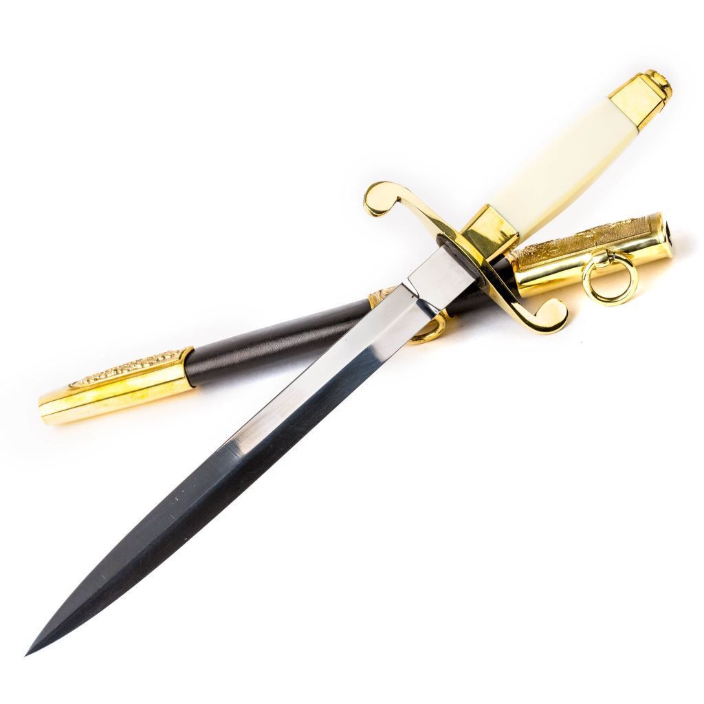 Кортик Офицерский ГРУ - это полная копия оригинала, которая идеально подойдет для создания образа или украшения интерьера. Этот кортик является точной репликой офицерского кортика, который использовался в Главном разведывательном управлении (ГРУ) Вооруженных Сил Российской Федерации. Ножны кортика выполнены из дерева и обтянуты кожей, что придает ему элегантный и стильный вид. Латунные накладки на ножнах добавляют ему дополнительный шарм и подчеркивают его военную тематику. Сталь клинка кортика нержавеющая, что позволяет ему сохранять свой внешний вид даже во влажных условиях. Рукоять кортика выполнена из пластика и латуни, что делает ее неприхотливой и каноничной. Кортик Офицерский ГРУ - это не только прекрасный аксессуар для создания образа офицера разведки, но и уникальный предмет для украшения интерьера. Он может быть размещен на полке, комоде или столе, добавляя в помещение нотку военной истории и героизма. Его качественное исполнение и стильный дизайн сделают его прекрасным дополнением к любому интерьеру. В целом, Кортик Офицерский ГРУ - это точная копия оригинала, которая идеально подойдет для создания образа или украшения интерьера. Его качественные материалы и стильный дизайн делают его прекрасным выбором для тех, кто ценит историю, качество и стиль.Вес вместе с ножнами составляет 310 грамм.