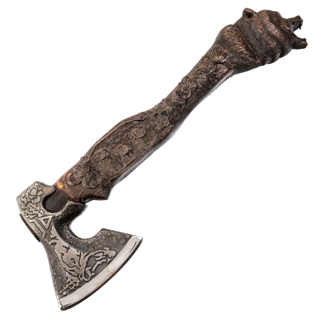 Топор "Хозяин Леса" - это уникальный инструмент, который привлекает внимание своим изысканным внешним видом. Мастера из мастерской "Благодарствие" создали настоящий шедевр, сочетая искусство и функциональность.Главной особенностью топора является его декоративная сторона. Художественное травление и сложная многоуровневая резьба по дереву делают его настоящим произведением искусства. Навершие рукояти украшает изображение медведя, символа силы и власти в славянской культуре, олицетворяющего могущество природы. Медведь занимает особое место в мифологии славянских народов, представляя собой символ силы, мудрости и покровителя лесов.Изящная резьба и внимание к деталям выделяют этот топор среди других. Он станет прекрасным подарком для ценителей ручной работы и может служить украшением интерьера.При этом топор не только красивый, но и практичный. Лезвие изготовлено из углеродистой 65Г рессорной стали, которая обеспечивает высокую прочность и устойчивость к ударным и боковым нагрузкам. Такой топор может использоваться для различных работ, демонстрируя отличную производительность."Хозяин Леса" - это гармоничное сочетание красоты и функциональности, которое оставит неизгладимое впечатление у любого владельца.