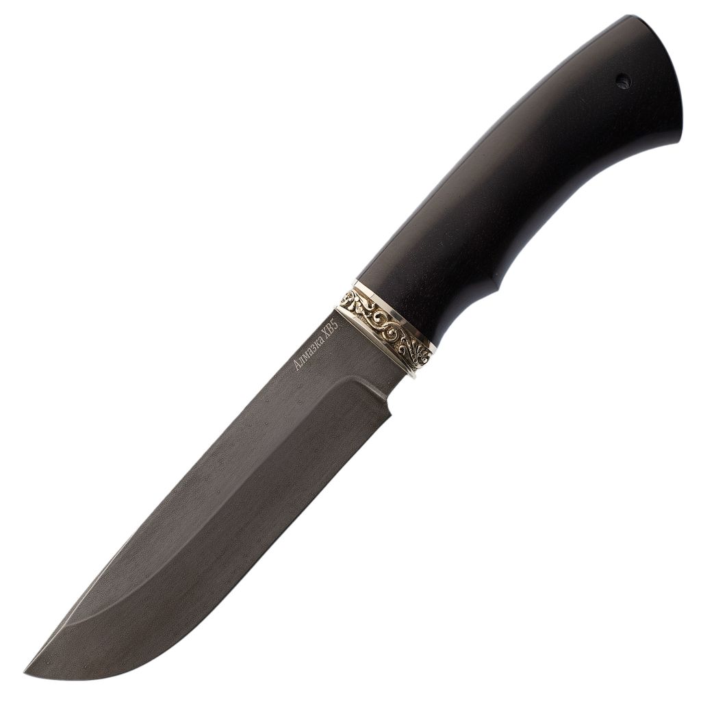 Клинок всадного ножа MT-104 имеет традиционную форму, которая давно используется на русских северных ножах: классический прямой обух с небольшим понижением в направлении острия и плавный подъем режущей кромки. Высокие спуски и тонкое сведение обеспечивают ровный и хорошо контролируемый рез. Острый кончик и фальшлезвие на обухе обеспечивают эффективную передачу усилия при совершении укола.Клинок ножа выполнен из алмазной стали ХВ5, которая имеет твердость 63-64HRC. Благодаря этому туристический всадной нож выдерживает огромные нагрузки на излом и скручивание. Такие свойства делают его отличным претендентом на роль всепогодного полевого ножа.Рукоять ножа выполнена из стабилизированной древесины. Этот материал проверен не одним поколением охотников и туристов. Главной особенность рукоятей из дерева является то, что опытные люди называют «теплотой». Такую рукоятку можно уверенно удерживать на морозе голой рукой и при этом совершенно не испытывать холода.Благодаря особому рисунку алмазной стали, литому больстеру, черной матовой рукояти и чехлу из плотной натуральной кожи нож производит впечатление статусного мужского аксессуара. Такой нож может стать отличным подарком другу, боссу или партнеру по бизнесу.