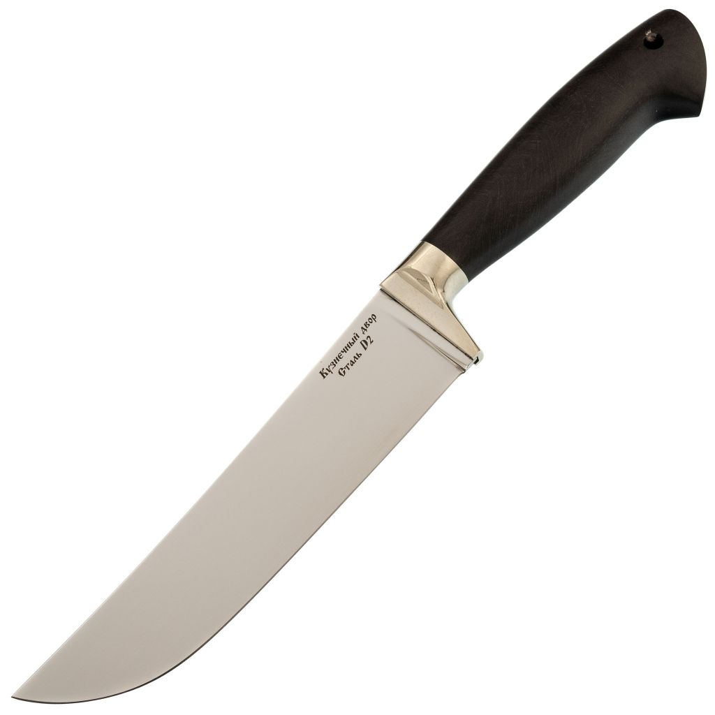 НОЖ УЗБЕК, СТАЛЬ D2, РУКОЯТЬ ГРАБ сочетает в себе элегантность ножа пчака, универсальность тактического кухонника и надежность большого лагерного ножа. Если вы предпочитаете иметь один нож на все случаи жизни, мы рекомендуем обратить внимание на эту модель. Нож выполнен в лаконичной стилистике — черная рукоять и серый стальной клинок. Бочкообразная рукоять с глубокими подпальцевыми выемками обеспечивает уверенную фиксацию в процессе работы. Если планируется активное использование ножа в полевых условиях, то рекомендуется использовать темляк или страховочный подвес — для этого есть соответствующее отверстие в тыльной части рукояти. Клинок из твердого инструментального сплава обладает оптимальным соотношением «вязкость-упругость», за счет чего нож можно использовать для выполнения силовой работы.