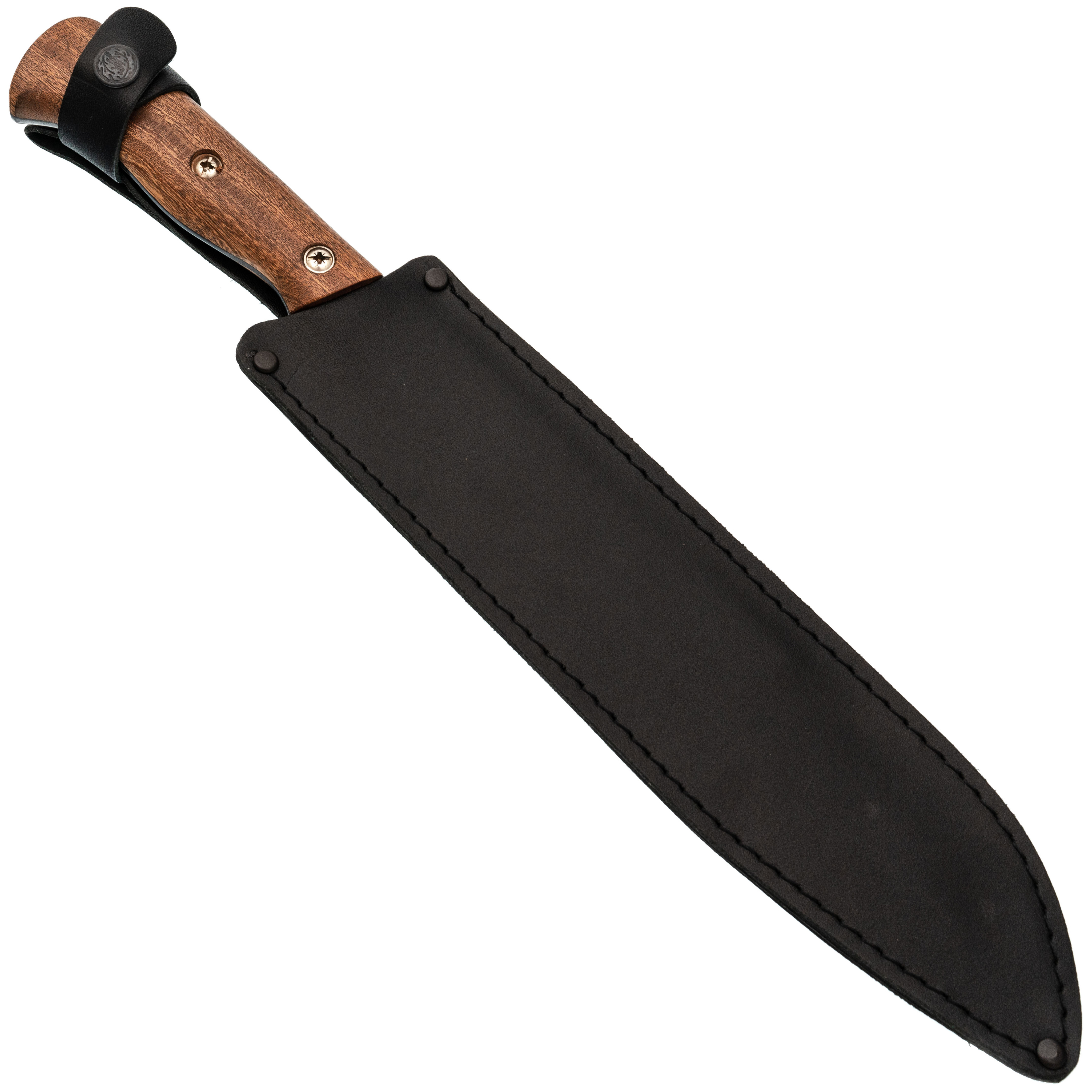 Ножны выполнены из кожи, с жёстким подвесом - инструмент сидит плотно и не болтается. Для дополнительной фиксации есть хлястик, перехватывающий рукоять. Всё просто и надёжно: достал, поработал, убрал без лишних движений.