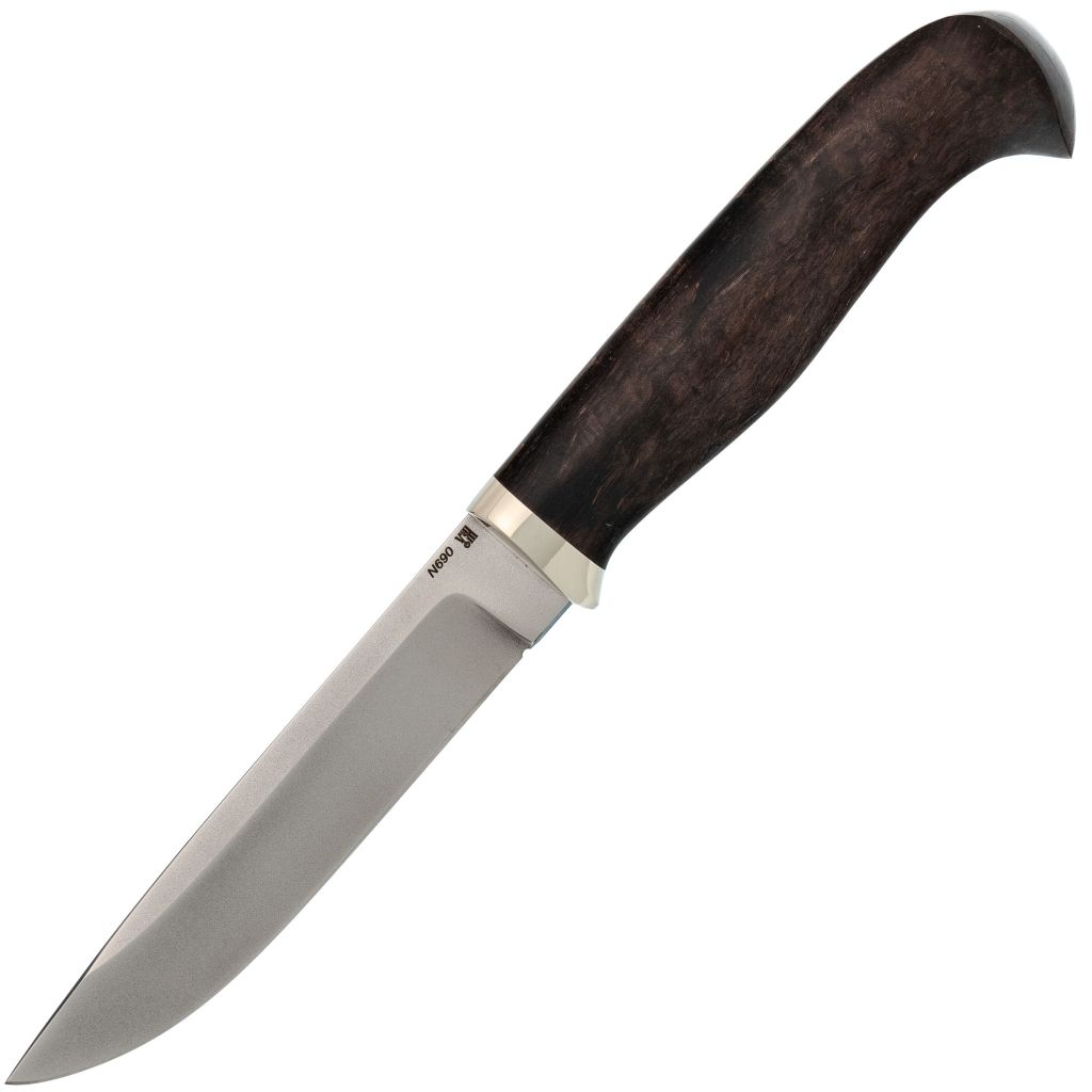 Финка — это классический универсальный туристический нож, известный своей практичностью и функциональностью. Исполнение финки от мастерской Ульданова отличается высоким качеством изготовления, продуманной обработкой каждого элемента и привлекательным внешним видом. Комплект поставки включает превосходные ножны, идеально дополняющие нож и обеспечивающие его безопасное хранение и транспортировку.Клинок ножа выполнен из стали N690 — одной из лучших нержавеющих сталей в своём классе. Этот материал долго держит заточку и устойчив к коррозии, что делает его оптимальным выбором для универсального применения. Клинок имеет высокие спуски на две трети длины, что обеспечивает баланс между отличными режущими характеристиками и достаточной прочностью. Универсальный профиль клинка с прямым обухом позволяет эффективно выполнять широкий спектр задач, от резки до строгания.Рукоять ножа изготовлена из стабилизированной берёзы, обладающей высокой прочностью, влагостойкостью и красивой текстурой. Эргономичная форма рукояти с традиционным грибком на навершии обеспечивает удобный захват и комфортную работу финским хватом. Сквозной монтаж, при котором хвостовик проходит через всю рукоять, делает нож надёжным и прочным, готовым к серьёзным нагрузкам.Ножны — гордость мастерской. Они выполнены из толстой кожи растительного дубления, что гарантирует долговечность и прочность изделия. Погружная конструкция ножен формуется индивидуально под каждый нож, обеспечивая его надёжное удержание. Свободный подвес позволяет ножу свободно двигаться при ходьбе, не стесняя движения и сохраняя удобство использования.