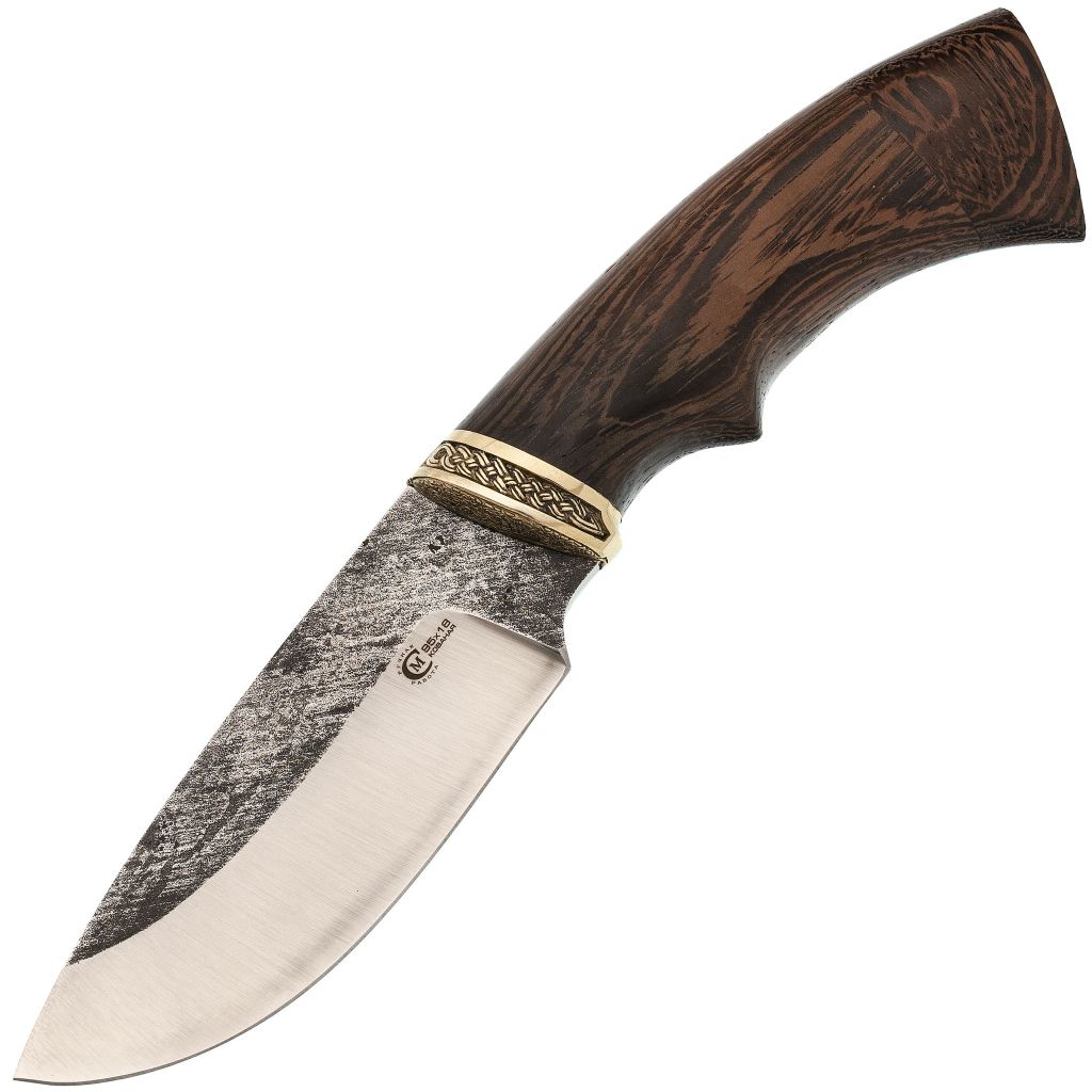 Разделочный нож от мастерской Сёмина - это компактный и универсальный инструмент, идеально подходящий для обработки мяса и рыбы. Его широкая геометрия клинка позволяет с легкостью разделывать туши, а также делает нож многофункциональным, пригодным для использования в походных условиях.Клинок изготовлен из высококачественной стали 95Х18, что обеспечивает оптимальное сочетание коррозионной стойкости и прочности. Такая сталь легко затачивается даже в полевых условиях, что важно для поддержания ножа в рабочем состоянии. Высокие прямые спуски и широкая форма клинка обеспечивают отличную режущую способность, позволяя легко и эффективно выполнять разделочные работы. Следы ковки на поверхности придают ножу уникальный, слегка брутальный внешний вид.Рукоять из древесины венге сочетает в себе легкость, прочность и традиционный стиль. Этот материал не холодит руку в холодное время года, обеспечивая комфортную работу. Эргономичная форма рукояти позволяет уверенно удерживать нож даже при длительном использовании, не вызывая усталости. Конструкция рукояти позволяет перехватывать нож ближе к режущей кромке для более точных и тонких манипуляций.Ножны, выполненные из натуральной кожи, надежно фиксируют нож благодаря погружной конструкции. Жесткий подвес обеспечивает удобство ношения и быстрый доступ к ножу. Такое сочетание функциональности и естественной красоты материалов делает этот нож отличным выбором для профессионалов и любителей.