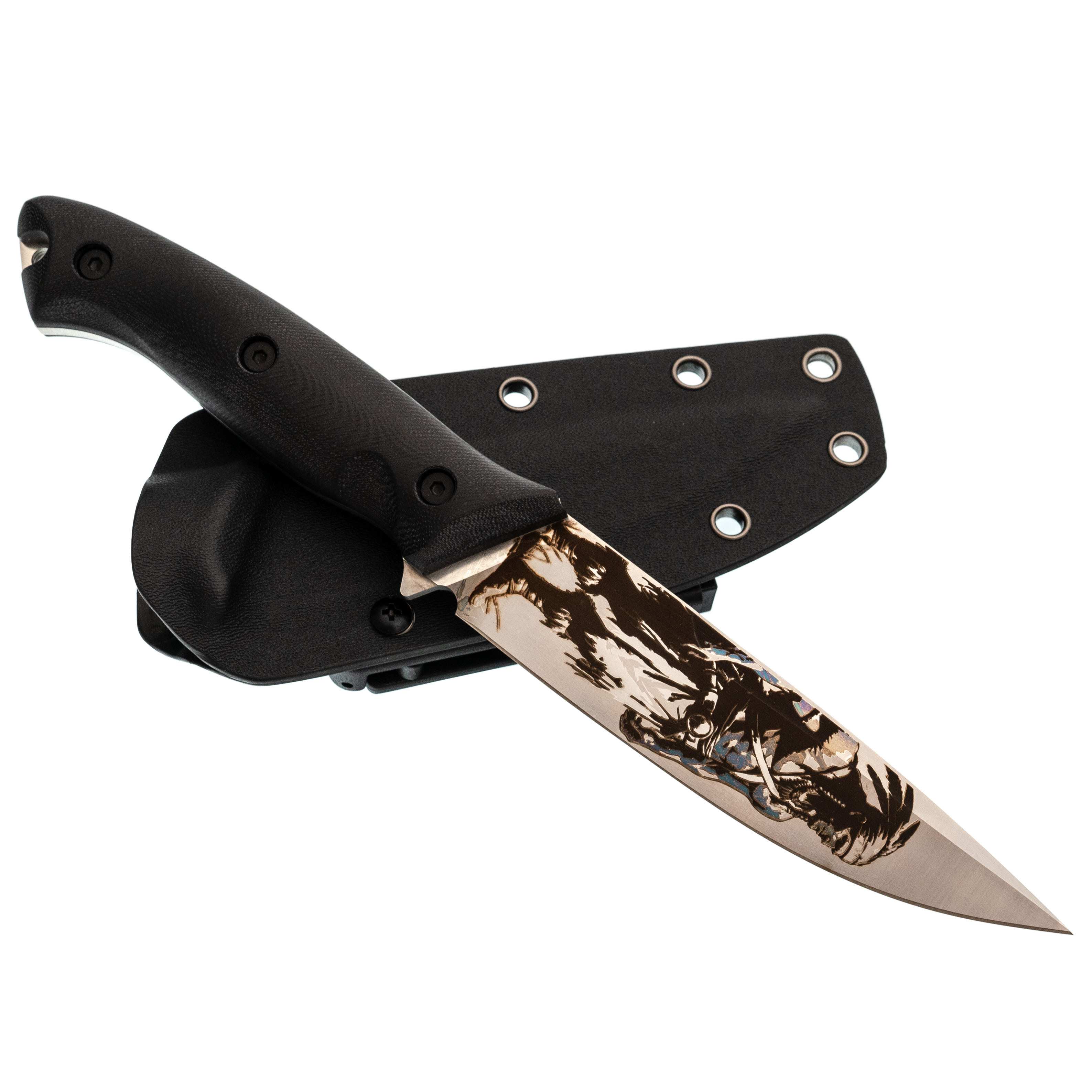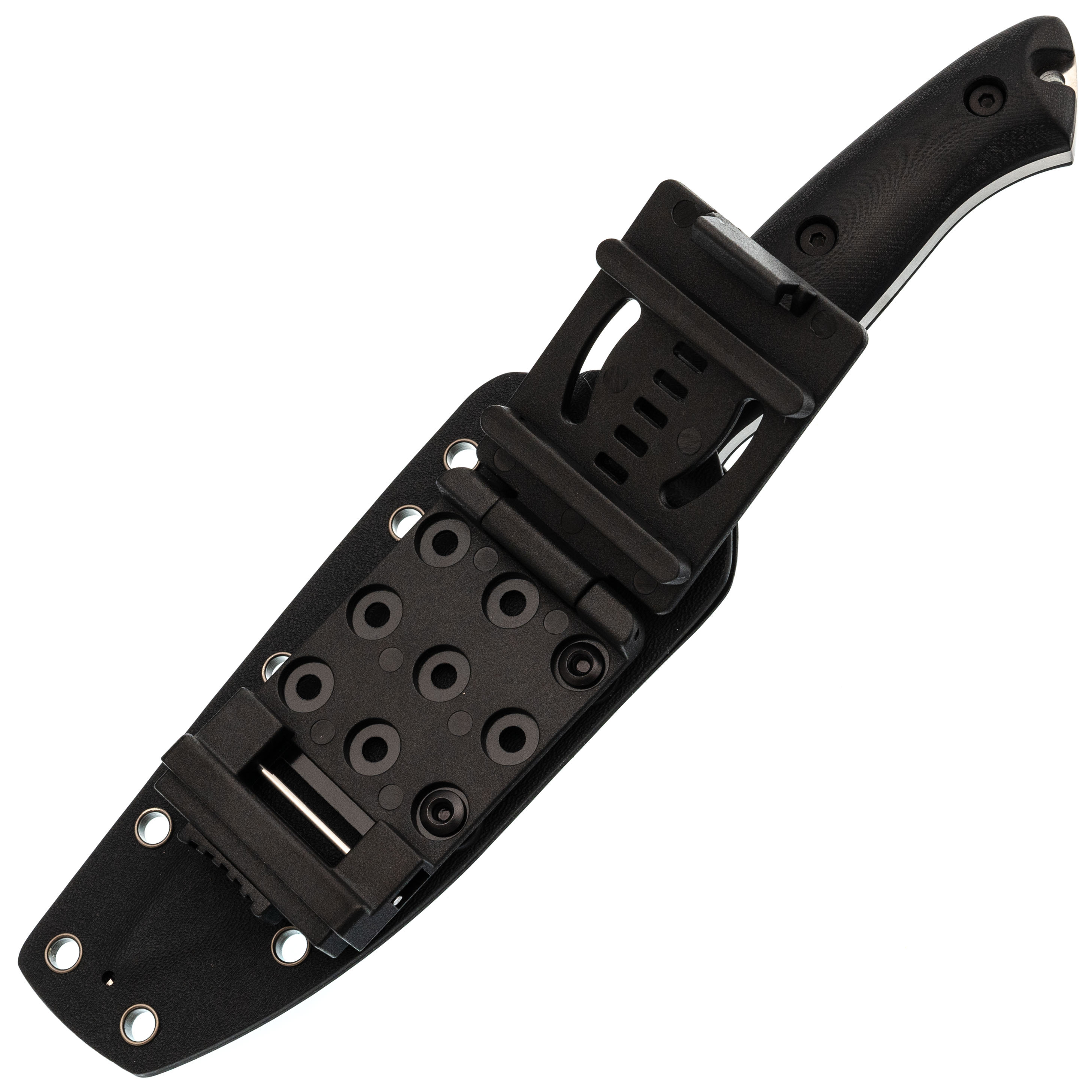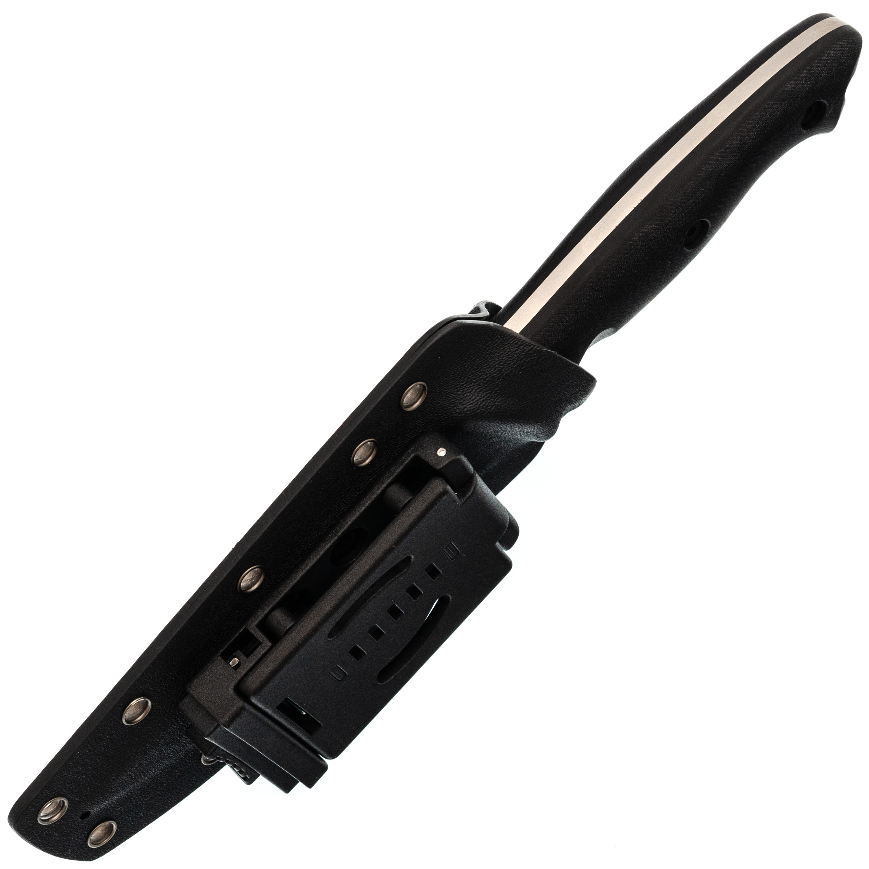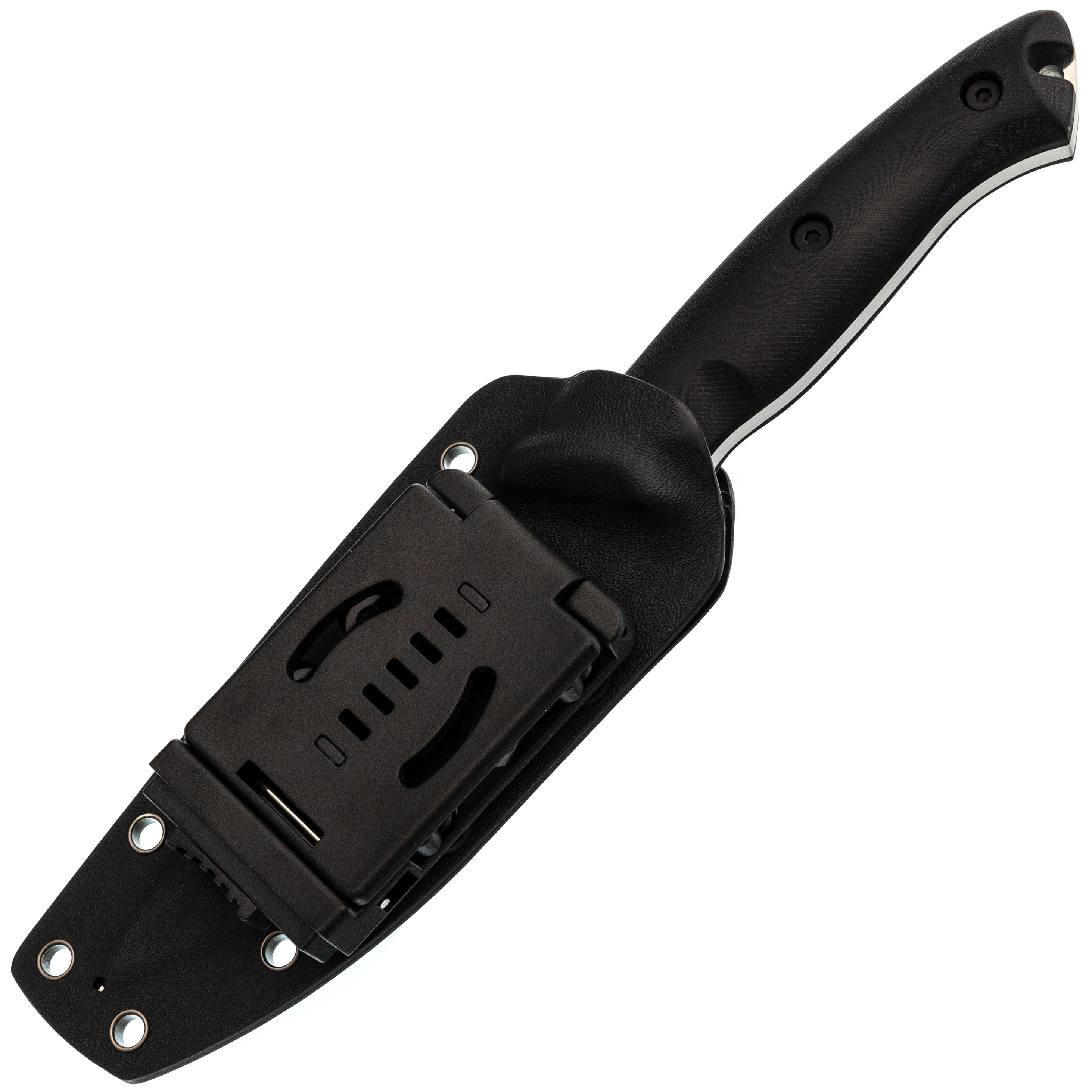Рукоять с плавным изгибом и толстыми скруглёнными накладками отлично заполняет ладонь. Цепкая фрезеровка помогает удерживать нож без напряжения, даже при долгой работе. Есть темлячное отверстие для тех, кто любит дополнительную фиксацию. Ножны из Kydex комплектуются креплением Tek Lok - можно носить на ремне так, как удобнее: вертикально или горизонтально.