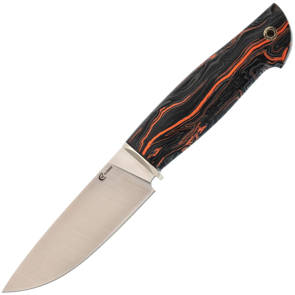 Нож «Сокол» от мастерской Сёмина – это высококлассный охотничий инструмент, в котором каждая деталь тщательно продумана для выполнения специфических задач охоты. Конструкция ножа демонстрирует максимальное внимание к функциональности, а превосходное качество изготовления гарантирует надежность в любых условиях.Лезвие выполнено из стали M398, признанной одной из лучших порошковых нержавеющих сталей. Благодаря такому материалу клинок сохраняет остроту на протяжении длительного времени, обладает исключительной твердостью и устойчив к коррозии. Его широкая форма с плавным переходом от лезвия к обуху обеспечивает эффективное резание и строгание, а ручная сатиновая отделка придает изделию дополнительное эстетическое очарование.Рукоять ножа изготовлена из авторской слоёной микарты – материала, отличающегося приятной глазу неоднородной текстурой. Эта микарта устойчива к воздействию влаги и перепадам температур, что делает ее идеальной для экстремальных условий эксплуатации. Кроме того, естественная шершавость поверхности обеспечивает надежный и удобный захват, позволяя работать с ножом продолжительное время без усталости.Ножны выполнены из качественной кожи, что гарантирует удобство ношения и долговечность аксессуара. Они представлены в двух вариантах крепления – с жестким и свободным подвесом, что позволяет выбрать наиболее комфортный способ переноски в зависимости от личных предпочтений и условий использования.