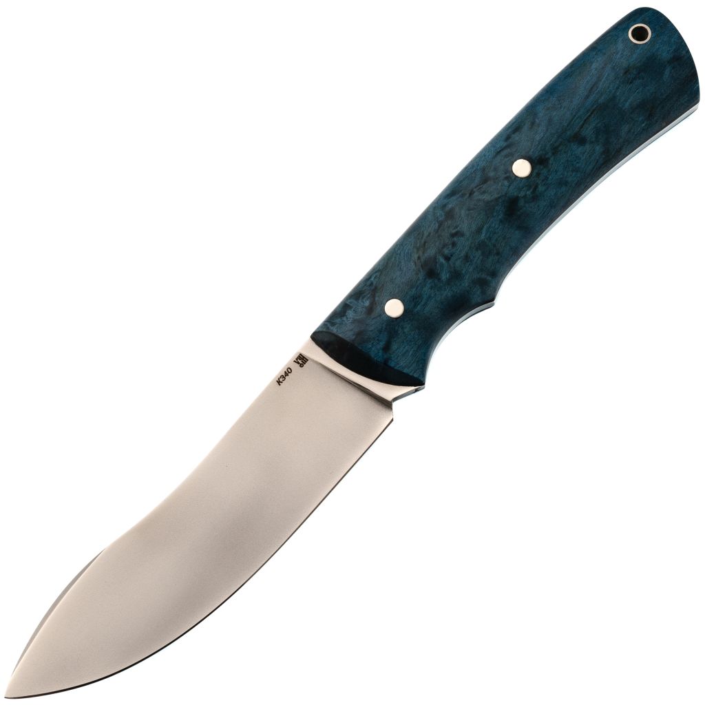 Клинок: сталь K340 (австрийская, производитель Bhler). Это особая сталь, которую редко встретишь в серийных ножах. Она твердая, но при этом не хрупкая. Благодаря мелкозернистой структуре, лезвие долго держит заводскую заточку. Для шкуросъёмника это принципиально: не надо править нож каждые пять минут. K340 хорошо сопротивляется истиранию и при этом допускает тонкий подвод - режущая кромка получается острой и стойкой.