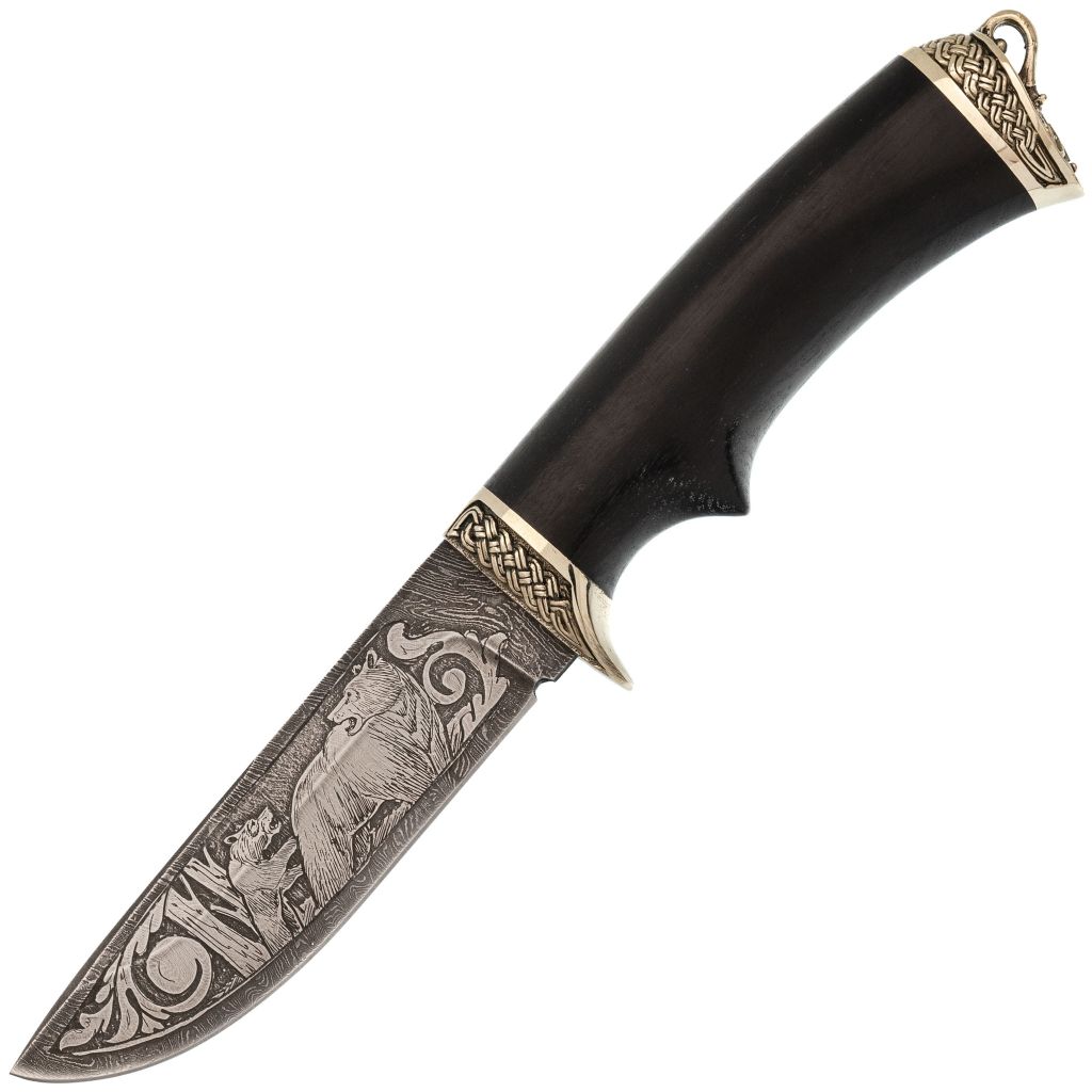 Лезвие изготовлено из дамасской стали, которая обладает неповторимым рисунком, отличающим ее от обычных сталей. Процесс художественного травления, использованный в дизайне, требует высокого мастерства, придавая ножу еще большую ценность. Несмотря на свою декоративность, нож остается практичным и функциональным инструментом.Материал рукояти - прочное африканское дерево граб, окрашенное в черный цвет, создает контраст с литьем из мельхиора, имеющим серебристо-желтый оттенок. Такое сочетание делает нож не только удобным в использовании, но и эстетически привлекательным. Грация и утонченность этого ножа не оставят равнодушными ценителей красоты и качества.Нож поставляется в качественных кожаных ножнах, что обеспечивает удобство и безопасность при переноске. Егерь - это не просто практичный инструмент, но и отличный подарок для тех, кто любит природу и активный отдых. Его универсальность, красота и надежность делают его желанной находкой для любого путешественника.