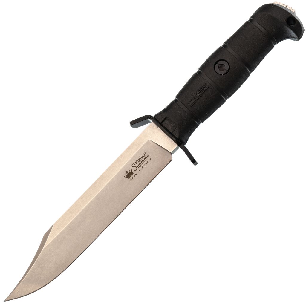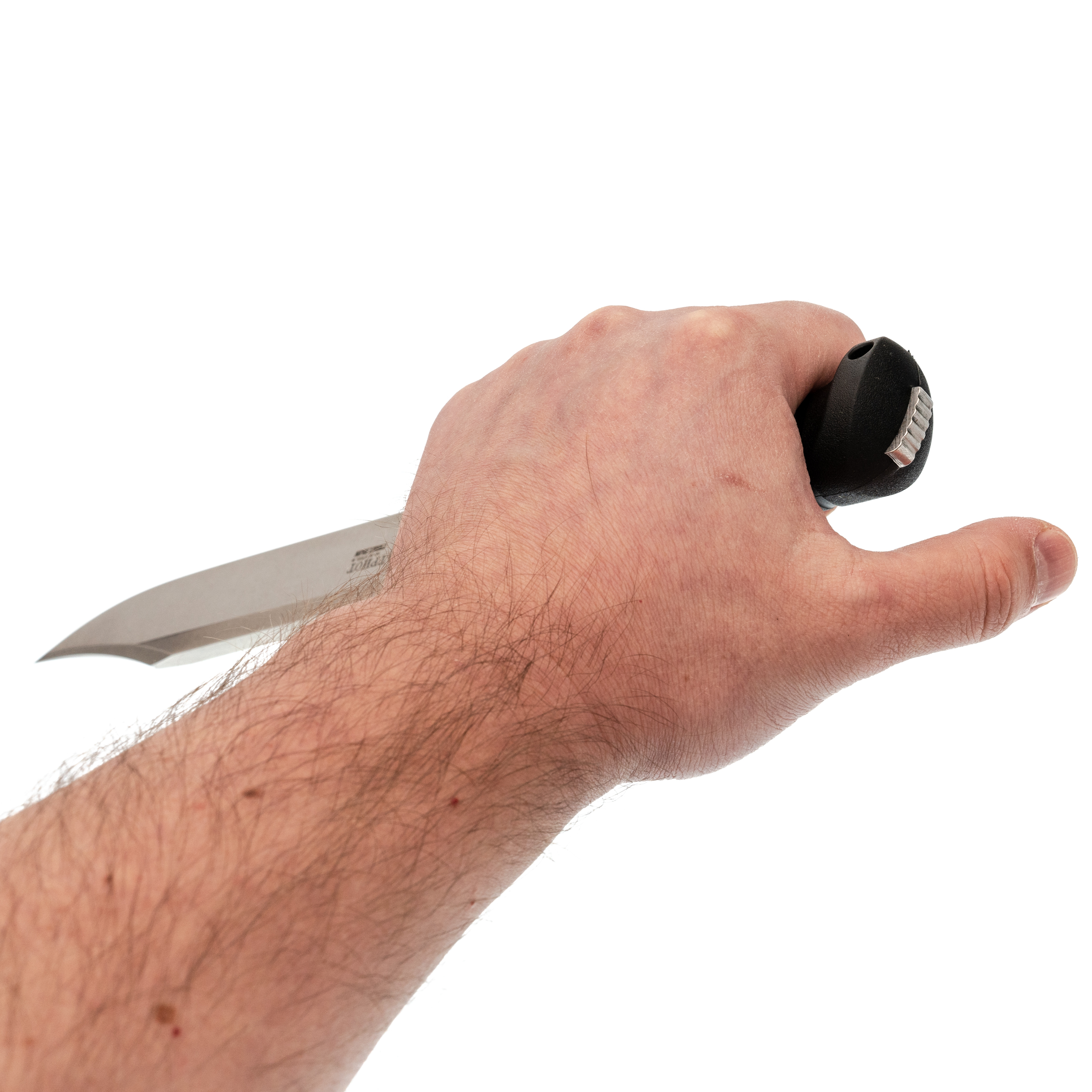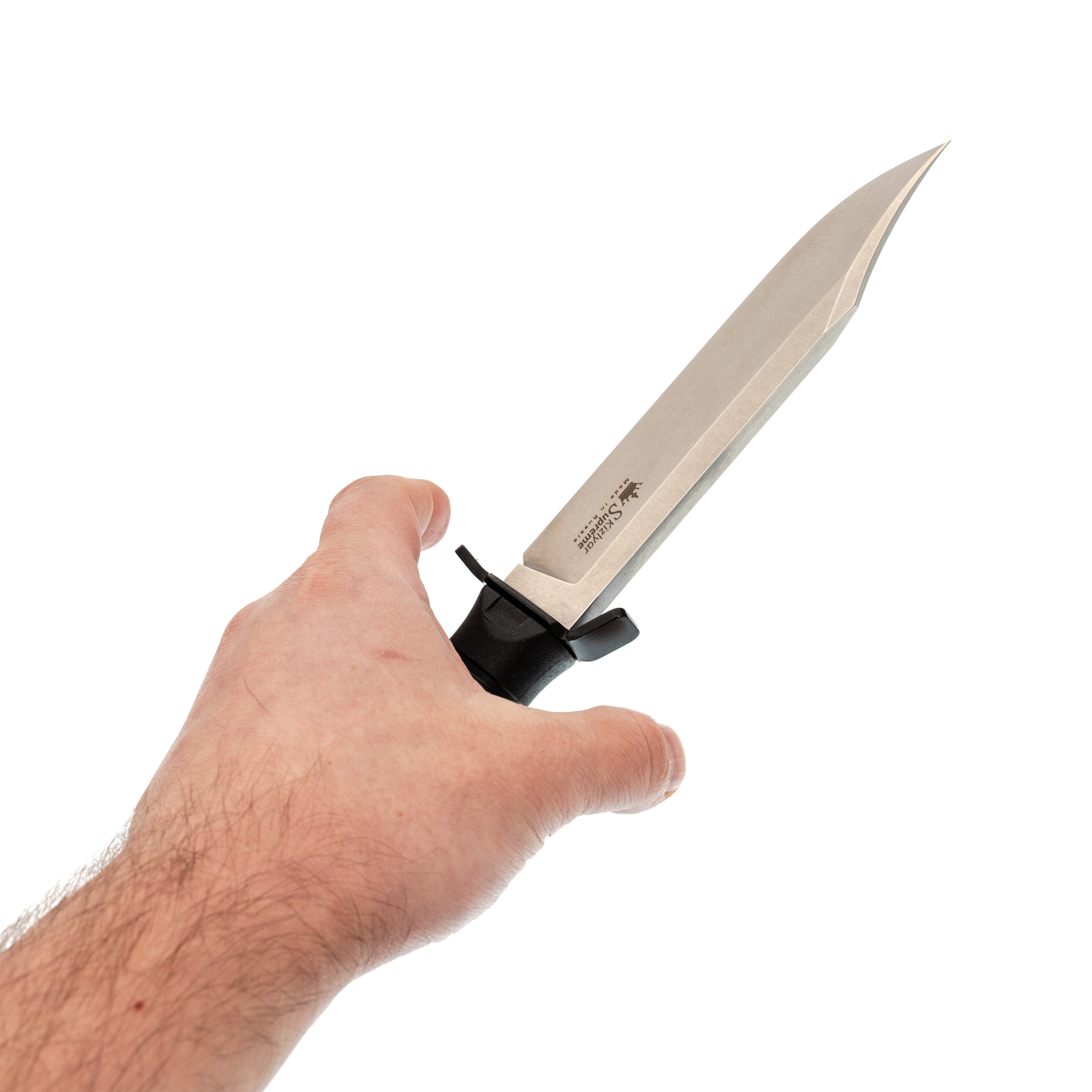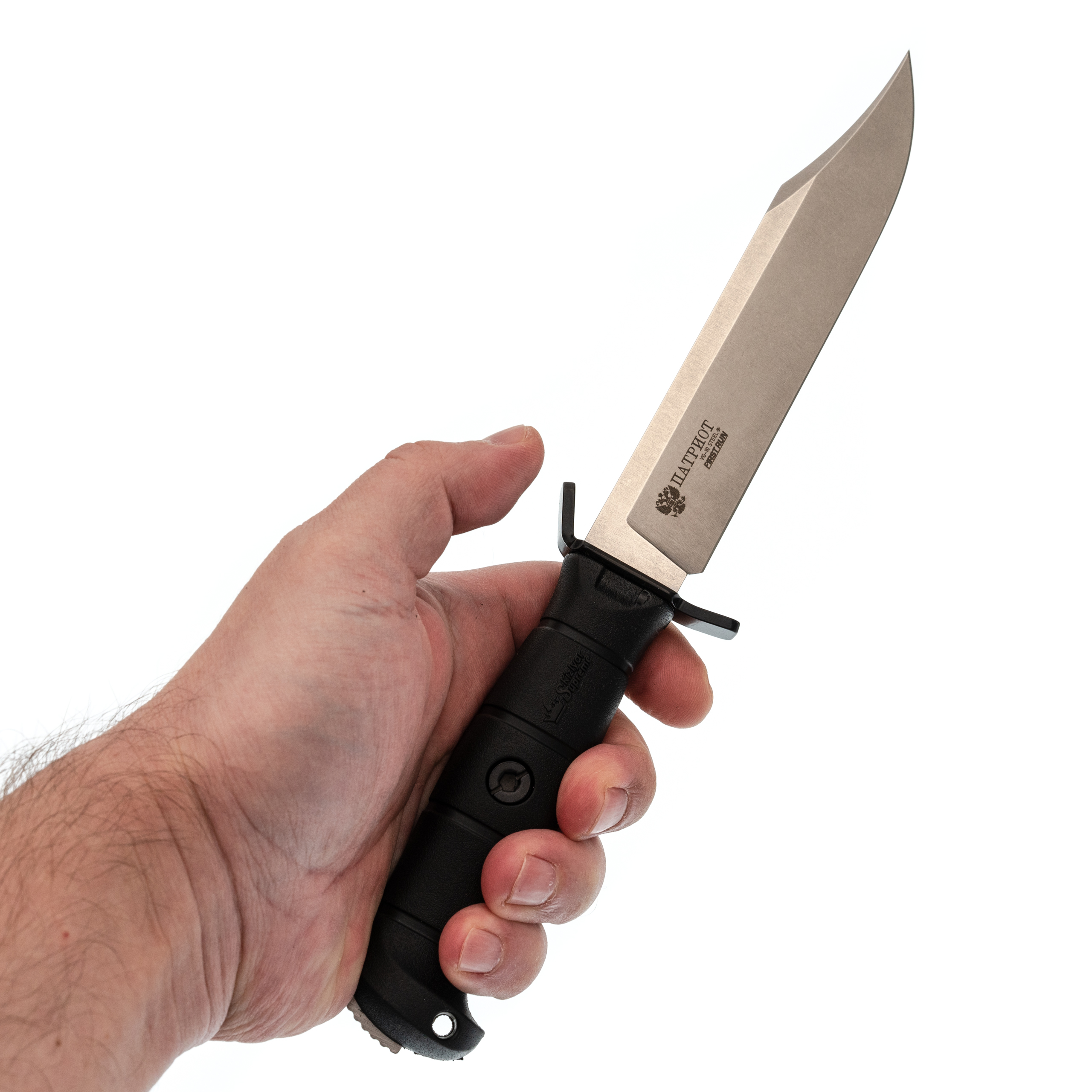 Форма рукояти спроектирована так, чтобы заполнить ладонь без пустот. Текстура кратона цепкая, но не натирает мозоли при длительной работе. Сквозной хвостовик проходит через всю рукоять и закреплен на винт - это классическая гарантия того, что нож не развалится даже при очень интенсивной нагрузке. Отдельно стоит выделить полноразмерные упоры: они надежно стопорят кисть, не давая руке соскользнуть на лезвие при мощном колющем или рубящем движении.
