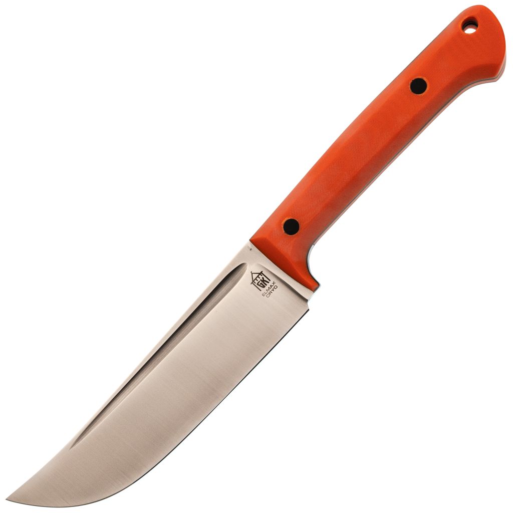 Рукоять хорошо ложится в руку и сделана с правильной посадкой относительно клинка: она вынесена выше, поэтому ножом удобно работать на доске или другой поверхности. Такая форма помогает лучше контролировать рез и дополнительно убирает риск соскальзывания руки вперёд. Оранжевый G10 хорошо заметен в большинстве условий, так что нож проще держать в поле зрения на кухне или в лагере. Монтаж выполнен по схеме скрытого Full-Tang: запас прочности у конструкции хороший, а сама рукоять ощущается цельной и не даёт лишнего холода в ладонь.