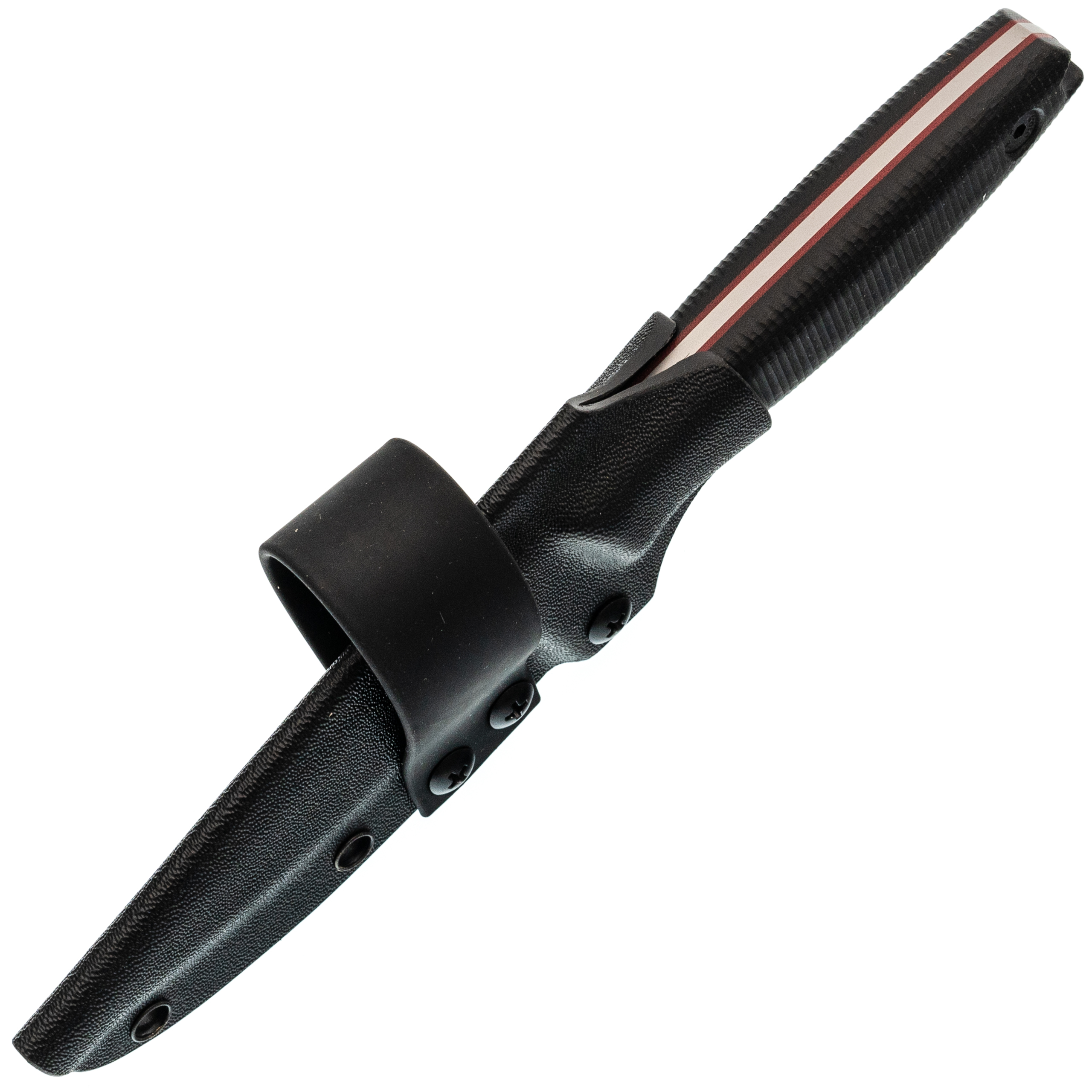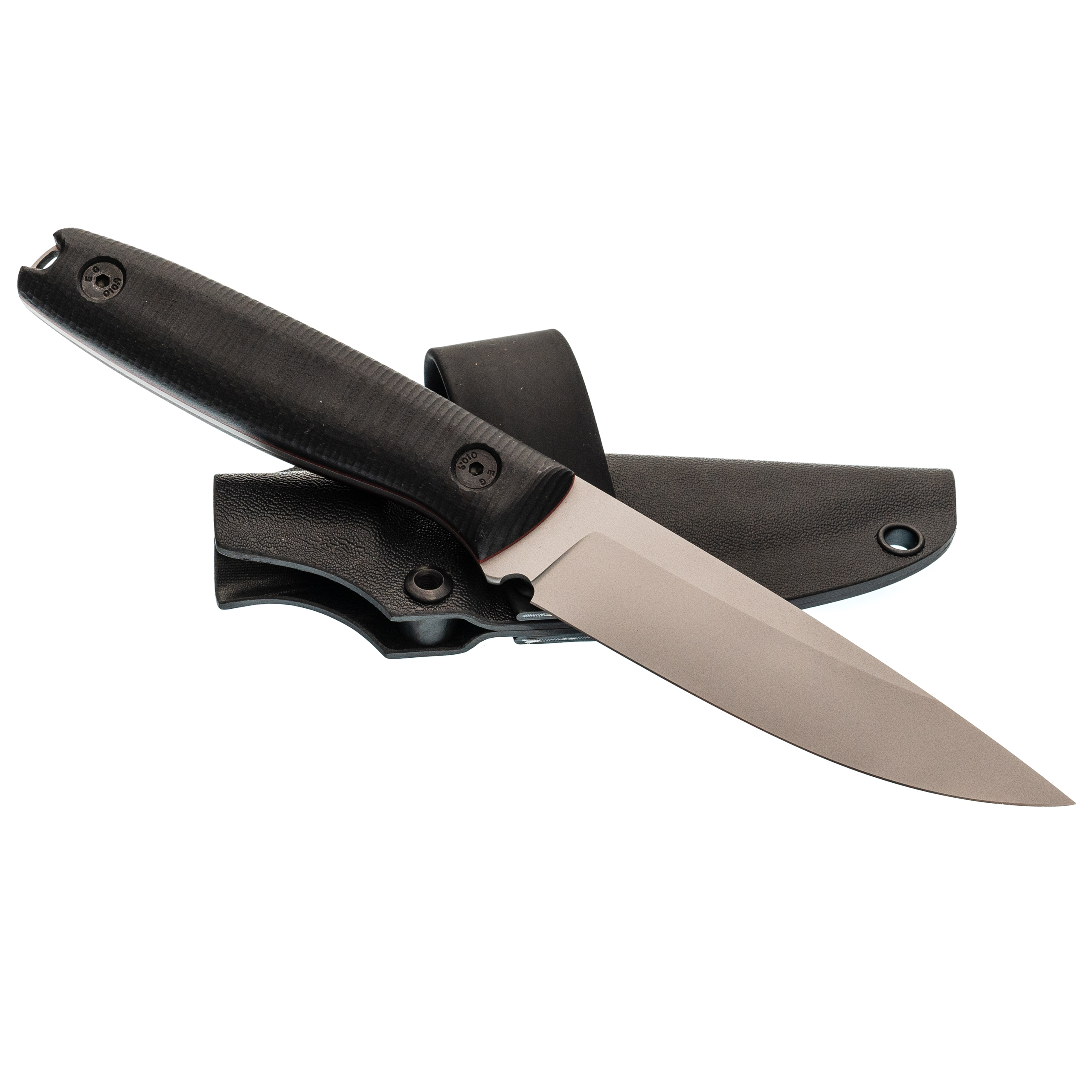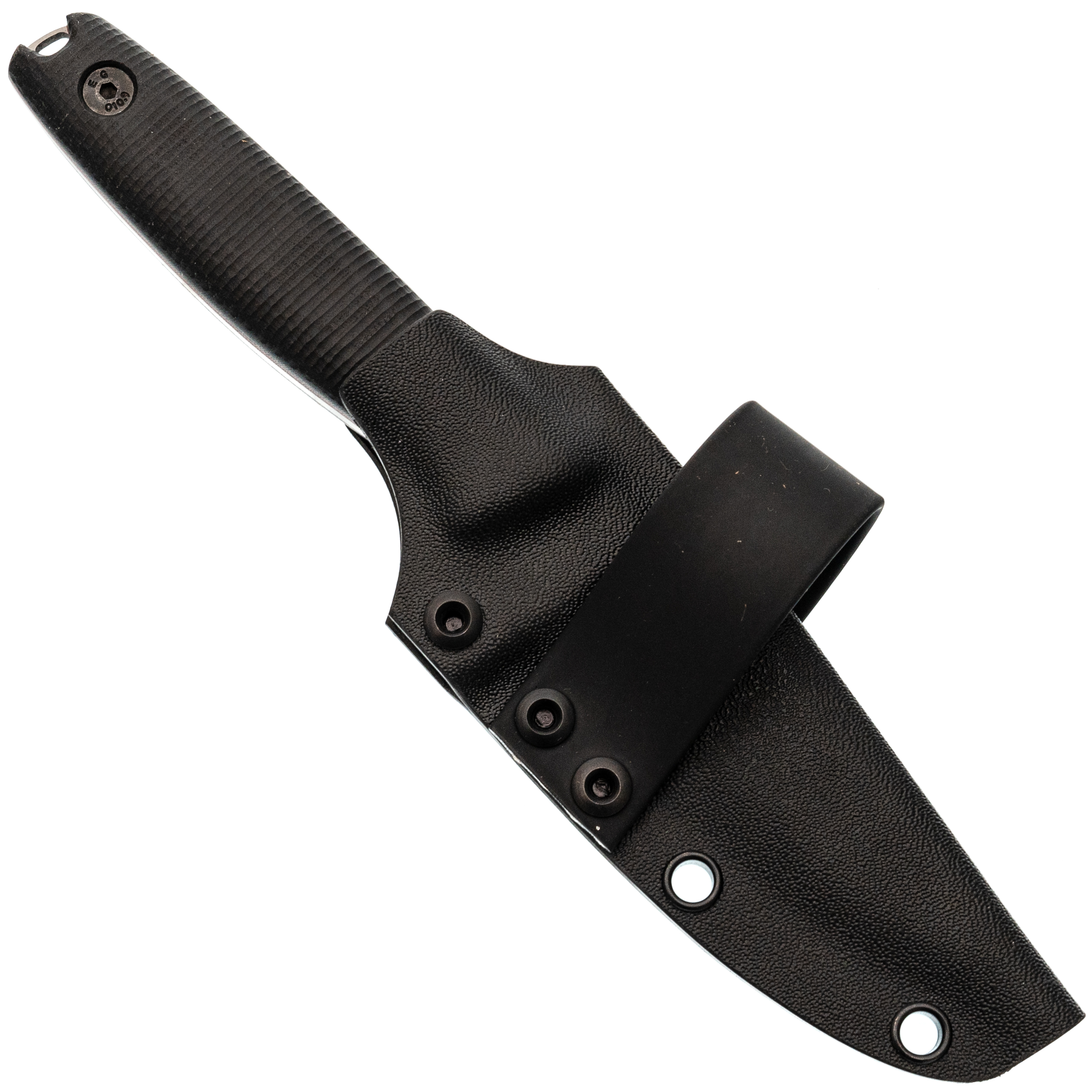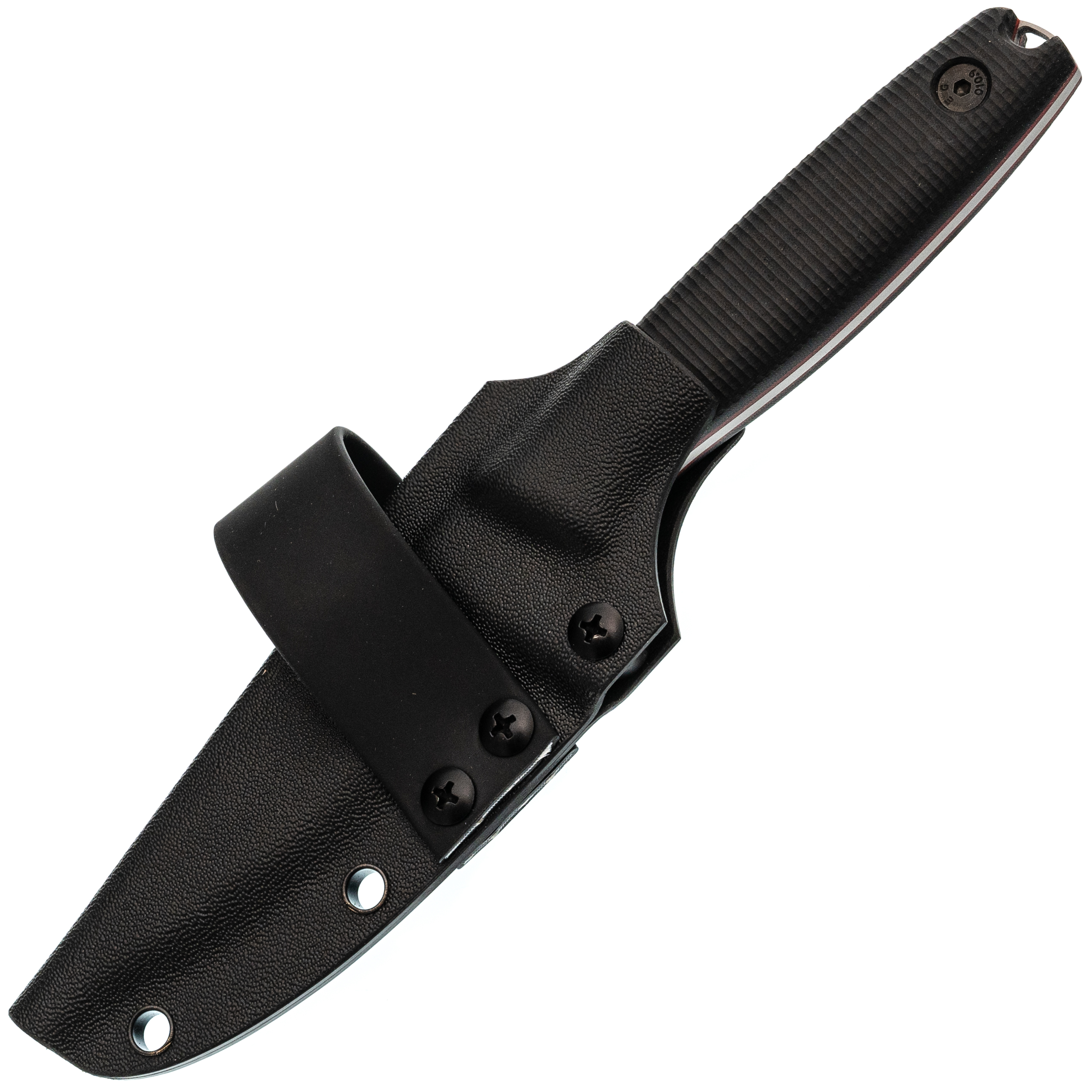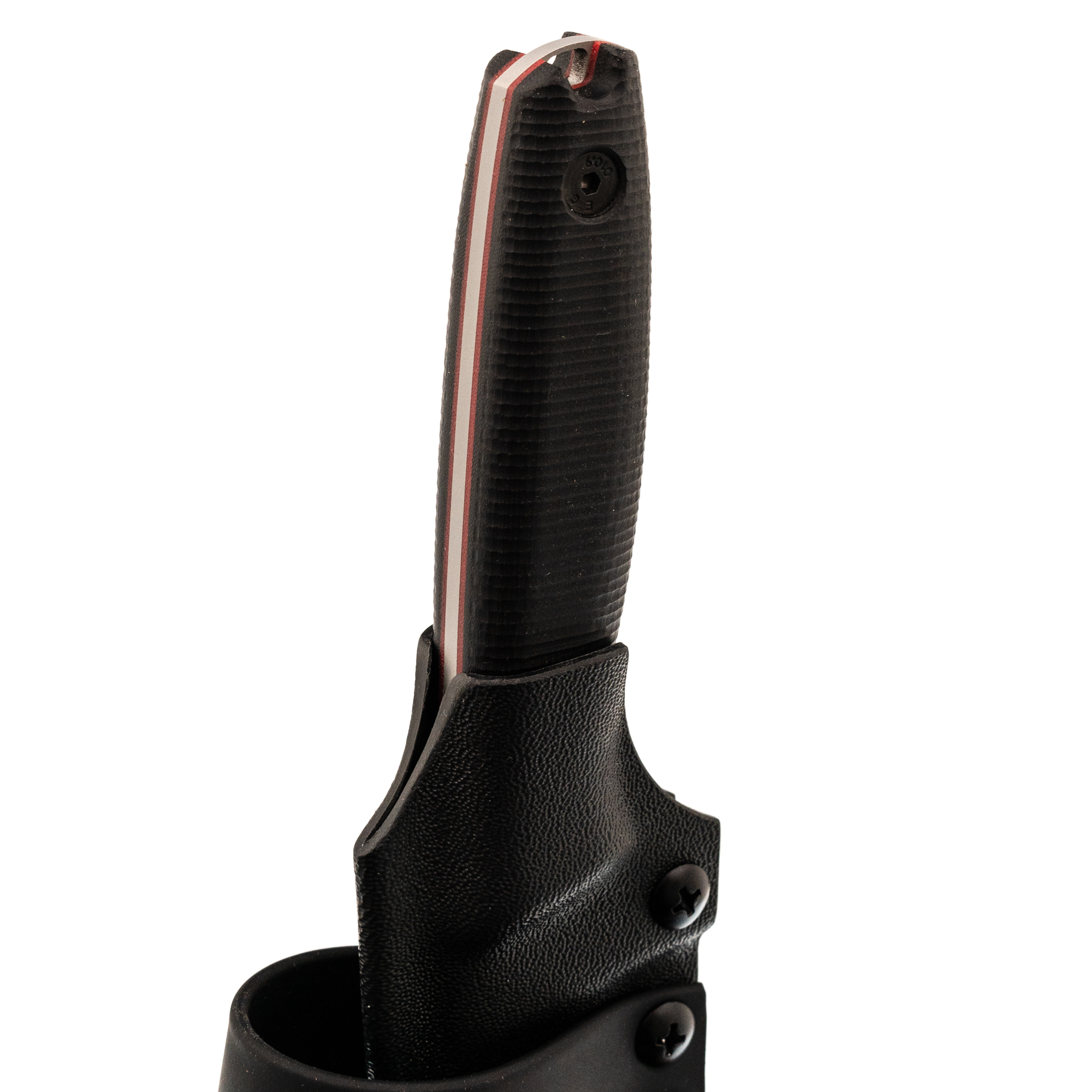 Ножны из Kydex сделаны по схеме «тако»: один лист материала сложен пополам, поэтому конструкция получилась лёгкой и компактной. Нож фиксируется плотно, не гремит и уверенно держится даже рукоятью вниз. Для удобного ношения предусмотрена горизонтальная стропа на ремень. Выступ под большой палец помогает быстро извлекать нож, а ПВХ-трубка в устье бережёт режущую кромку от контакта со стенками ножен.