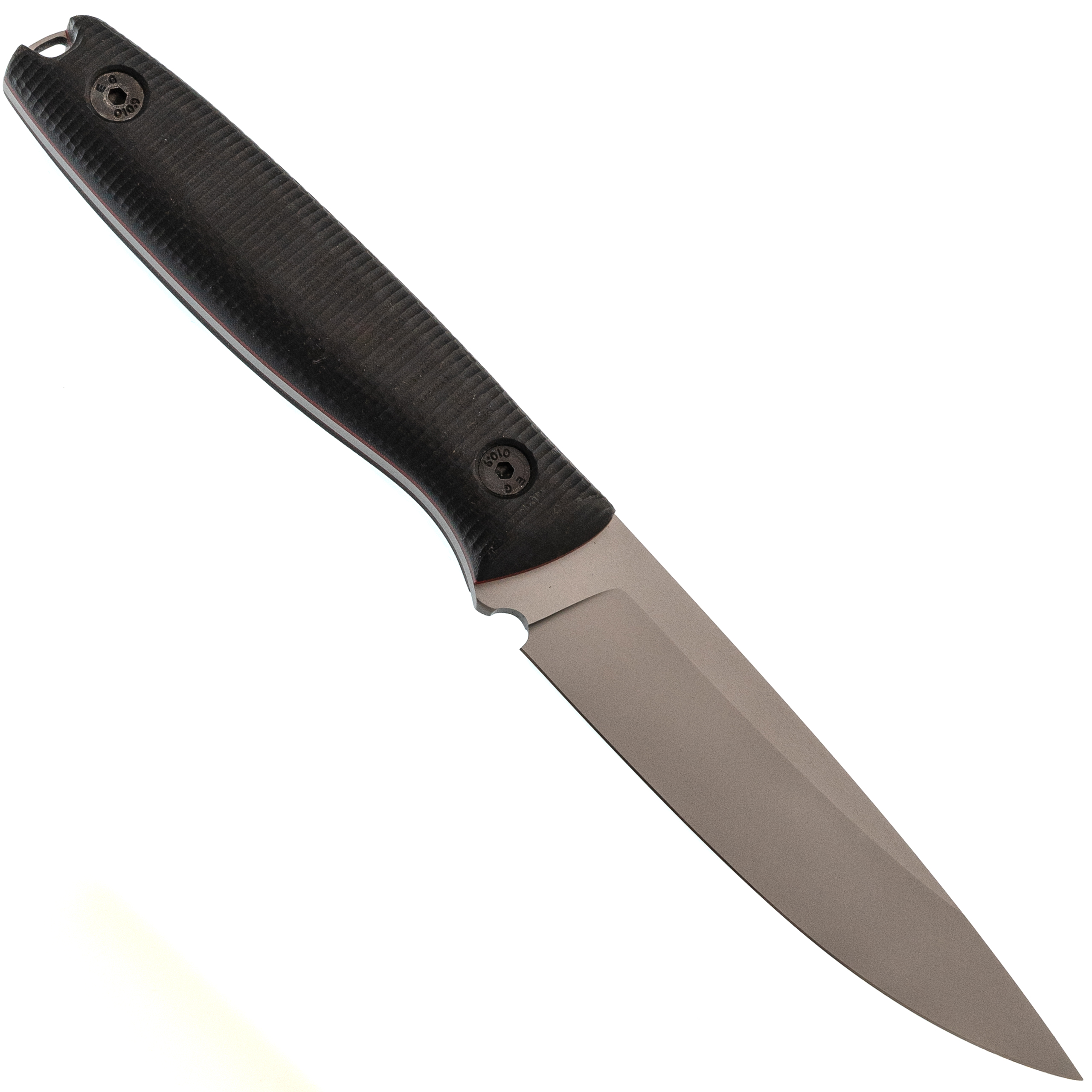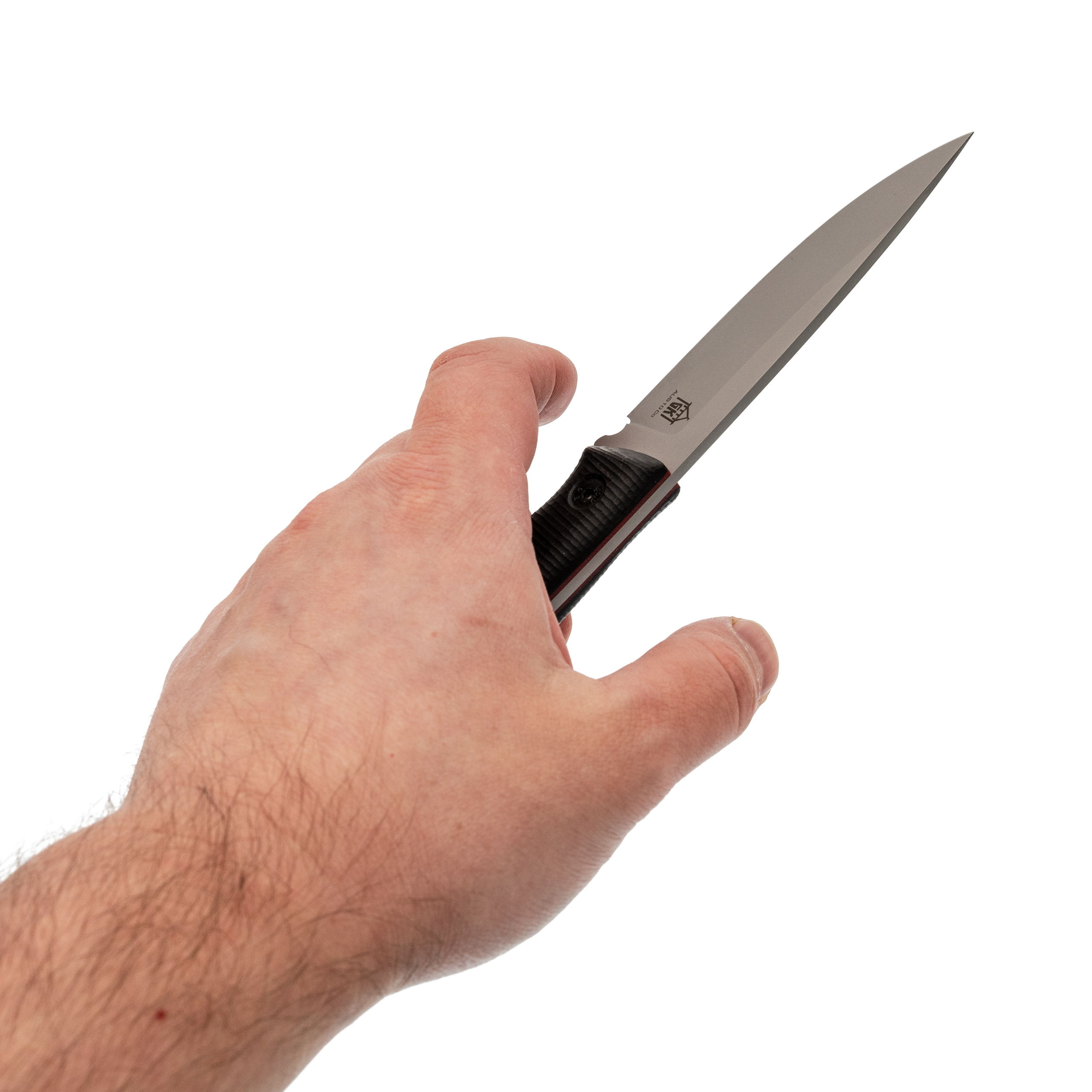 Рукоять хорошо заполняет ладонь и не кажется слишком тонкой. Форма продумана так, чтобы нож уверенно сидел в руке при разной манере хвата. Микарта даёт приятное сцепление сама по себе, а насечка на накладках делает удержание ещё надёжнее. За счёт скрытого цельнометаллического монтажа рукоять ощущается собранной и плотной.