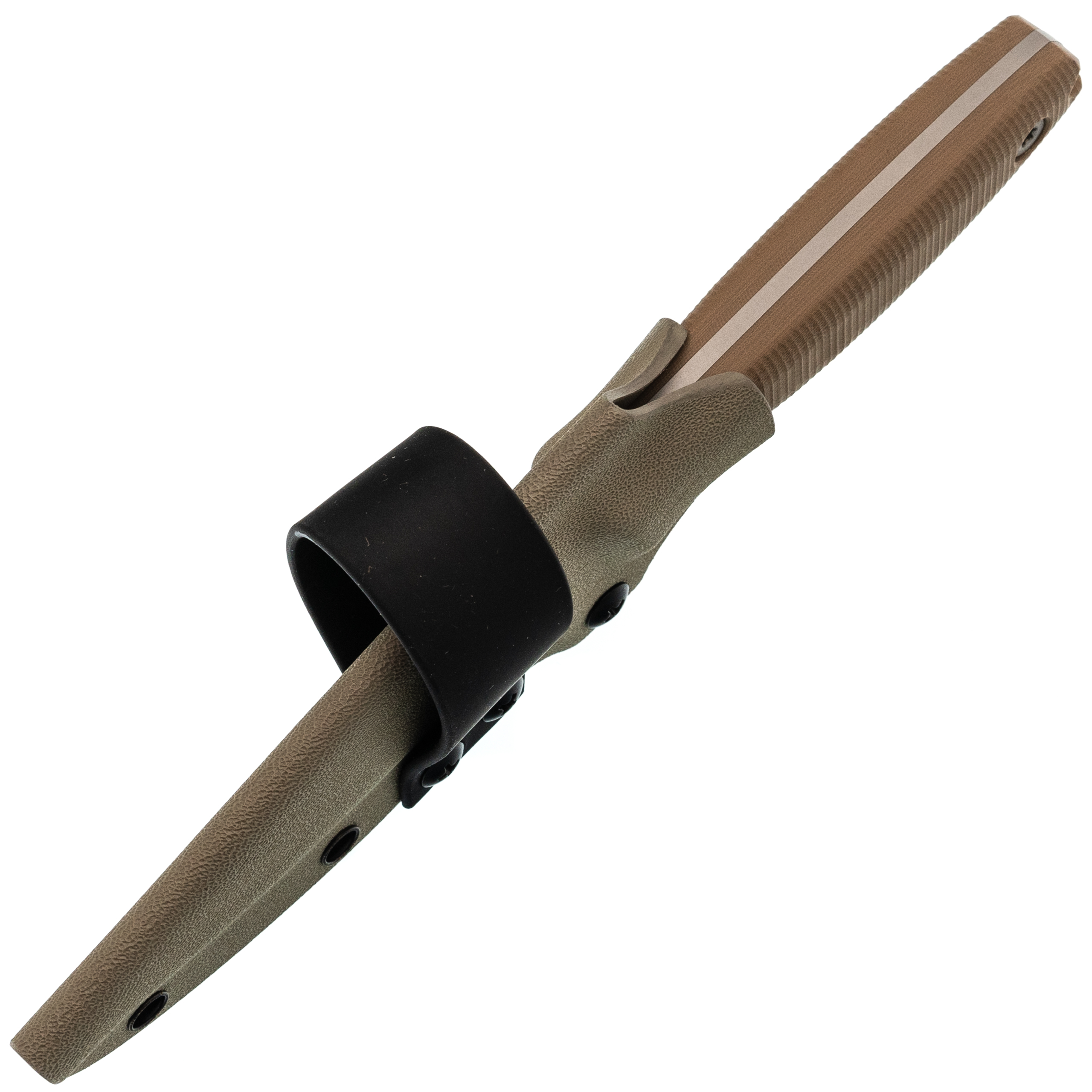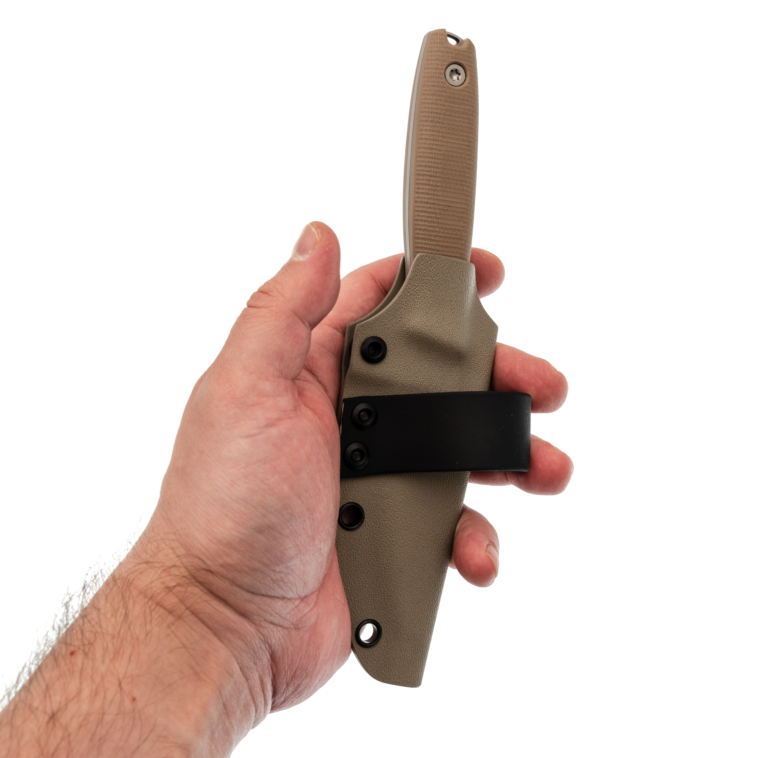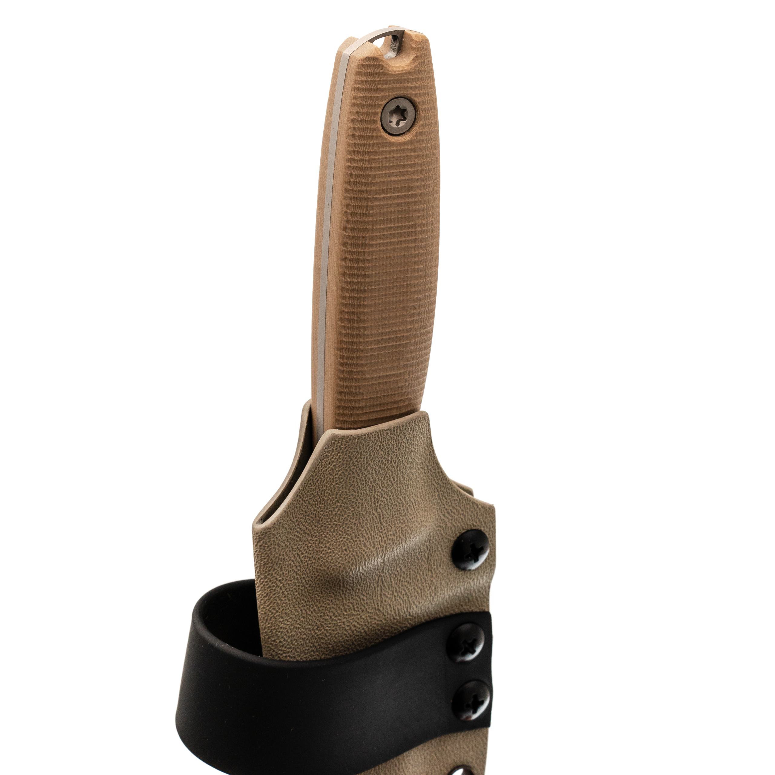 Kydex-ножны сделаны по схеме «тако», за счёт чего они занимают минимум места и не добавляют лишнего веса. Фиксация у ножа плотная и тихая: внутри ничего не болтается, нож держится надёжно даже в перевёрнутом положении. Горизонтальная стропа удобна для ношения на ремне. Для извлечения предусмотрен упор под большой палец, а ПВХ-трубка в зоне устья помогает сохранить заточку, не давая клинку задевать стенки ножен.