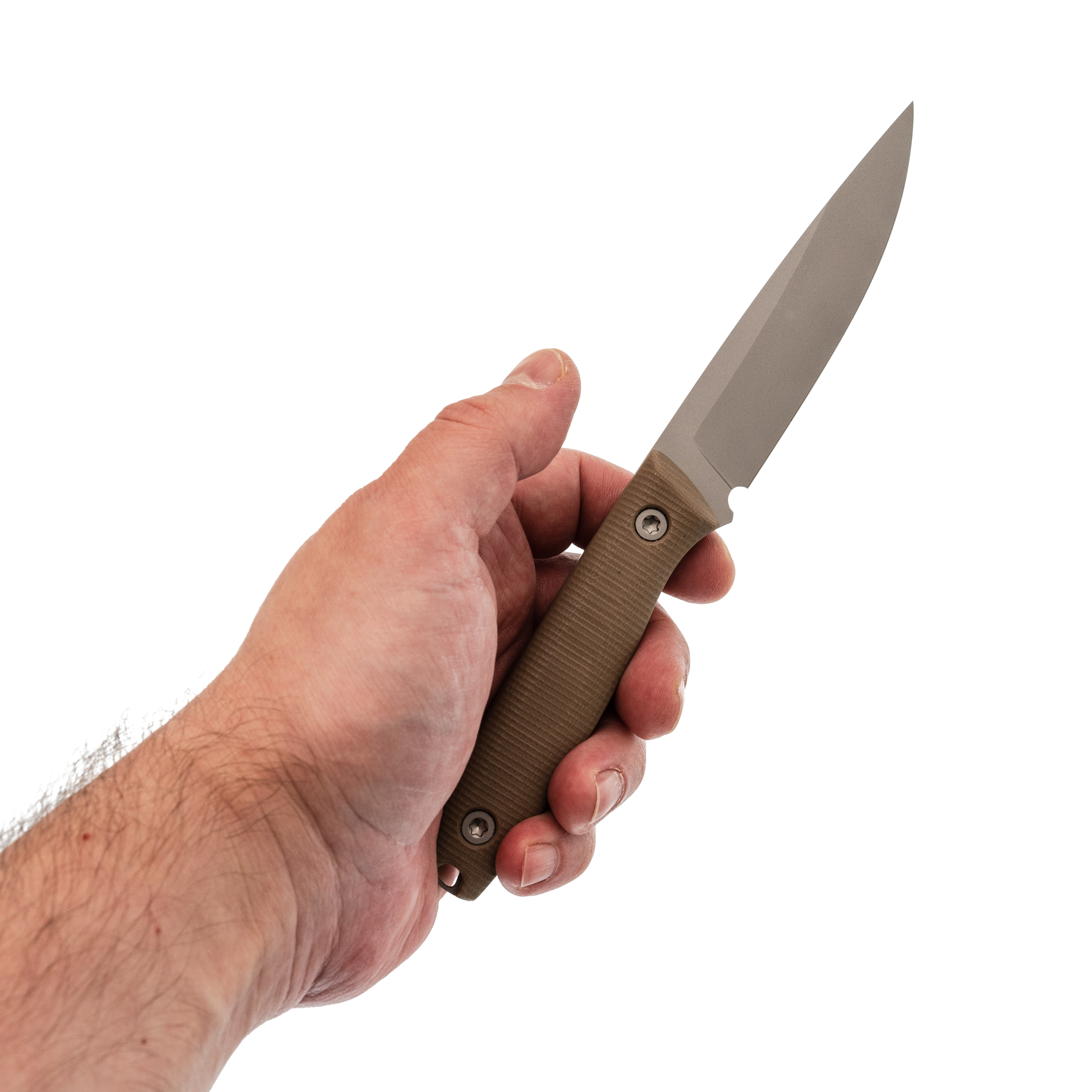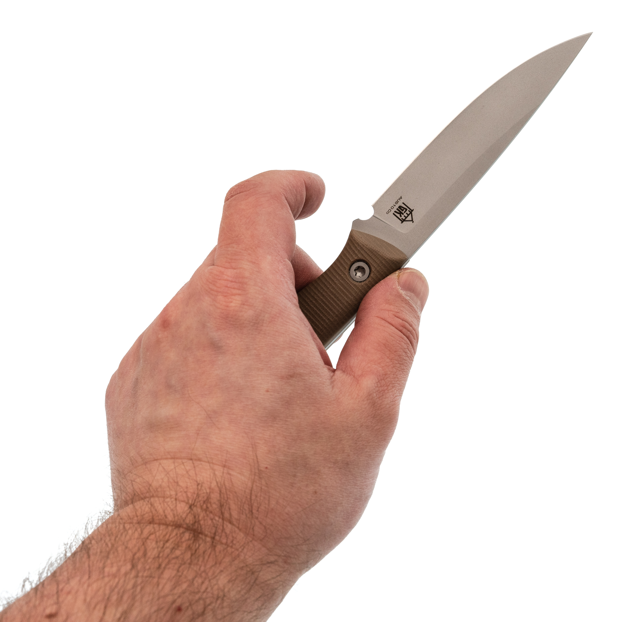 Форма рукояти получилась очень удачной: она хорошо ложится в ладонь и даёт ощущение контроля с первых минут. G10 делает хват стабильным, а насечка на накладках помогает удерживать нож увереннее в разных условиях. Благодаря скрытому цельнометаллическому монтажу рукоять воспринимается цельной, крепкой и при этом комфортной на ощупь.