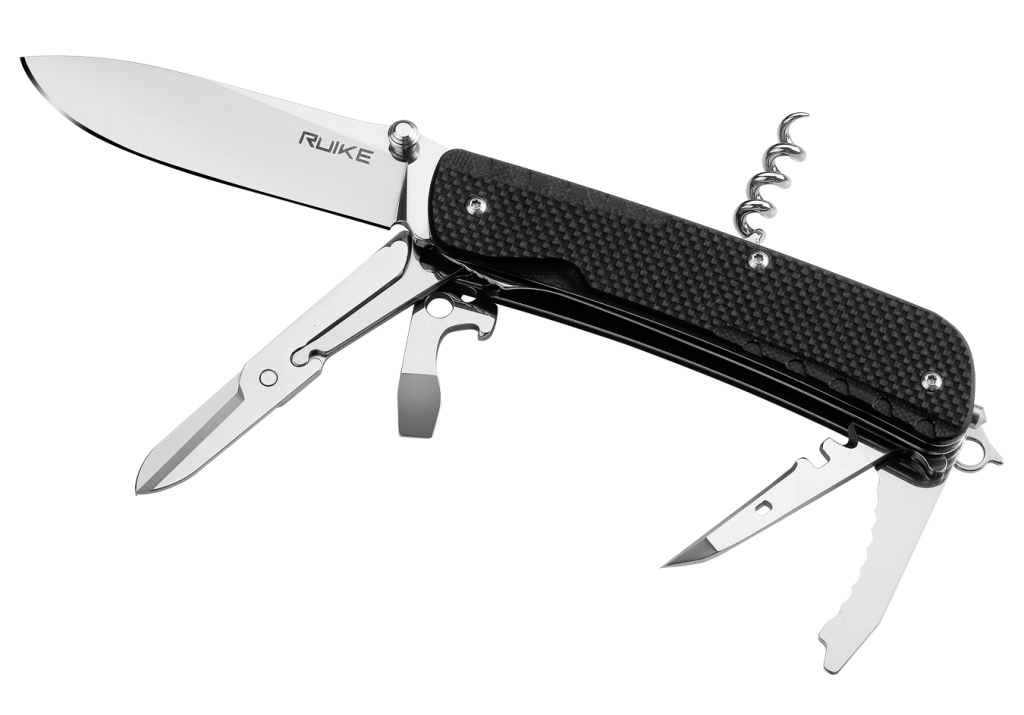 Складной нож Ruike LD31-B оснащен стильной черной рукоятью и множеством полезных инструментов, которые, в отличие от ящика с отвертками, плоскогубцами и ключами, способны уместиться в кармане брюк.Крепкая шведская сталь Sandvik 12C27 клинка и инструментов не подвержена коррозии, сохраняет заточку на долгий период и устойчива к механическим повреждениям. Эргономичная рукоять сделана из композита G10, который не выгорает на солнце и отличается высокой стойкостью к температурным колебаниям.Складной нож-мультитул имеет следующий инструменты: 1. Длинное лезвие с одноруким открытием2. Ножницы3. Инструмент для закручивания проволоки4. Открывалка для бутылок5. Большая отвертка 6,5 мм6. Инструмент для оголения провода7. Скальпель8. Шило9. Инструмент для работы с проводом большего диаметра10. Ключ для велосипедных спиц11. Отверстие для нитки12. Малая отвертка 3 мм13. Стропорез14. Карманная клипса15. Штопор16. Стеклобой17. Кольцо для ключей/ темляка18. Пинцет