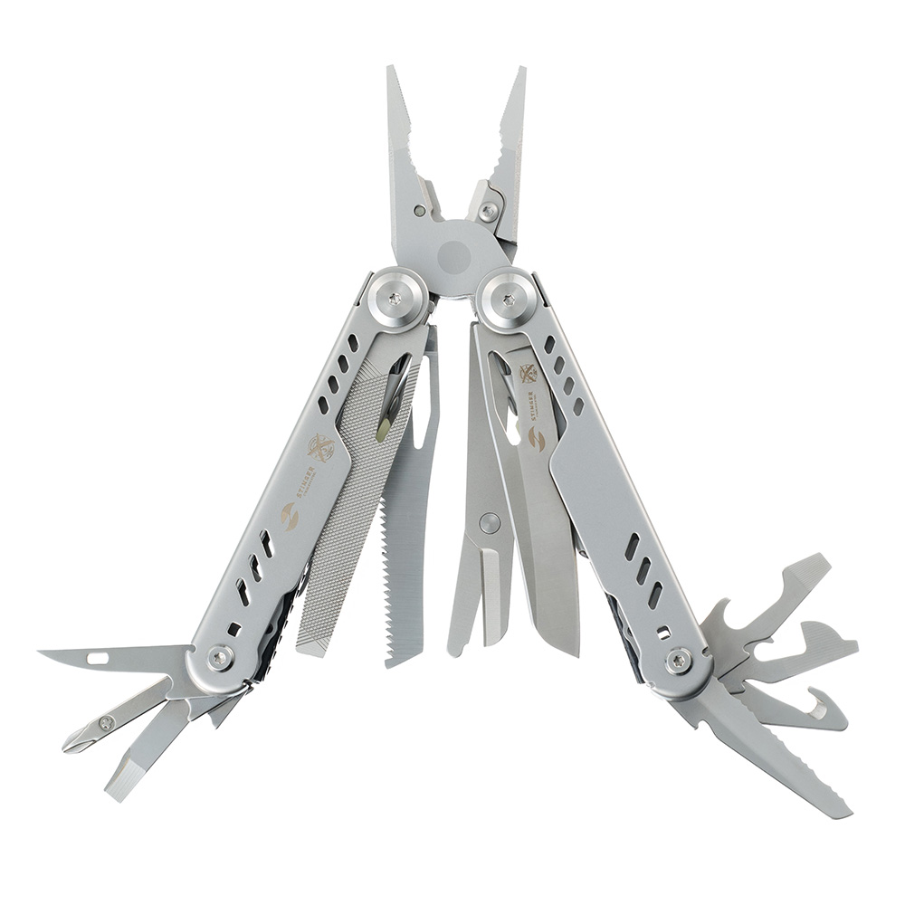 1. Острогубцы2. Плоскогубцы3. Кусачки сменные4. Лезвие с фиксатором клинка Liner Lock5. Ножницы6. Консервный нож с:7. – шлицевой мини-отверткой8. - инструментом для снятия изоляции9. Открывалка для бутылок с:10. – шлицевой отверткой среднего размера11. Лезвие серрейторное12. Крестовая отвертка13. Шило/кёрнер14. Нож для вскрытия коробок15. Напильник16. Линейка17. Шлицевая отвертка18. Пила19. Многоцелевой резак (стропорез, резак для автомобильного ремня20. Набор бит21. Люминесцентная накладка
