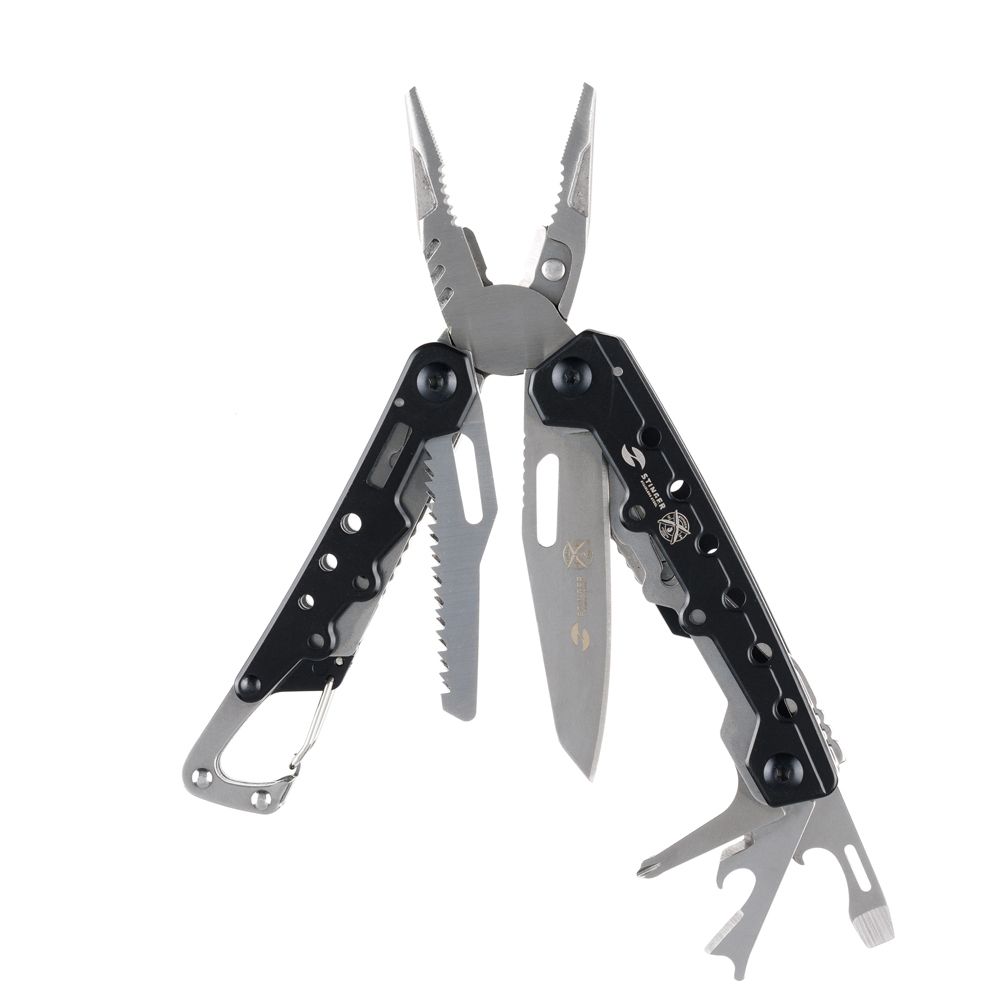 1. Острогубцы 2. Пассатижи3. Кусачки4. Лезвие большое плоское5. Пила по дереву6. Отвёртка крестовая7. Отвёртка шлицевая большая8. Инструмент для снятия изоляции9. Стропорез10. Открывалка для бутылок11. Консервный нож12. Карабин