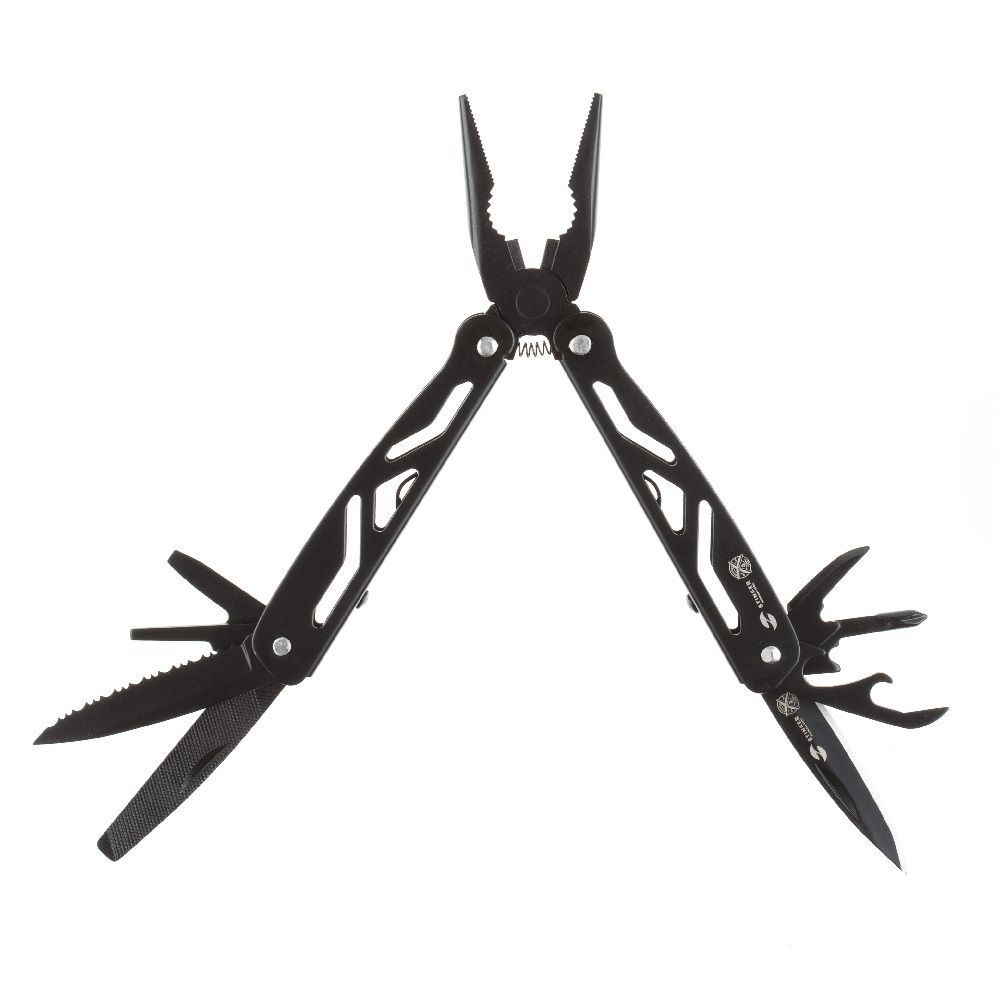 Количество функций - 12:- острогубцы;- пассатижи;- кусачки;- нож большой;- нож серрейторный;- напильник;- отвертка крестовая;- отвертка шлицевая средняя;- отвертка шлицевая маленькая;- открывалка для бутылок;- консервный нож;- шило.