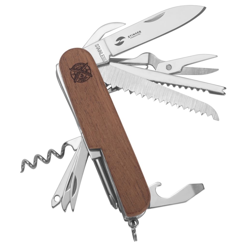 Нож перочинный STINGER имеет 15 функций:1. Большое лезвие2. Пила по дереву3. Инструмент для чистки рыбы с:4. - Инструментом для извлечения рыболовного крючка5. Ножницы6. Консервный нож7. Открывалка для бутылок с:8. - Отверткой9. Крестовая отвертка10. Ледокол11. Пилка для ногтей с:12. - Инструментом по уходу за ногтями13. Игла14. Штопор15. Кольцо для ключей